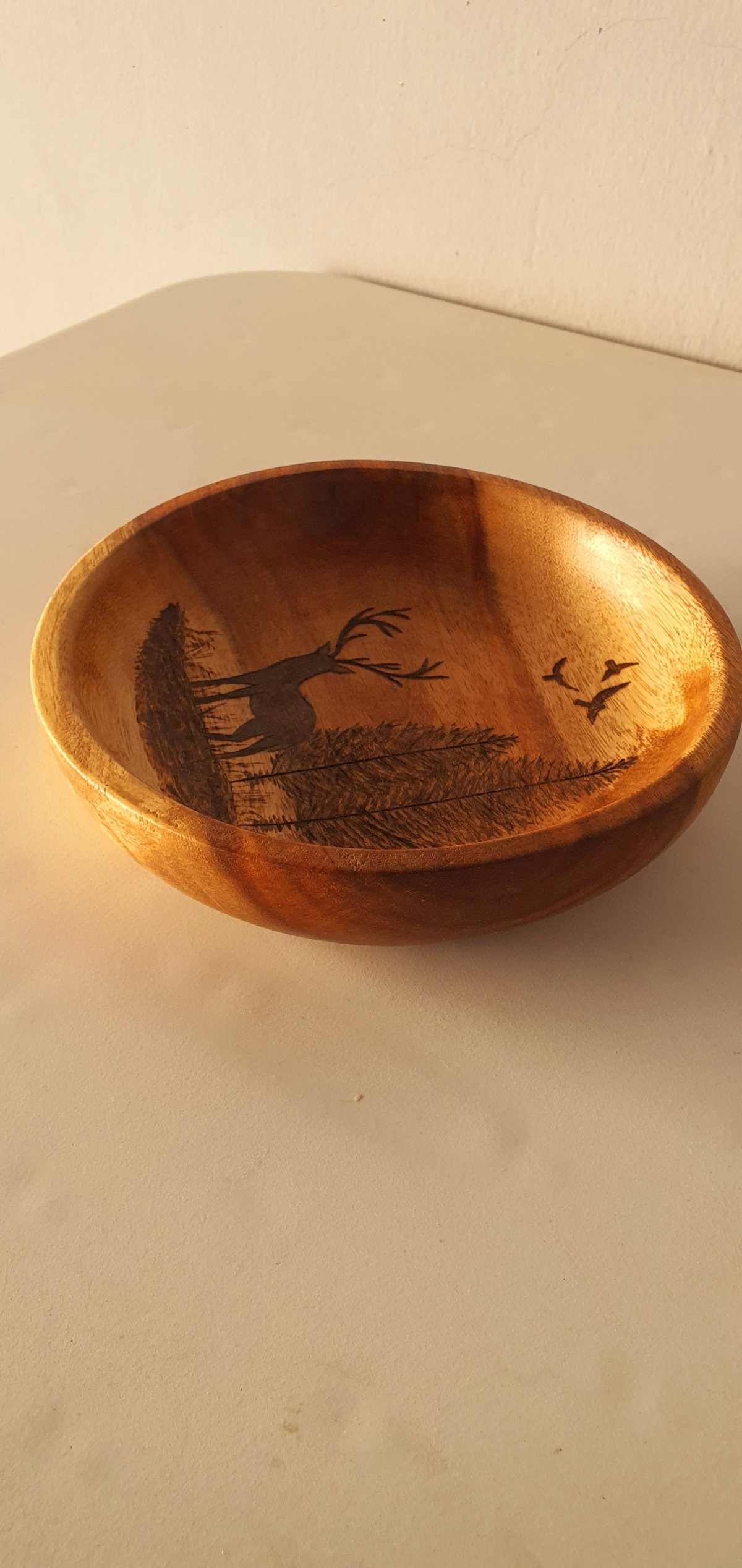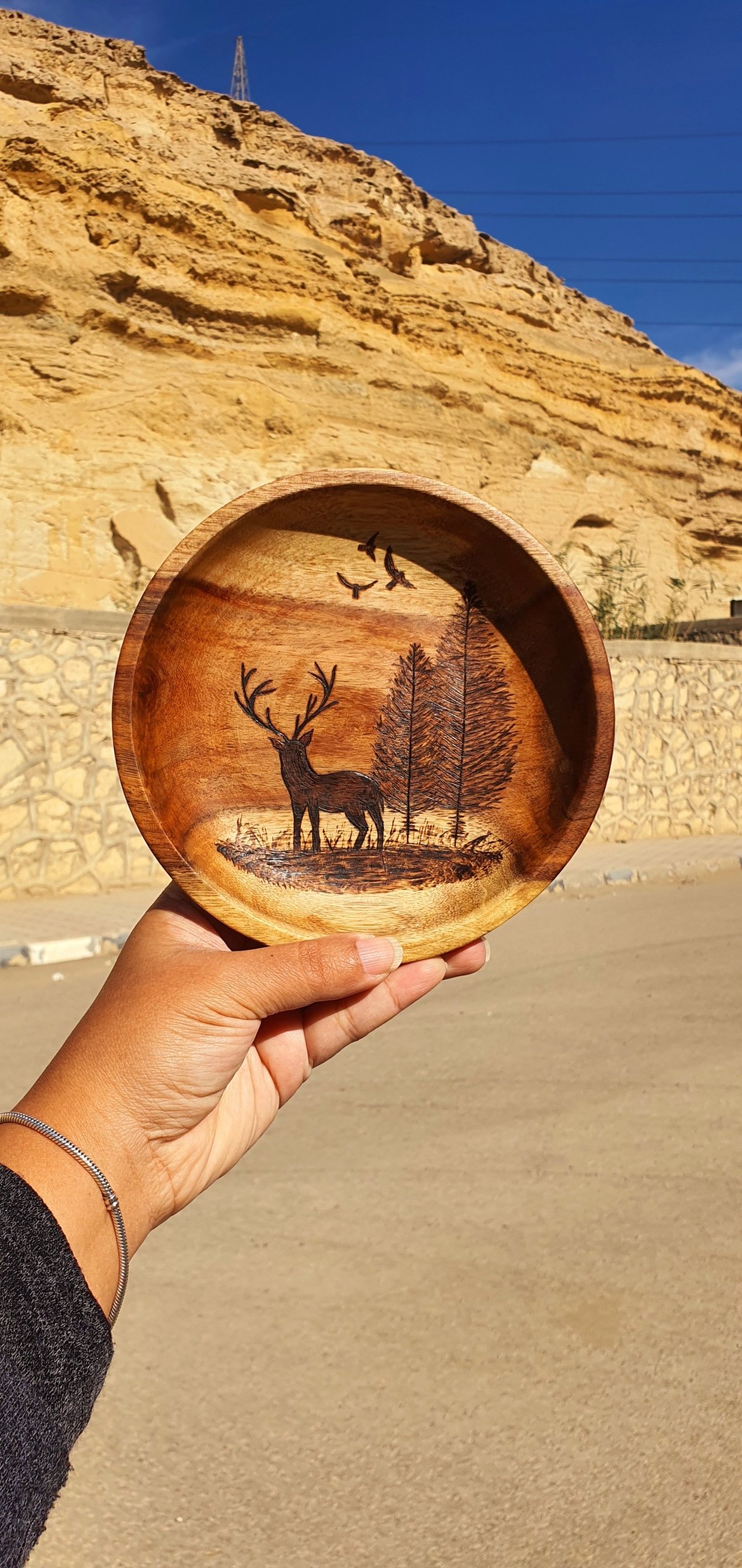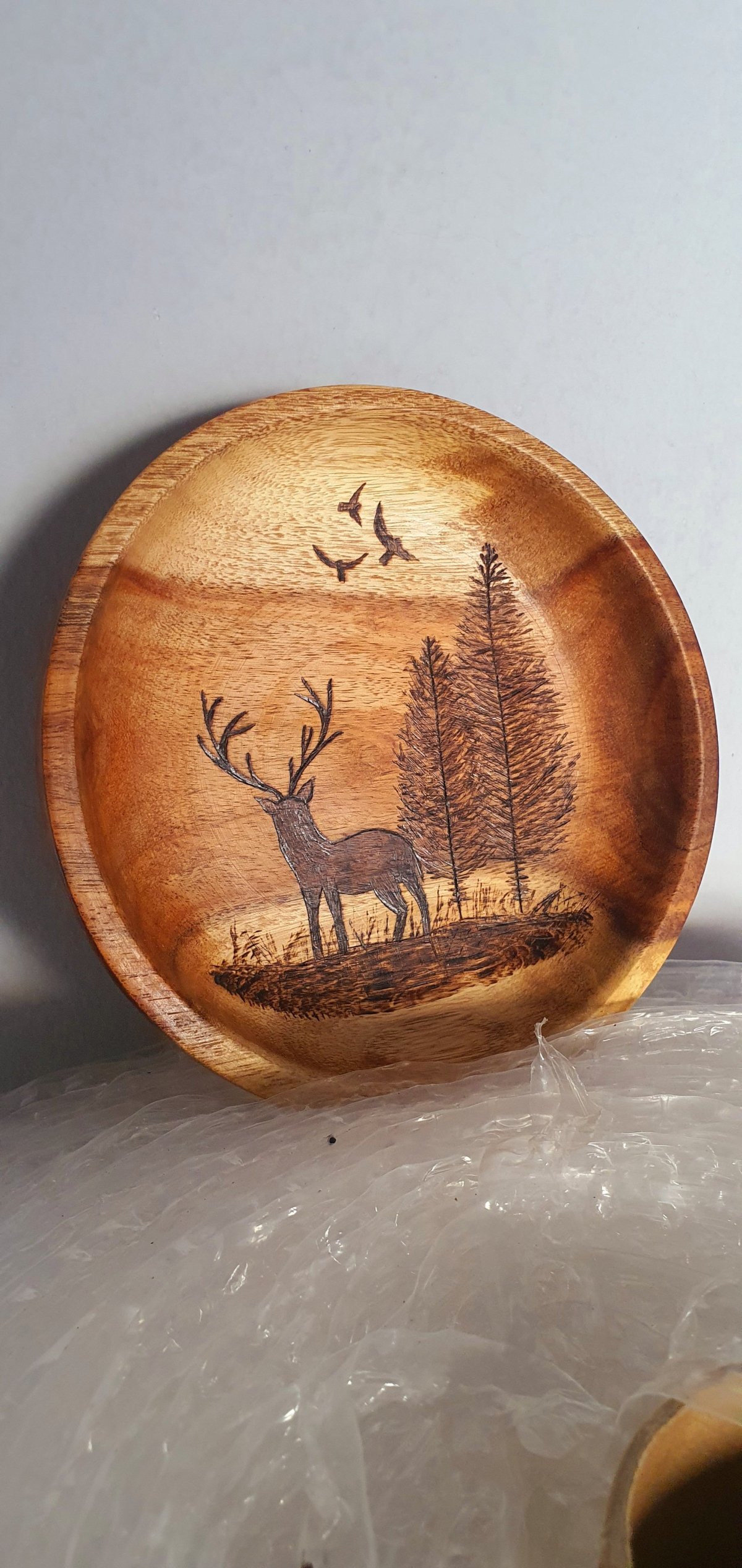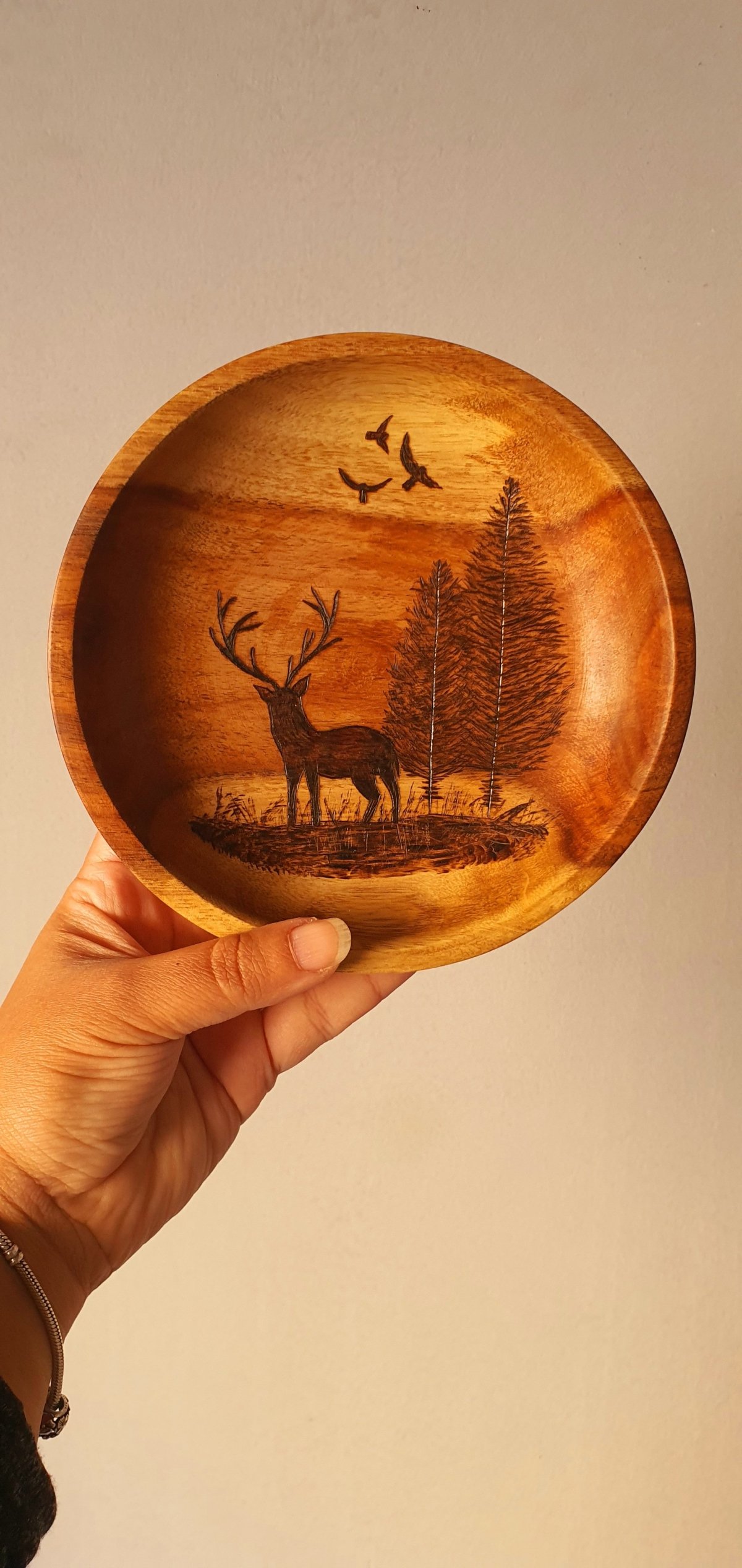 طبق من خشب السرسوع بتصميم فريد نفذناه بفن الحرق اليدوي يمكن استخدامه لتوزيع الحلوى في الأعياد ويمكن تعليقه على الحائط الأبعاد: قطر ١٧ سم