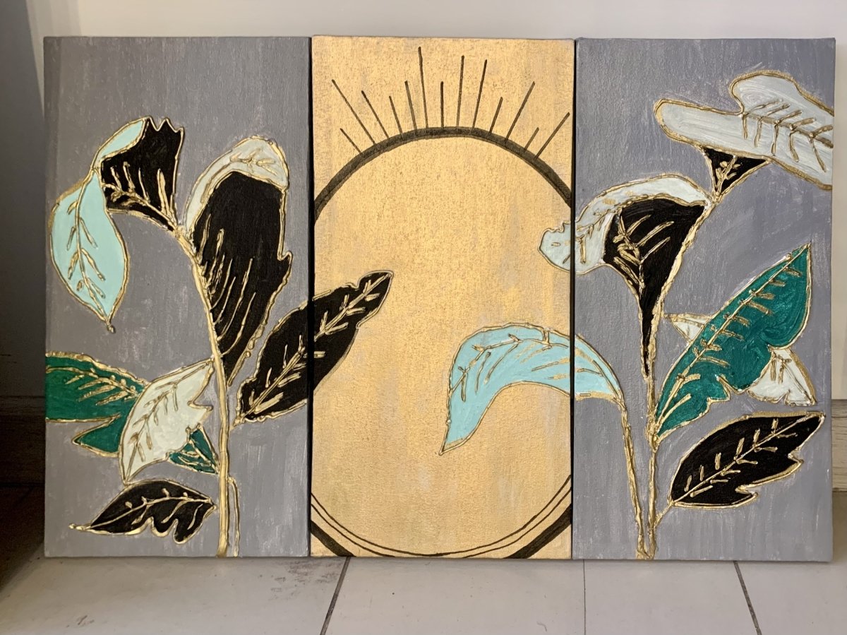 تابلوة اكريليك رسم بارز 3 قطع شكل اوراق شجر مكملة لبعضها مقاسها 40* 60 سم