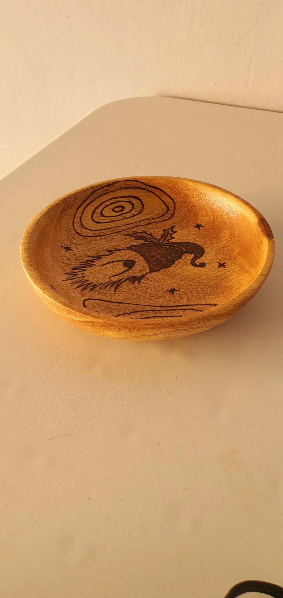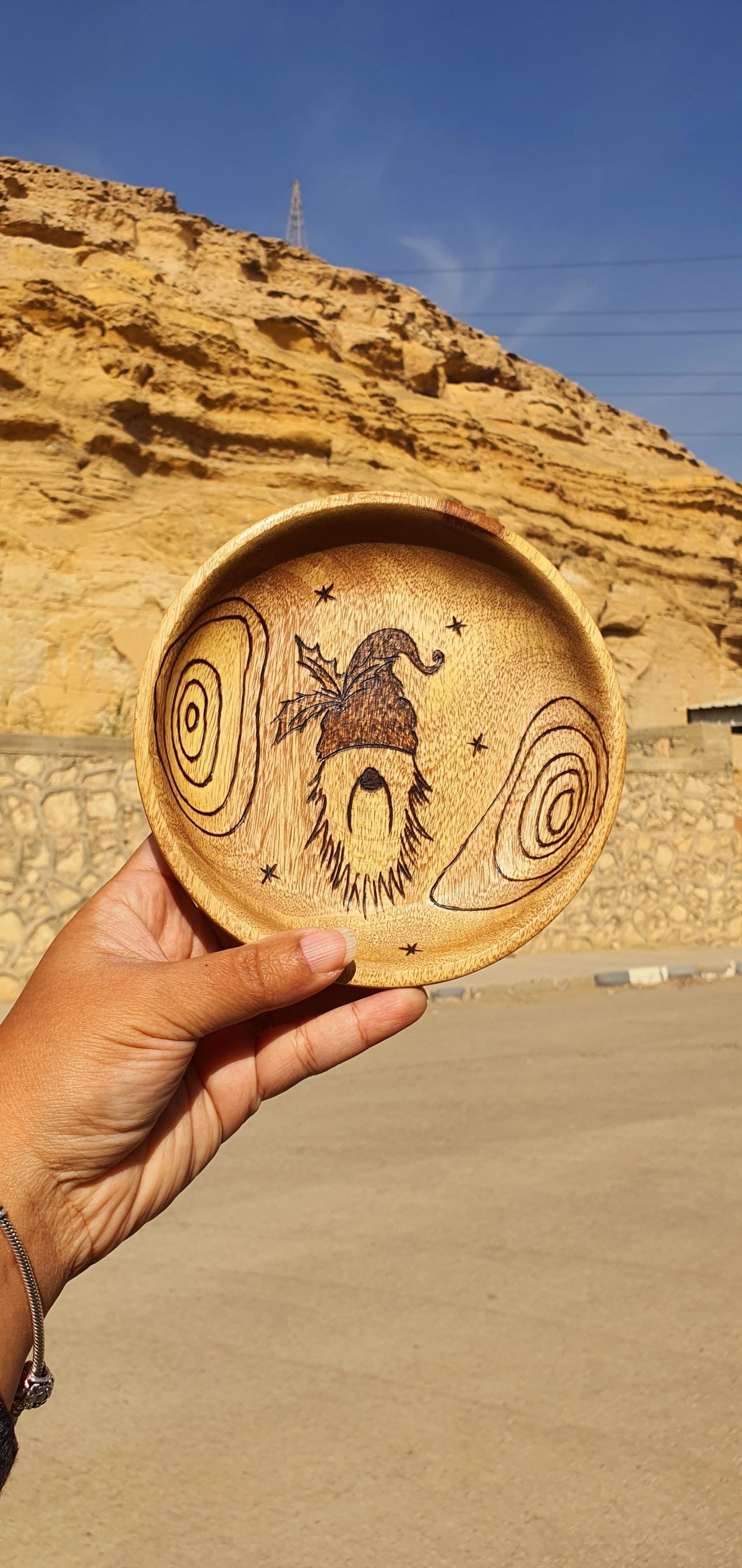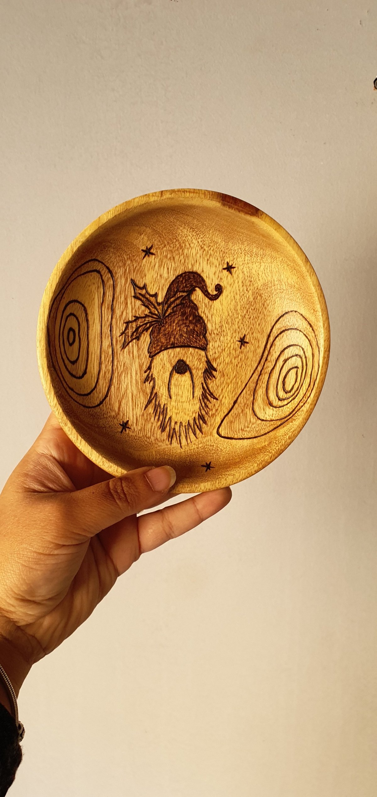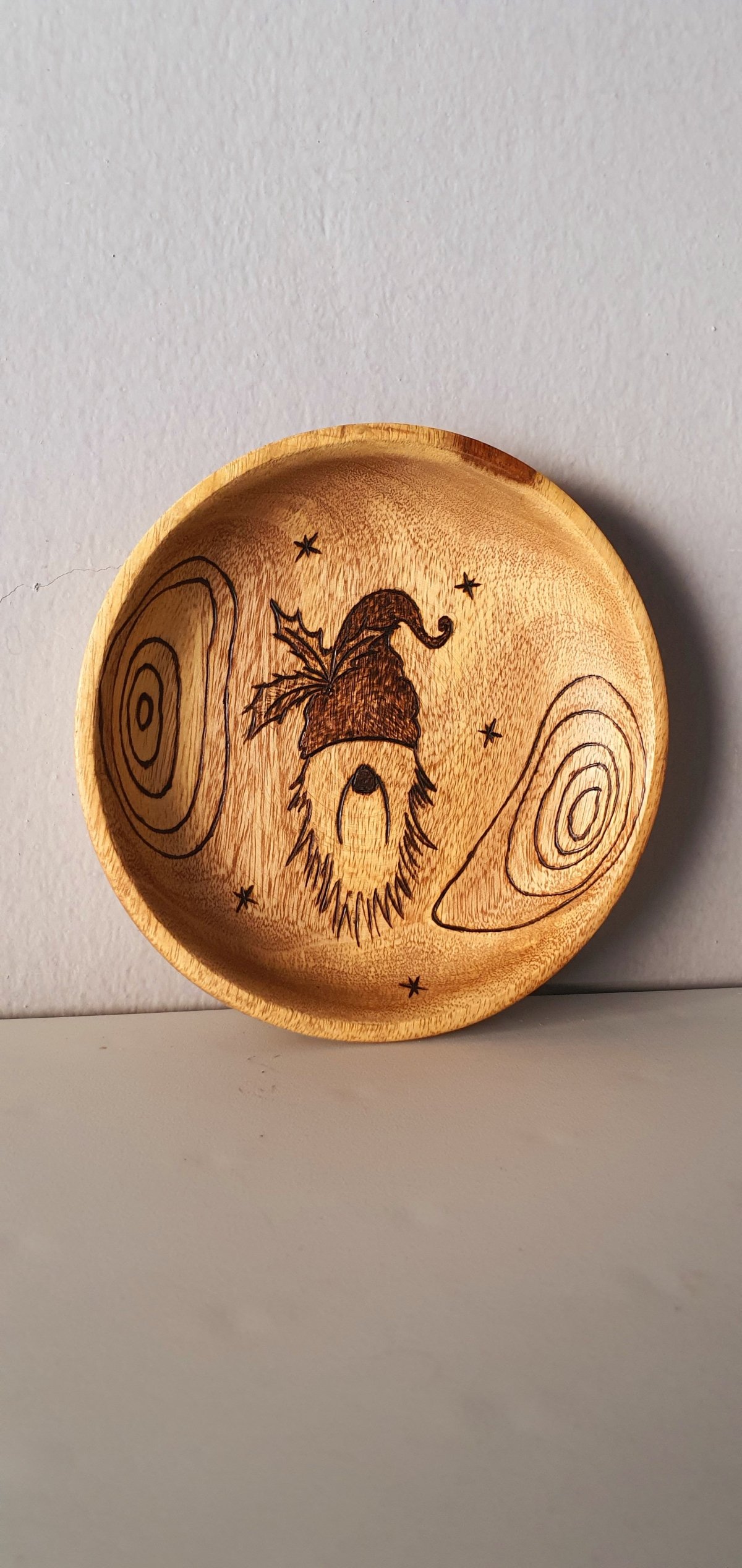 طبق من خشب السرسوع بتصميم فريد نفذناه بفن الحرق اليدوي يمكن استخدامه لتوزيع الحلوى في الأعياد ويمكن تعليقه على الحائط الأبعاد: قطر ١٥ سم