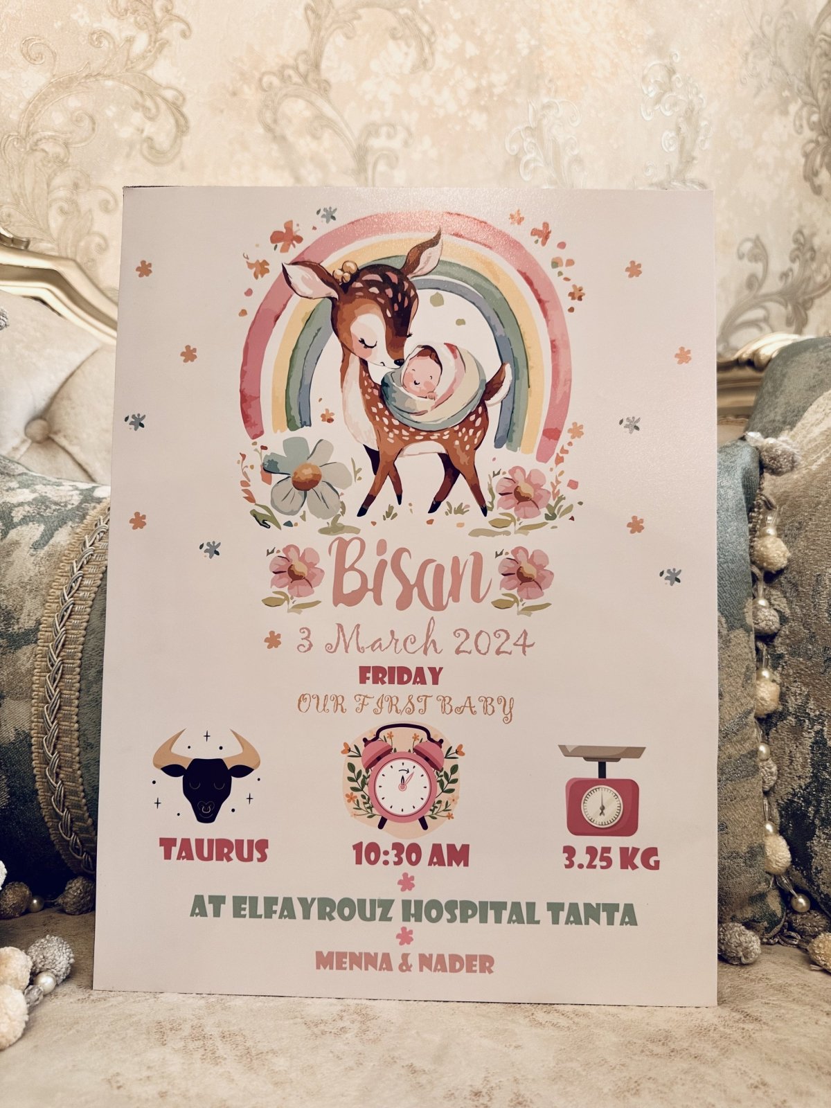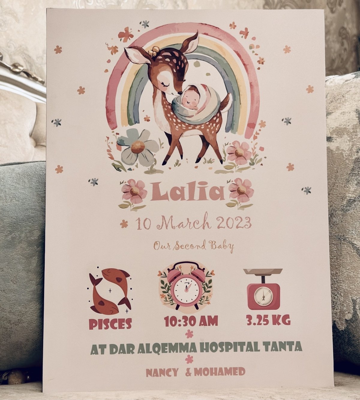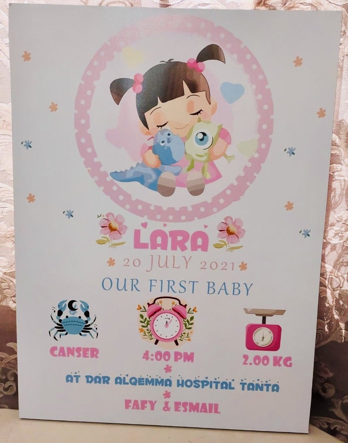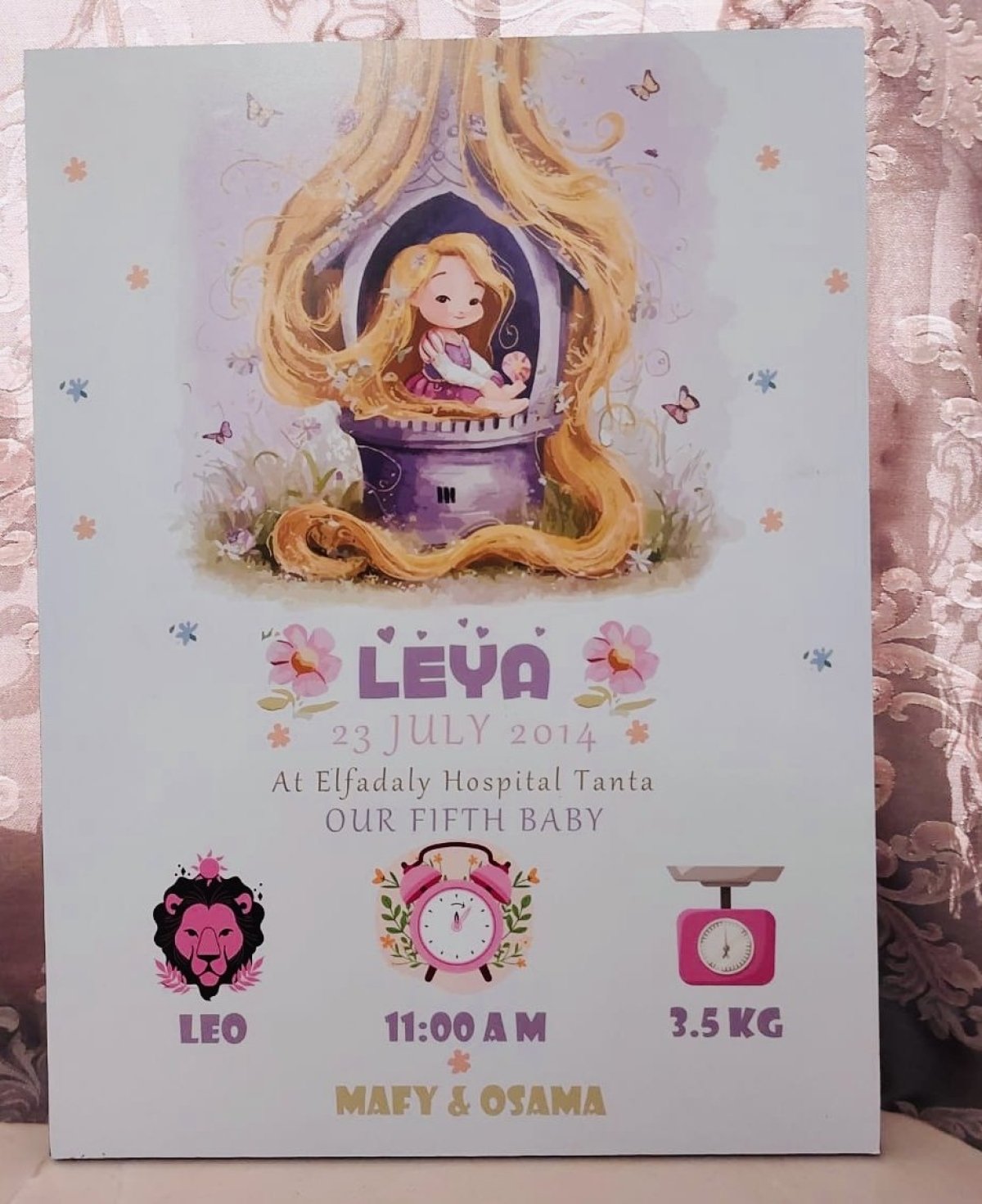 تابلوه يرسم خصيصا لذكريات الولاده للاطفال يحتوي علي: اسم الطفل يوم الولاده البرج اسم الاباء وزن الولاده ساعه للولاده يمكن تنفيذ اي تصميم متاح تحديد الاشكال و الالوان مثل قطه غزاله اسد وحيد القرن حلوي ….. مقاس اللوحه الخشبيه ٣٠سم في ٤٠ سم في ١٢ مل سمك مع طبقه حمايه للالوان من الماء
