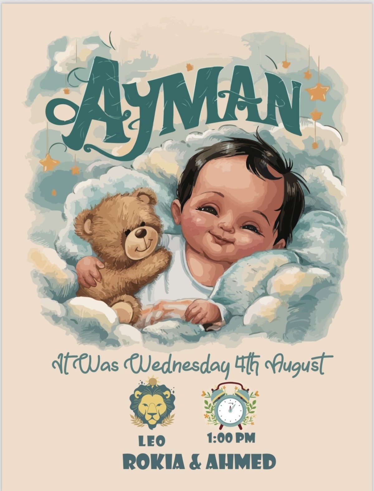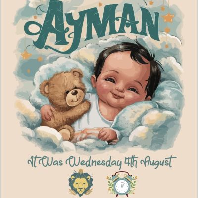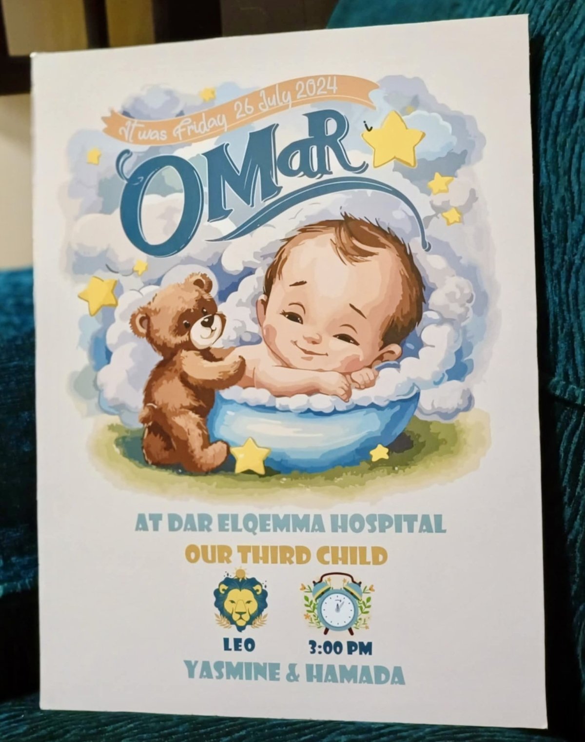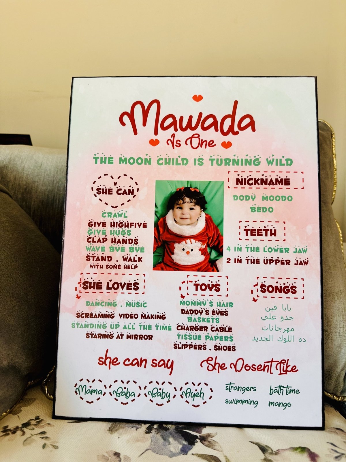 تابلوه يرسم خصيصا لذكريات الولاده للاطفال يحتوي علي: اسم الطفل يوم الولاده البرج اسم الاباء وزن الولاده ساعه للولاده يمكن تنفيذ اي تصميم متاح تحديد الاشكال و الالوان مثل قطه غزاله اسد وحيد القرن حلوي ….. مقاس اللوحه الخشبيه ٣٠سم في ٤٠ سم في ١٢ مل سمك مع طبقه حمايه للالوان من الماء
