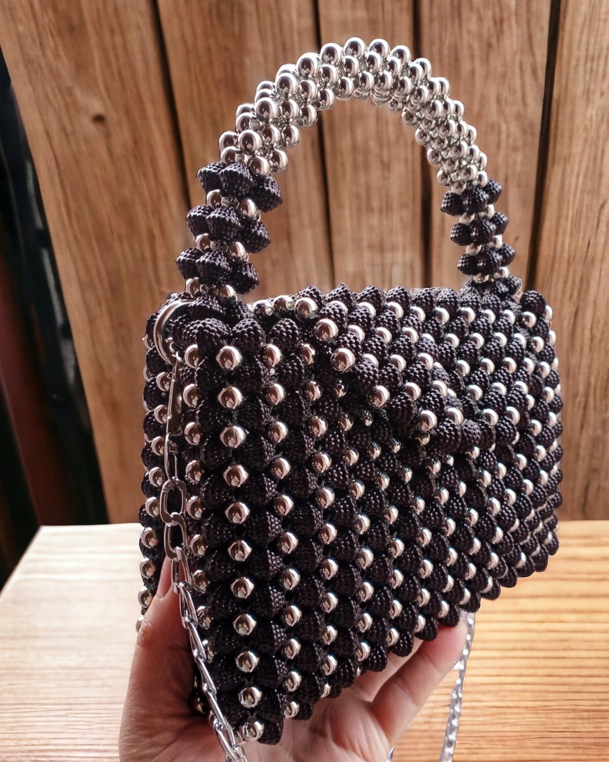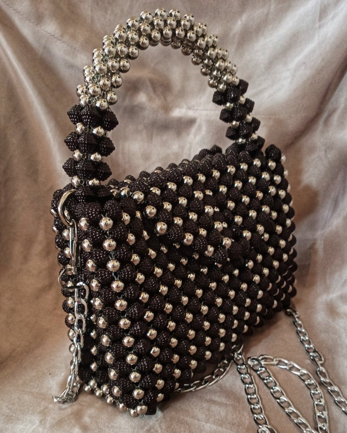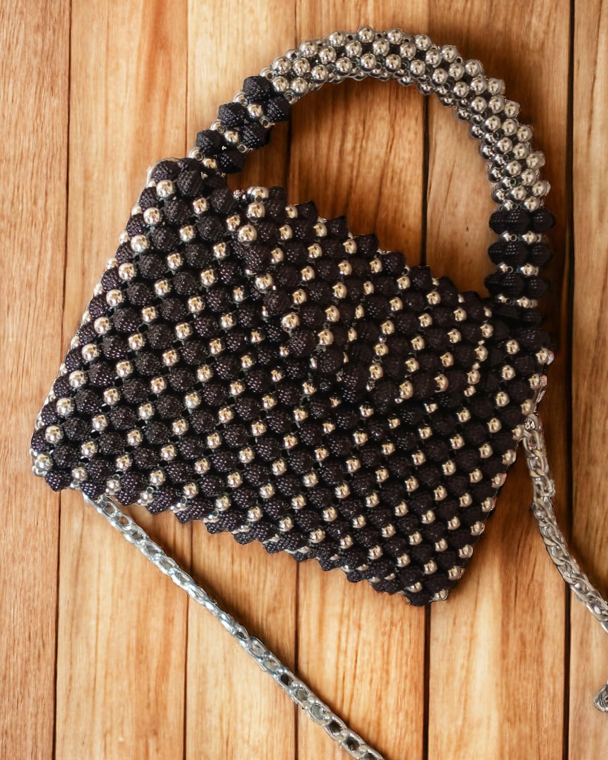 شنطه صنعت يدويا من الخرز فتافيت السكر واللولي السلفر مزوده بدراع كروس ويد صغيره مقاس ٢٠/15
