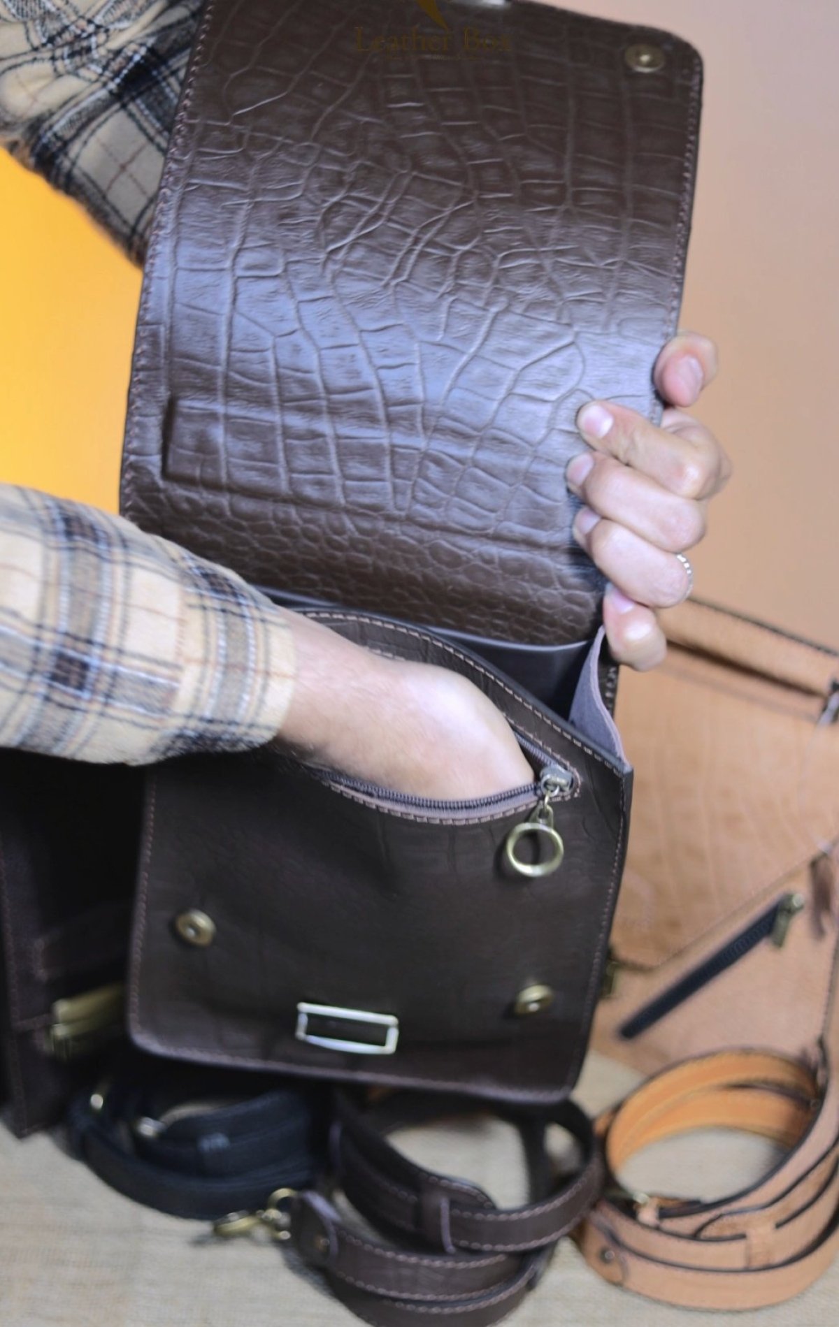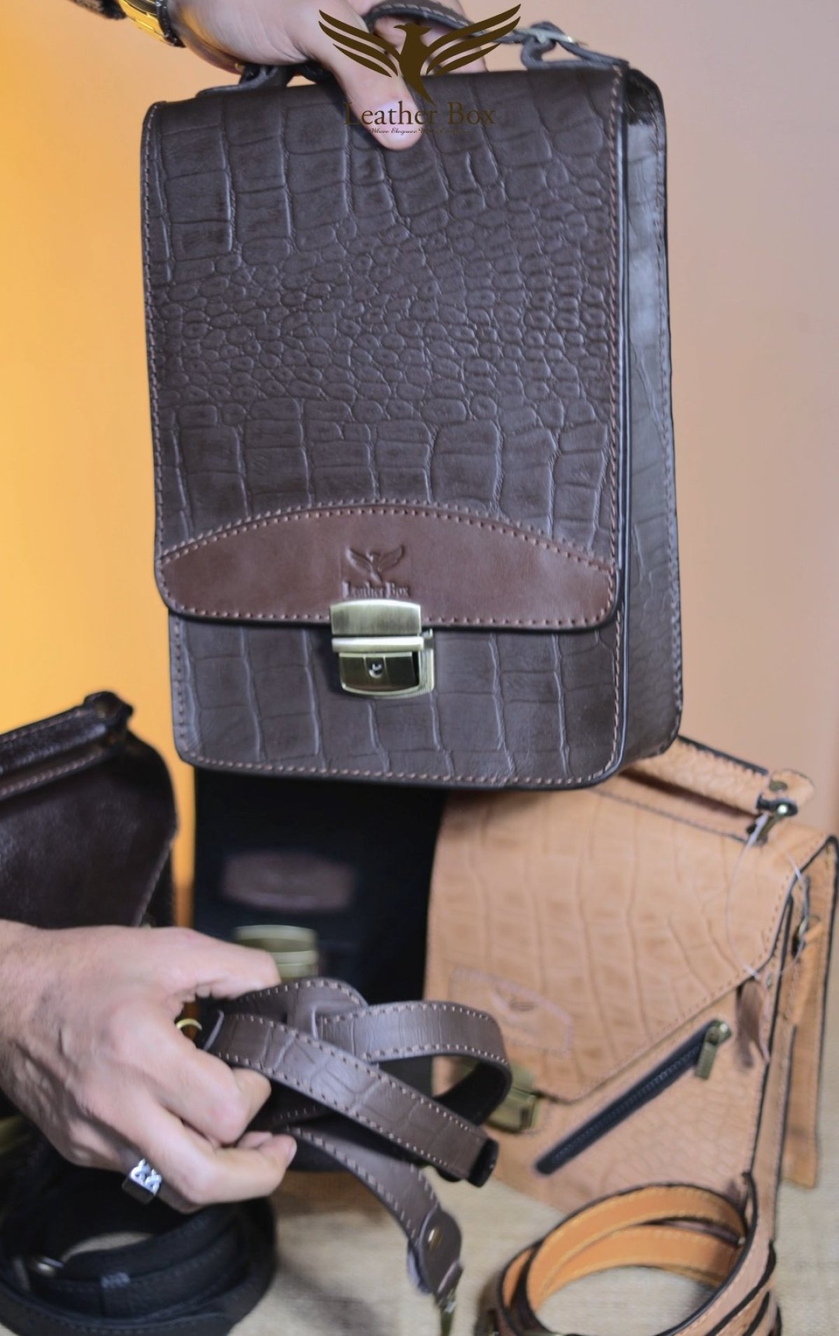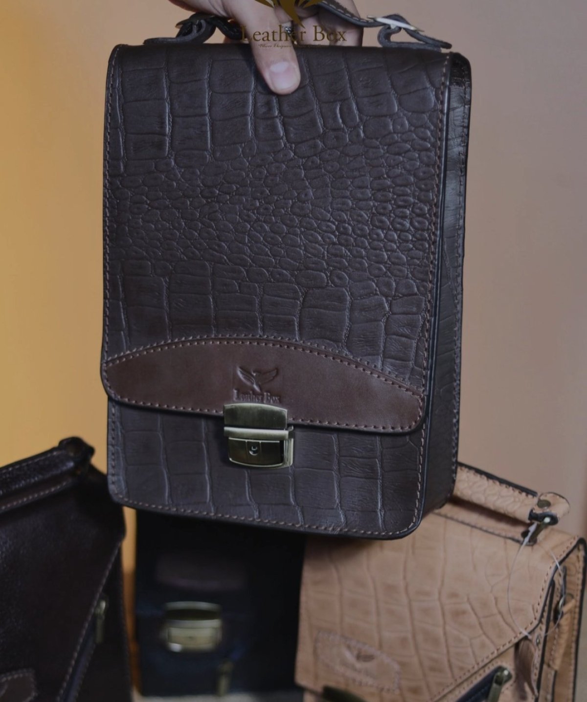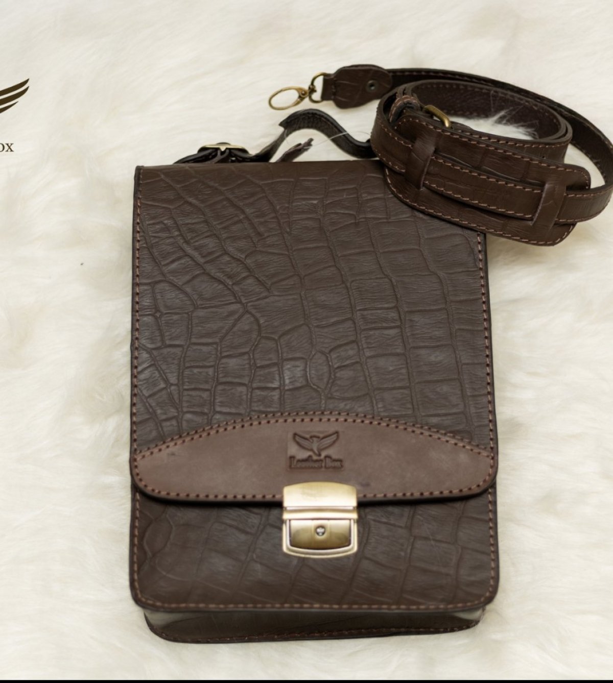 شنطه نوت جلد طبيعي بقرى طابعه تمساح مقاس 30 طول 22 عرض حزام جلد طبيعي قفل نحاس بمفتاح لون بنى فقط