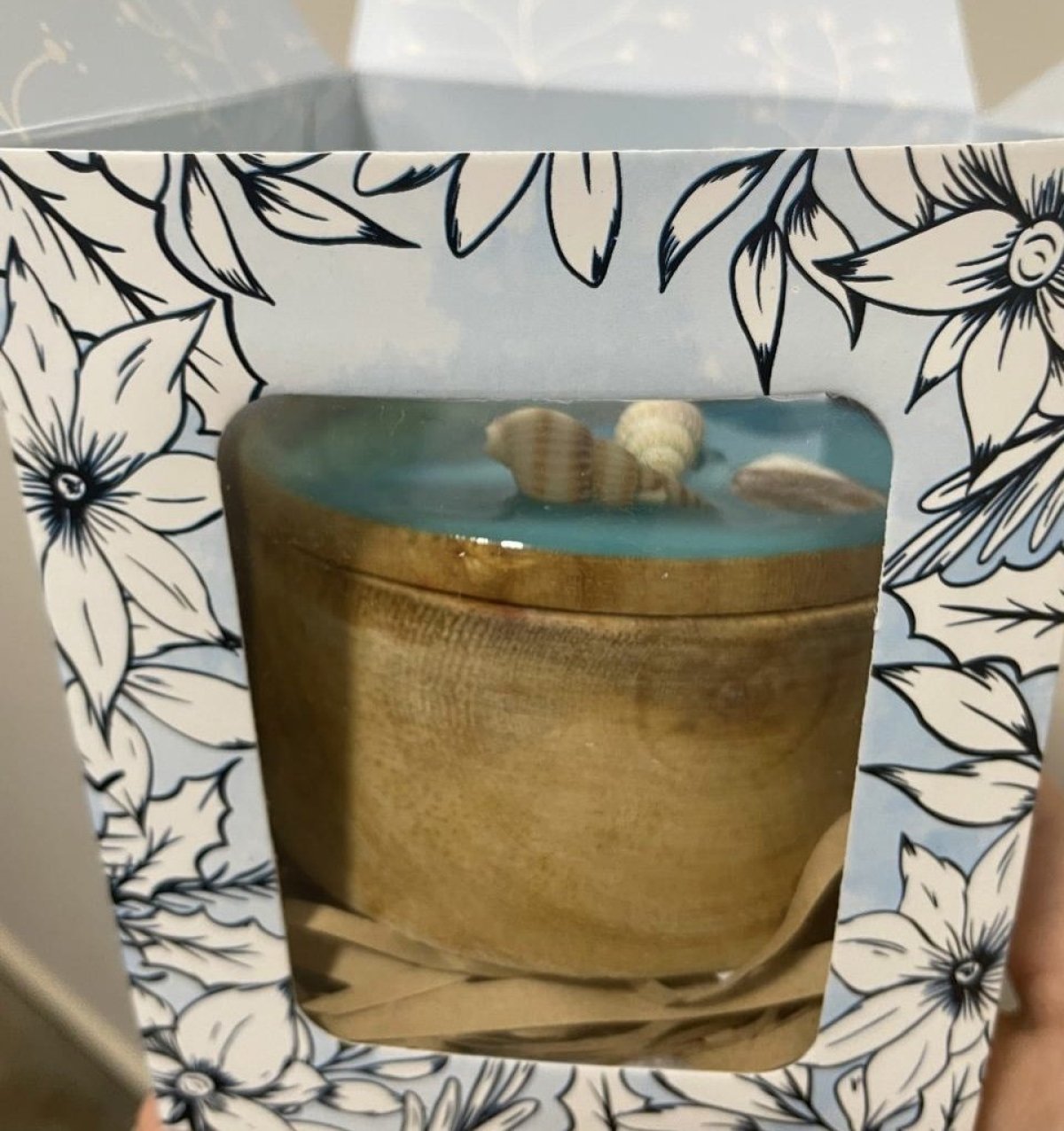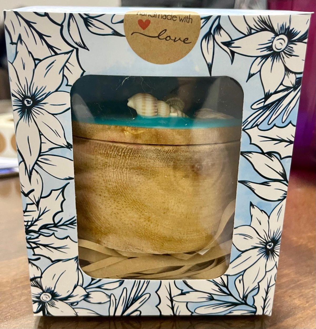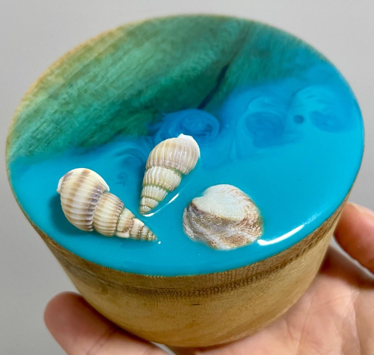 علبة خشب مُطعمة بطبقة من الريزن ⭐️ تصميم موج البحر مع قواقع طبيعية ⭐️ يمكن استخدام العلبة كديكور للمنزل، حافظة للحُلى والمجوهرات، وايضًا كعُلبة للشمع