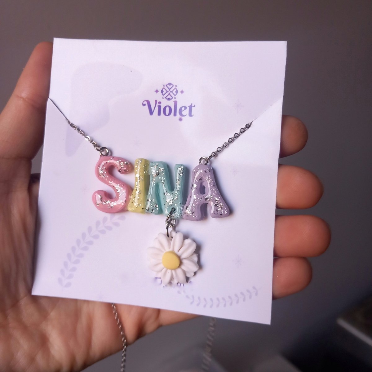 سلسلة بالاسم (تصميم ديزي) مصنوعة من الصلصال الحراري بألوان الباستيل ومزينه بوردة الربيع البيضاء. مطليه بطبقة من الريزن من الجهتين للحماية وإضفاء مظهر لامع.مع أجزاء من المعدن مصنوعة من الاستانلس ستيل غير قابلة للصدأ ولا تسبب حساسية. الطول (٤٥سم) "متاح التنفيذ بألوان وتصميم من اختياركم "