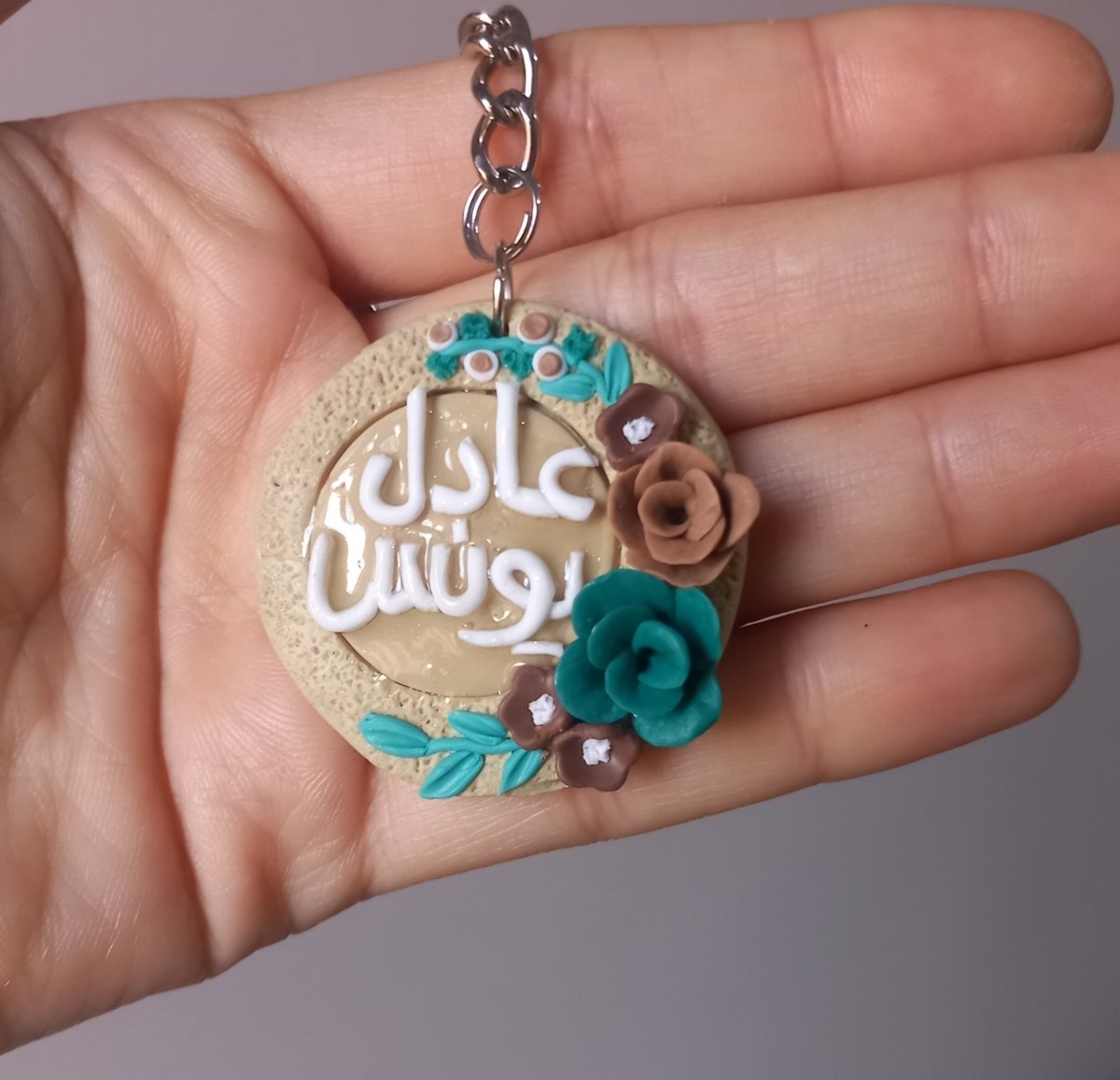 ميدالية مفاتيح بالاسم مصنوعة من الصلصال الحراري و مطليه بطبقة من الريزن من الجهتين للحماية وإضفاء مظهر لامع. "متاح تنفيذ بألوان وتصميم من اختياركم "