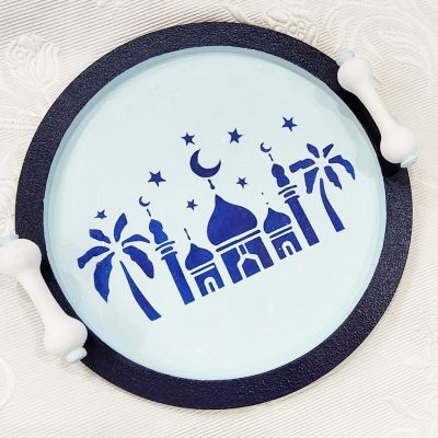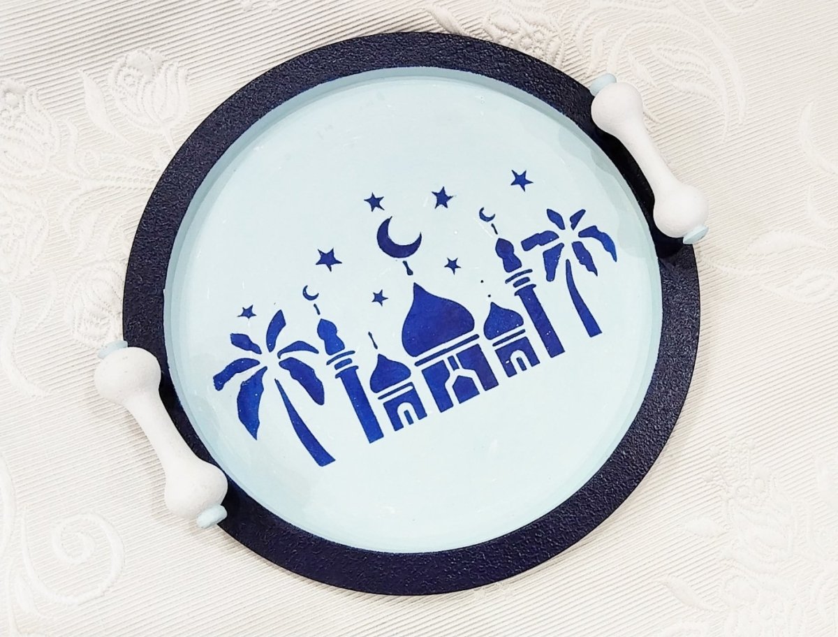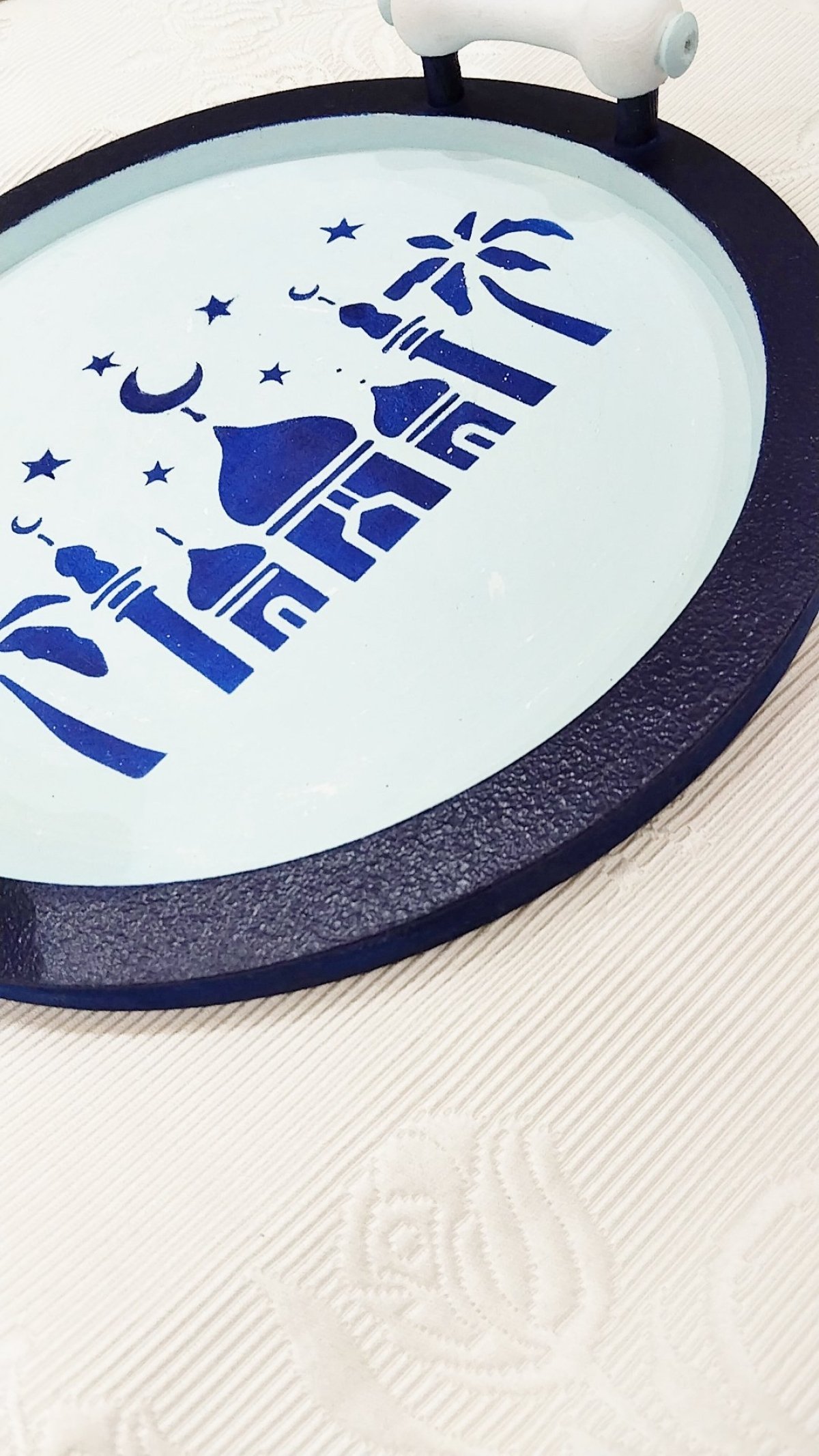صينية دائرية من الخشب تستخدم للتقديم او كقطعة ديكورية لرمضان