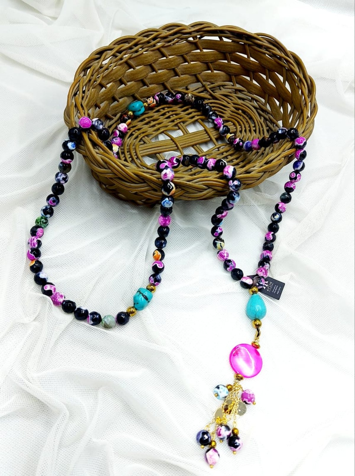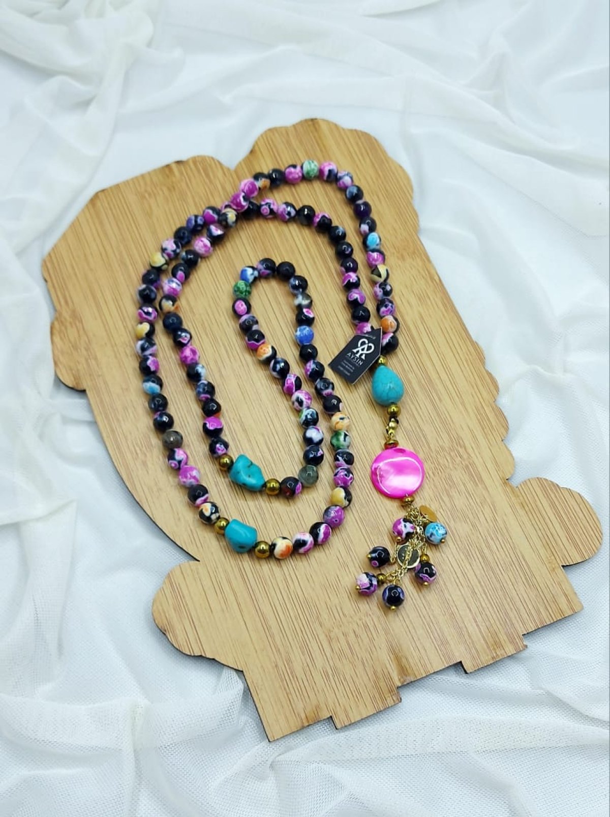 مسبحه ٩٩ والديزاين عقد طويل من احجار العقيق وفواصل هيماتيت وسلاسل دهب صينى جولد