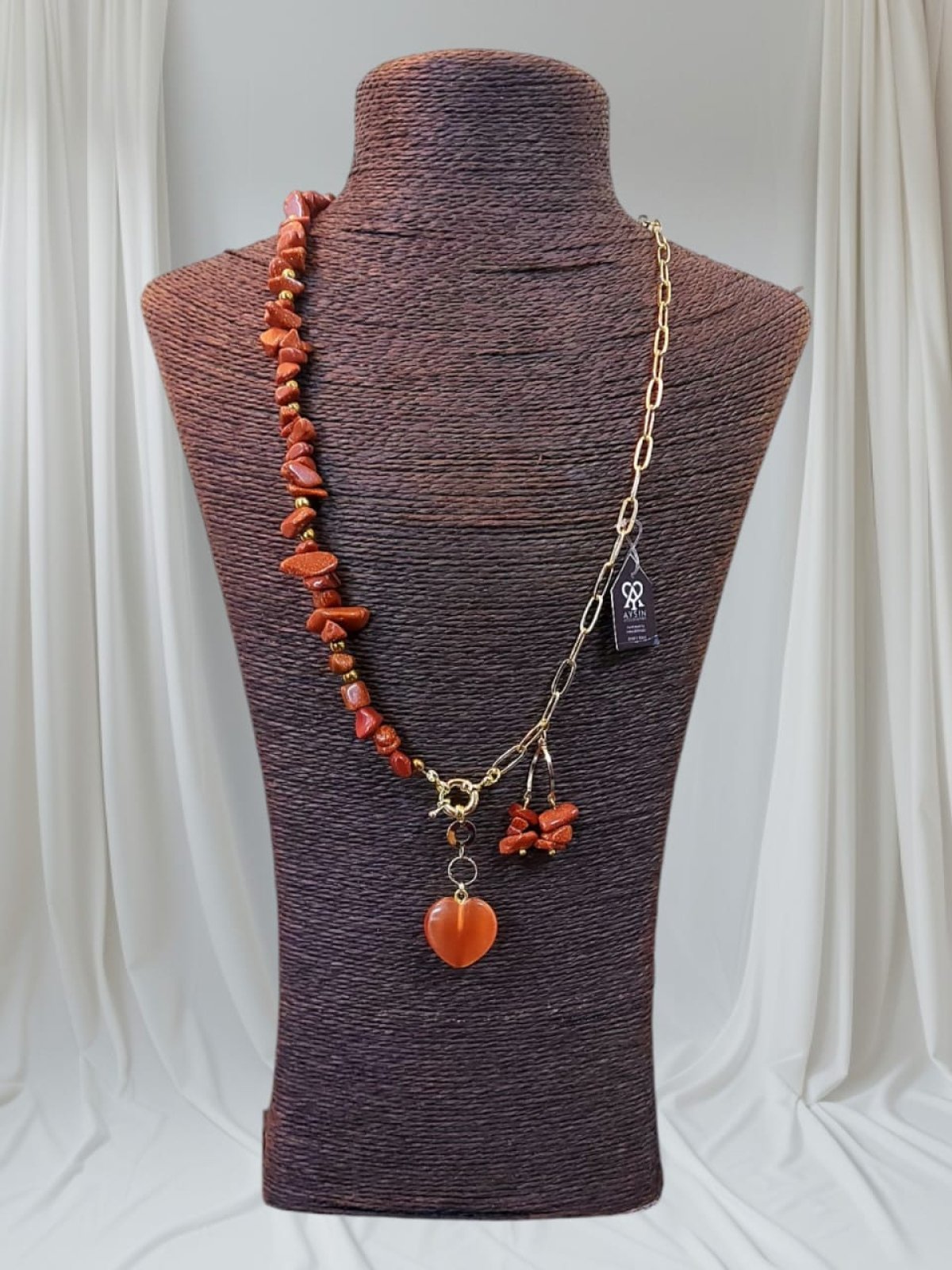 طقم عقد واسوره وحلق العقد من كسر احجار العقيق ونص سلسله من الدهب الصينى الجولد عالى الجوده ودلايه من احجار العقيق وجميع السلاسل والحلق والاقفال والحلقات دهب صينى جولد لا يتغير لونها طوله ٦٥ سم ومتاح تنفيذه بأى طول متاح كل قطعه منفصله