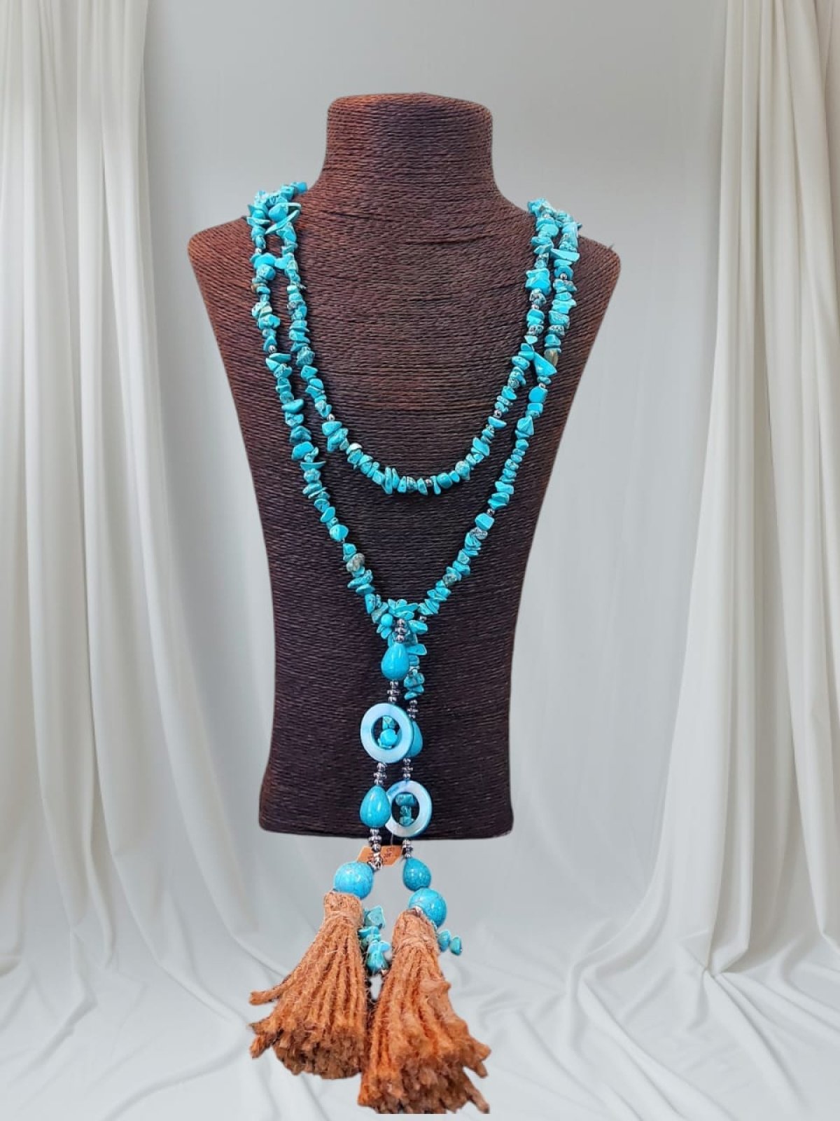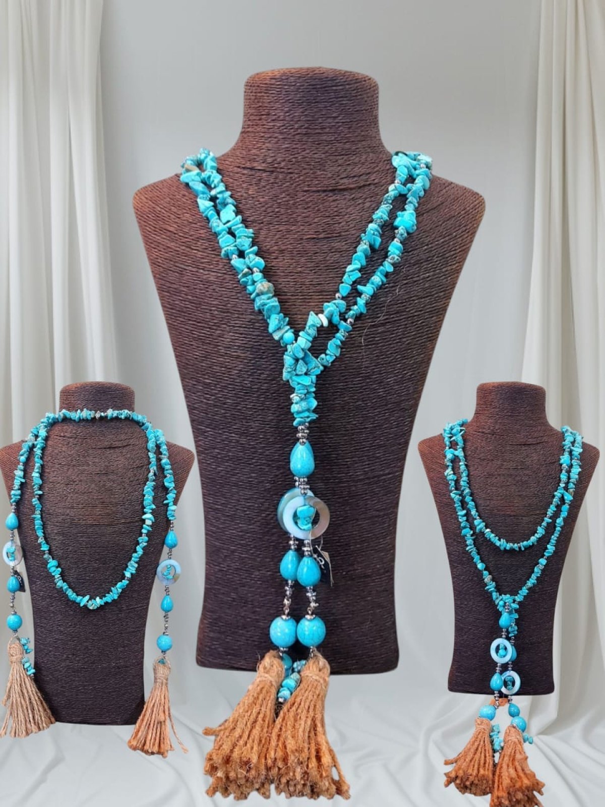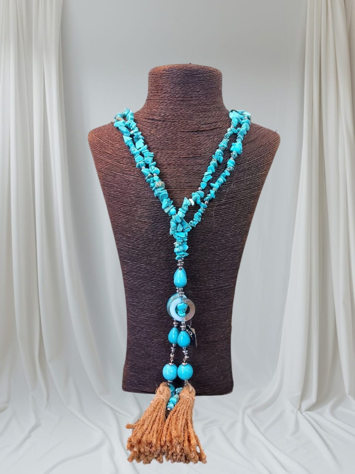 طقم عقد واسوره وحلق العقد ديزاين اسكارف من احجار الفيروز بيتلبس بكذا طريقه وممكن حزام كمان انت بتتحكمى فى شكله لانه قطعه واحده طولها اكتر من متر مطعم بفواصل هيماتيت وصدف وشراشيب من الخيش متاح كل قطعه وحدها