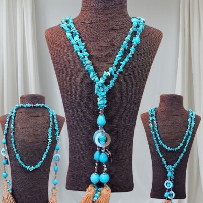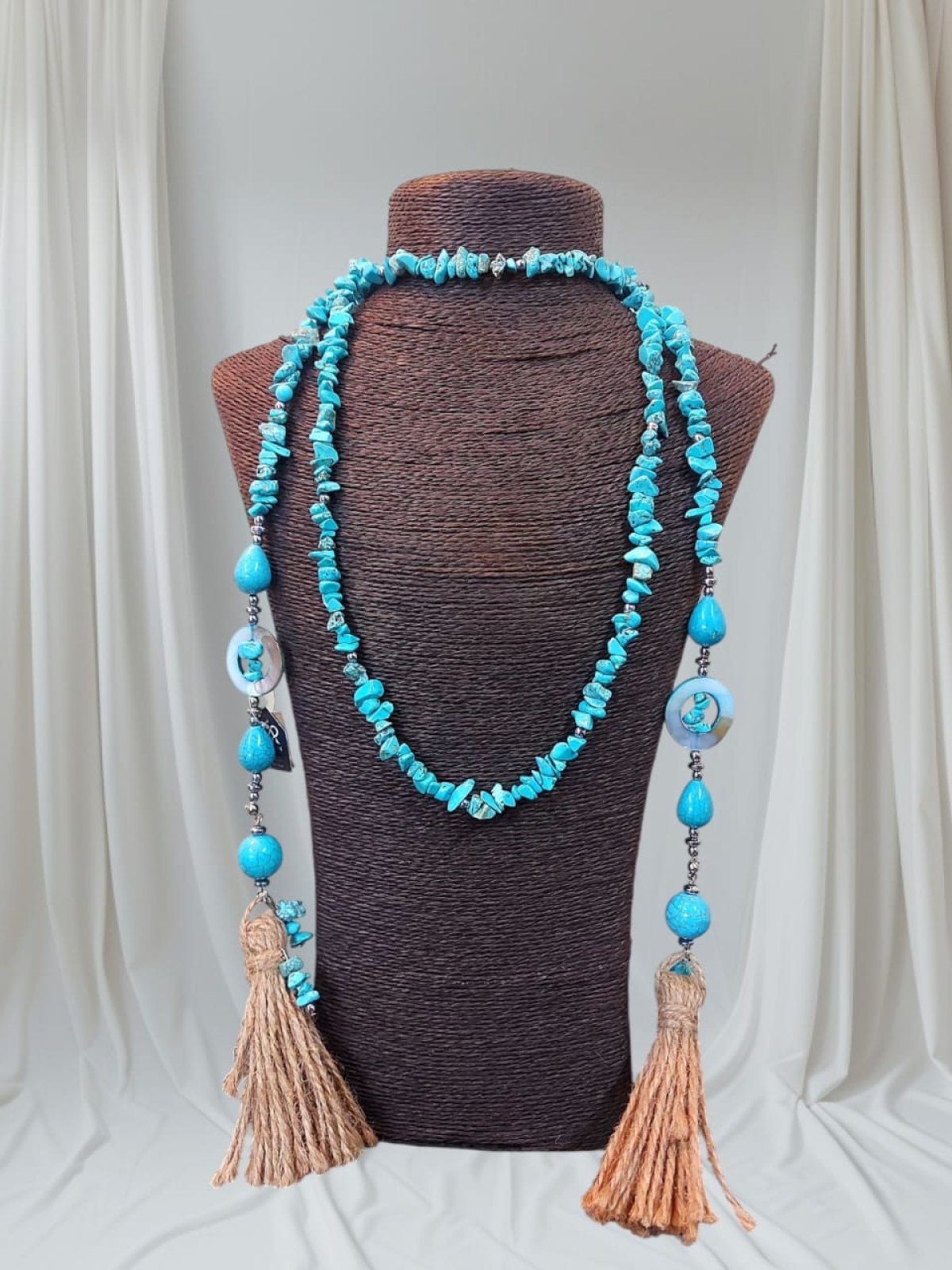 طقم عقد واسوره وحلق العقد ديزاين اسكارف من احجار الفيروز بيتلبس بكذا طريقه وممكن حزام كمان انت بتتحكمى فى شكله لانه قطعه واحده طولها اكتر من متر مطعم بفواصل هيماتيت وصدف وشراشيب من الخيش متاح كل قطعه وحدها