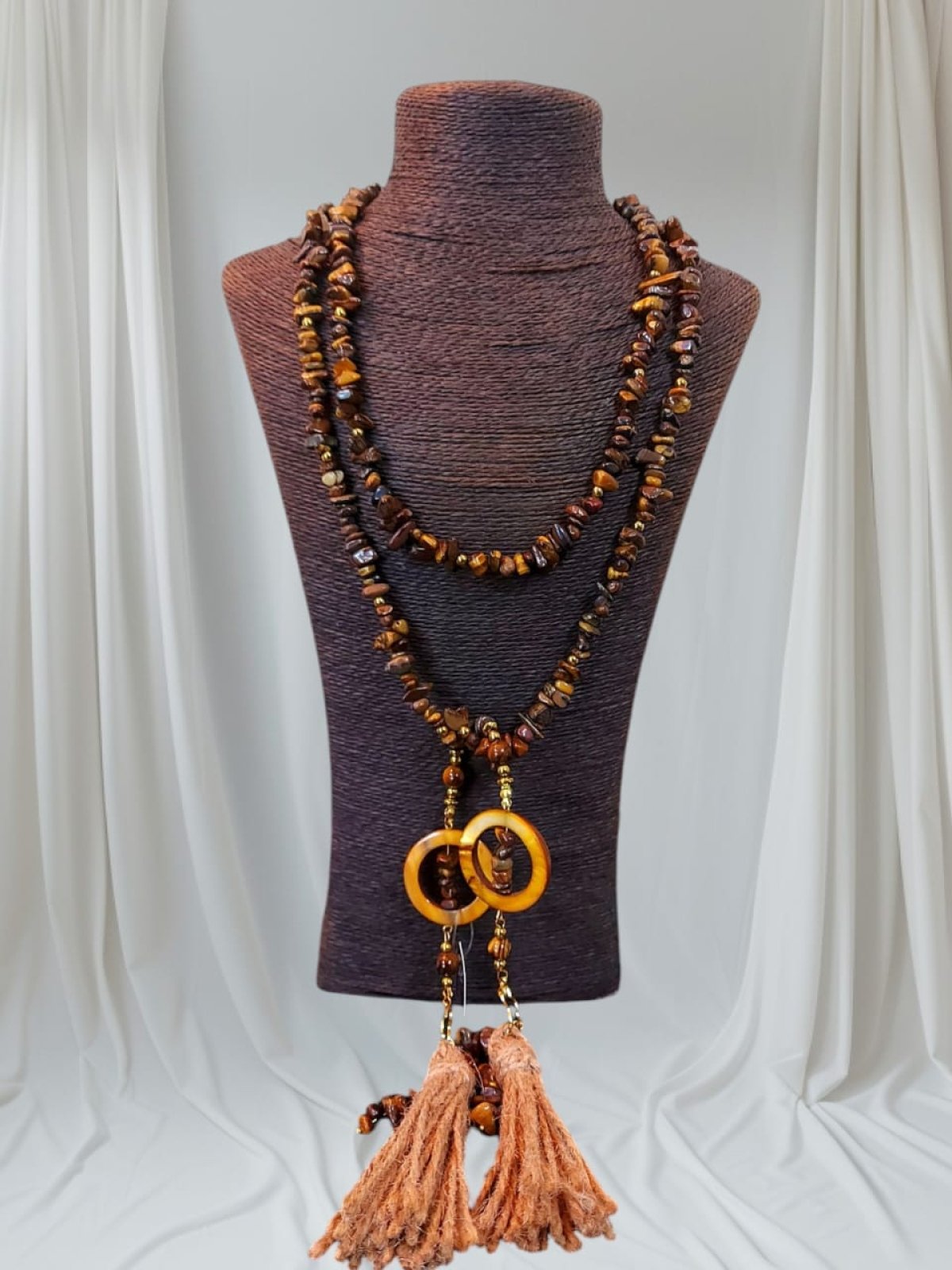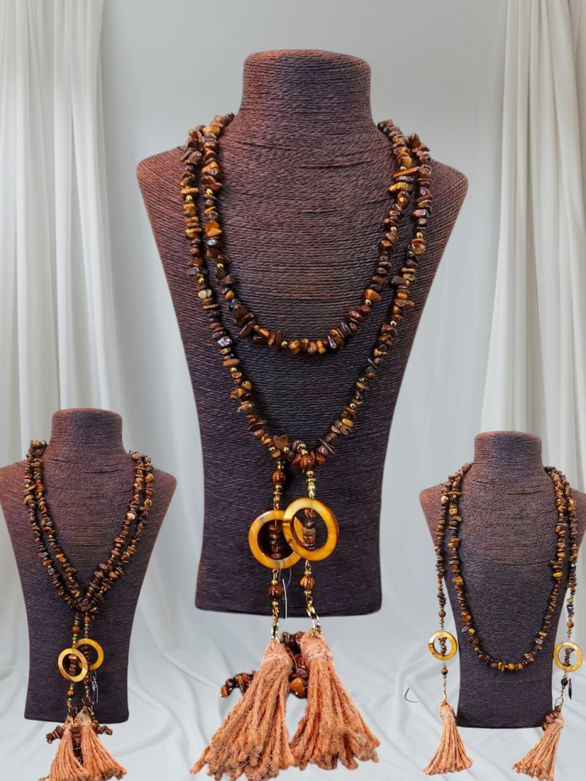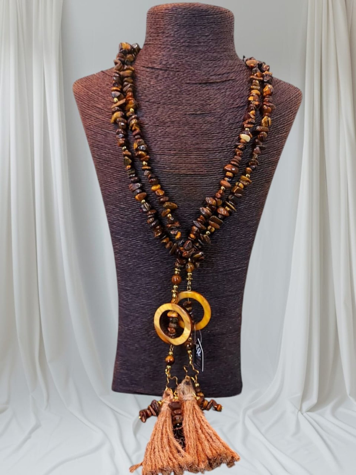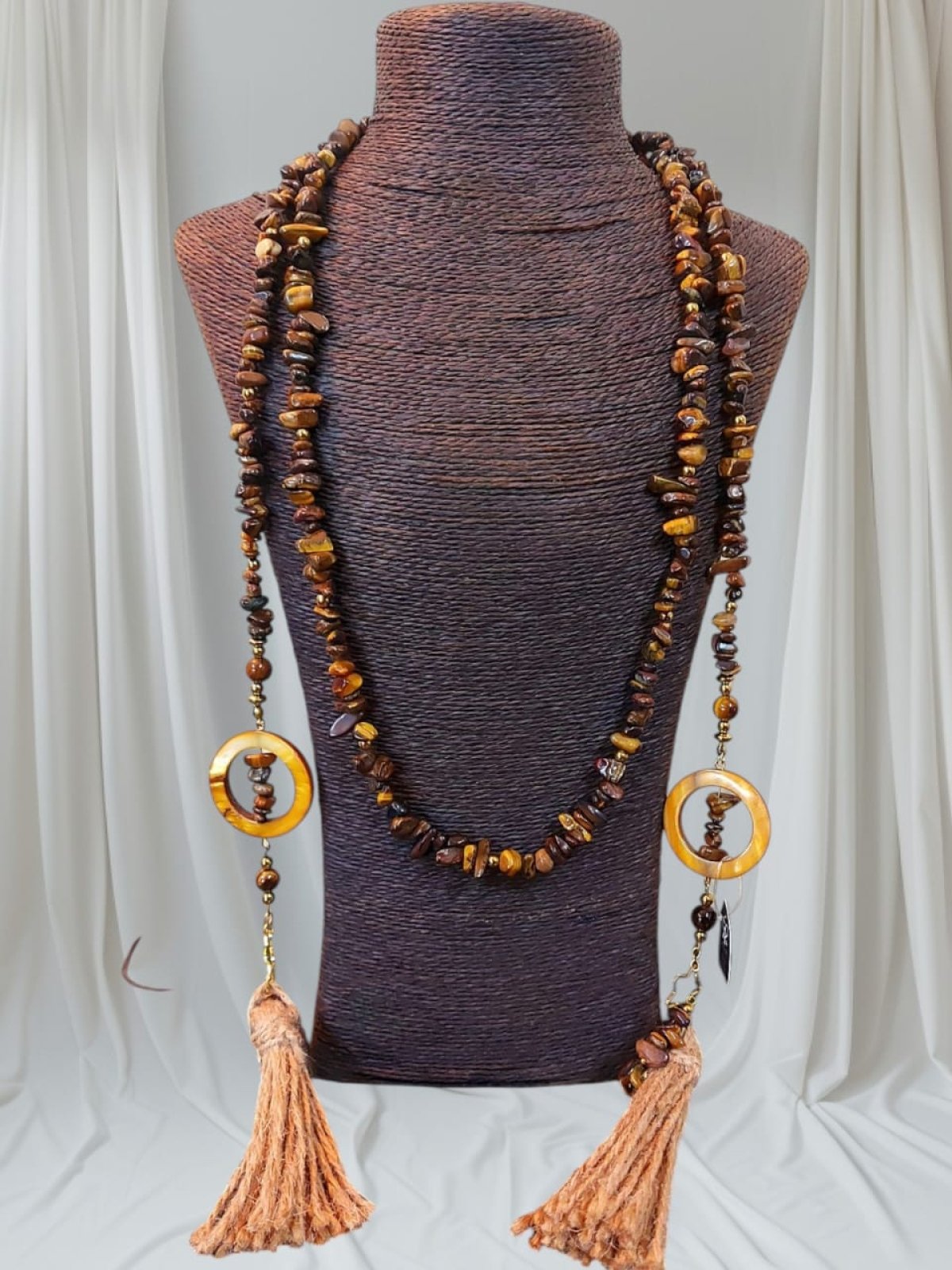 طقم عقد واسوره وحلق العقد ديزاين اسكارف من احجار التايجر بيتلبس بكذا طريقه وممكن حزام كمان انت بتتحكمى فى شكله لانه قطعه واحده طولها اكتر من متر مطعم بفواصل هيماتيت وصدف وشراشيب من الخيش متاح كل قطعه وحدها