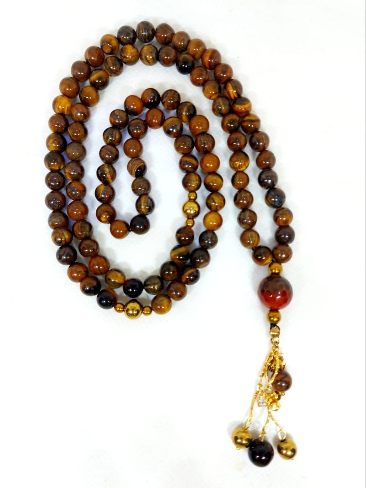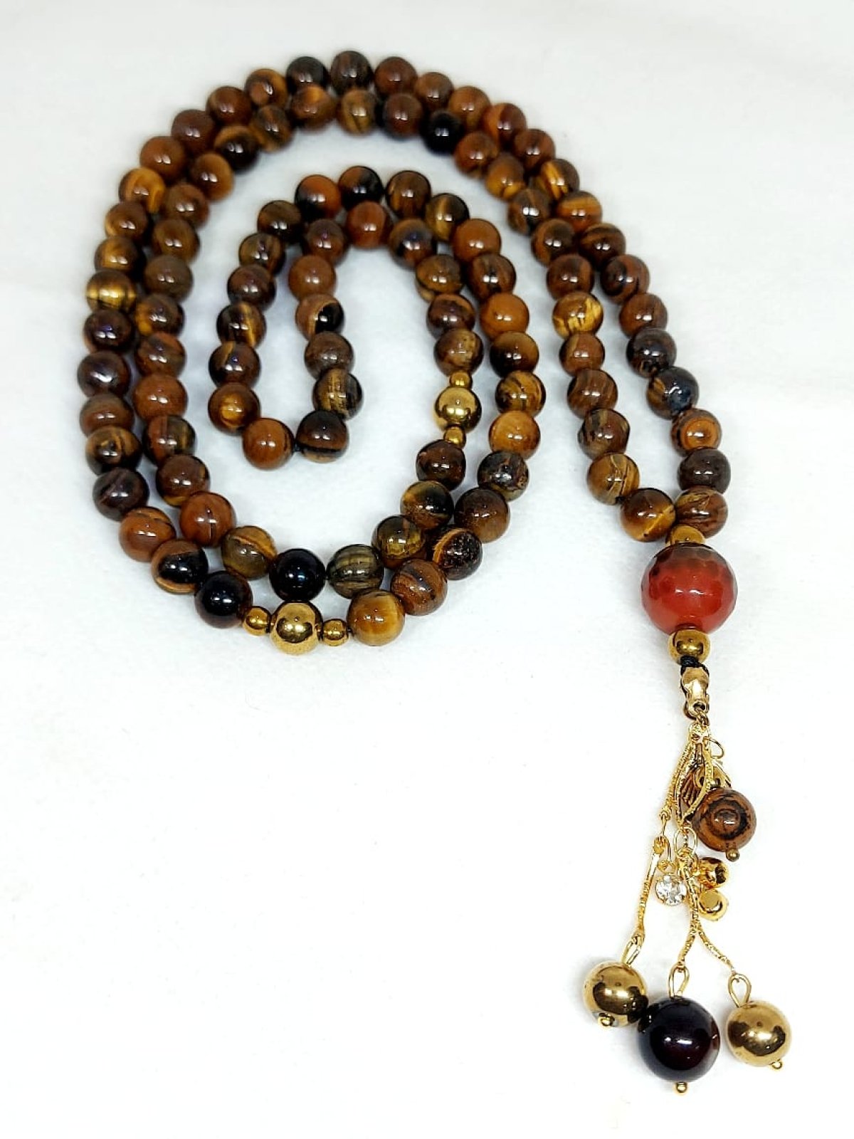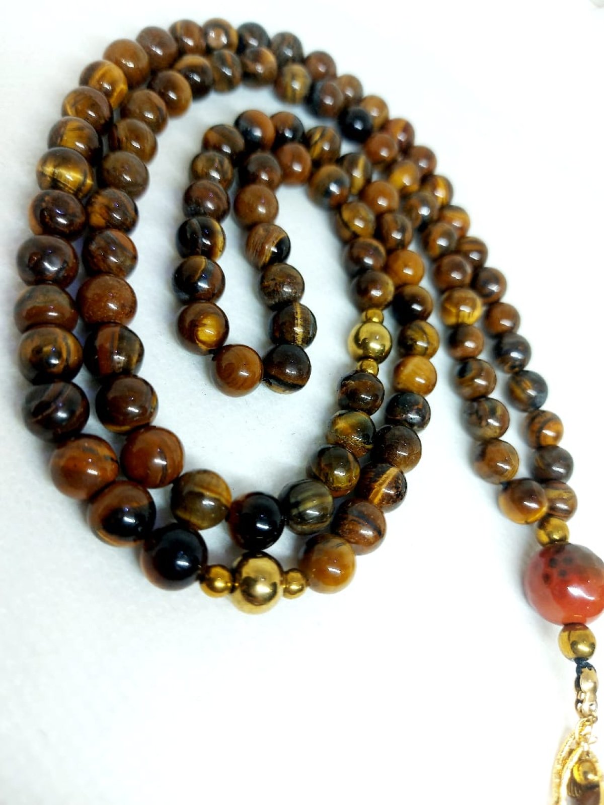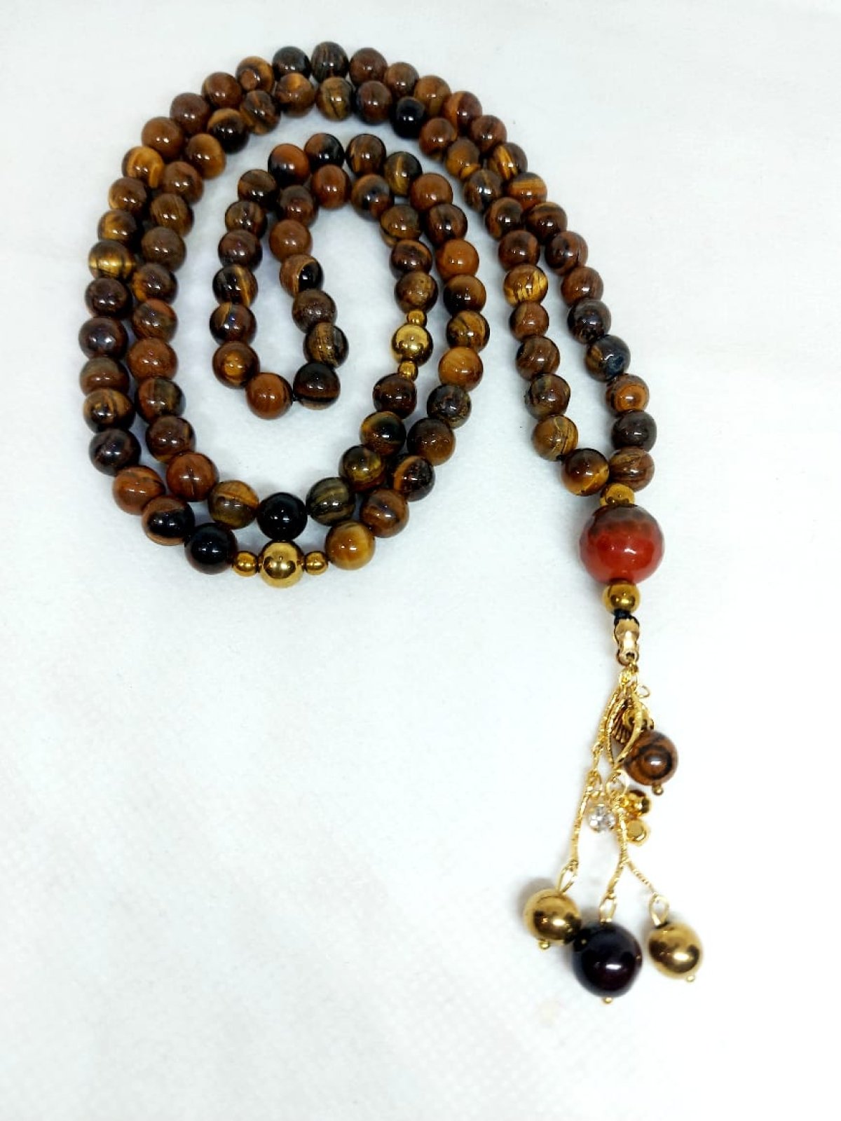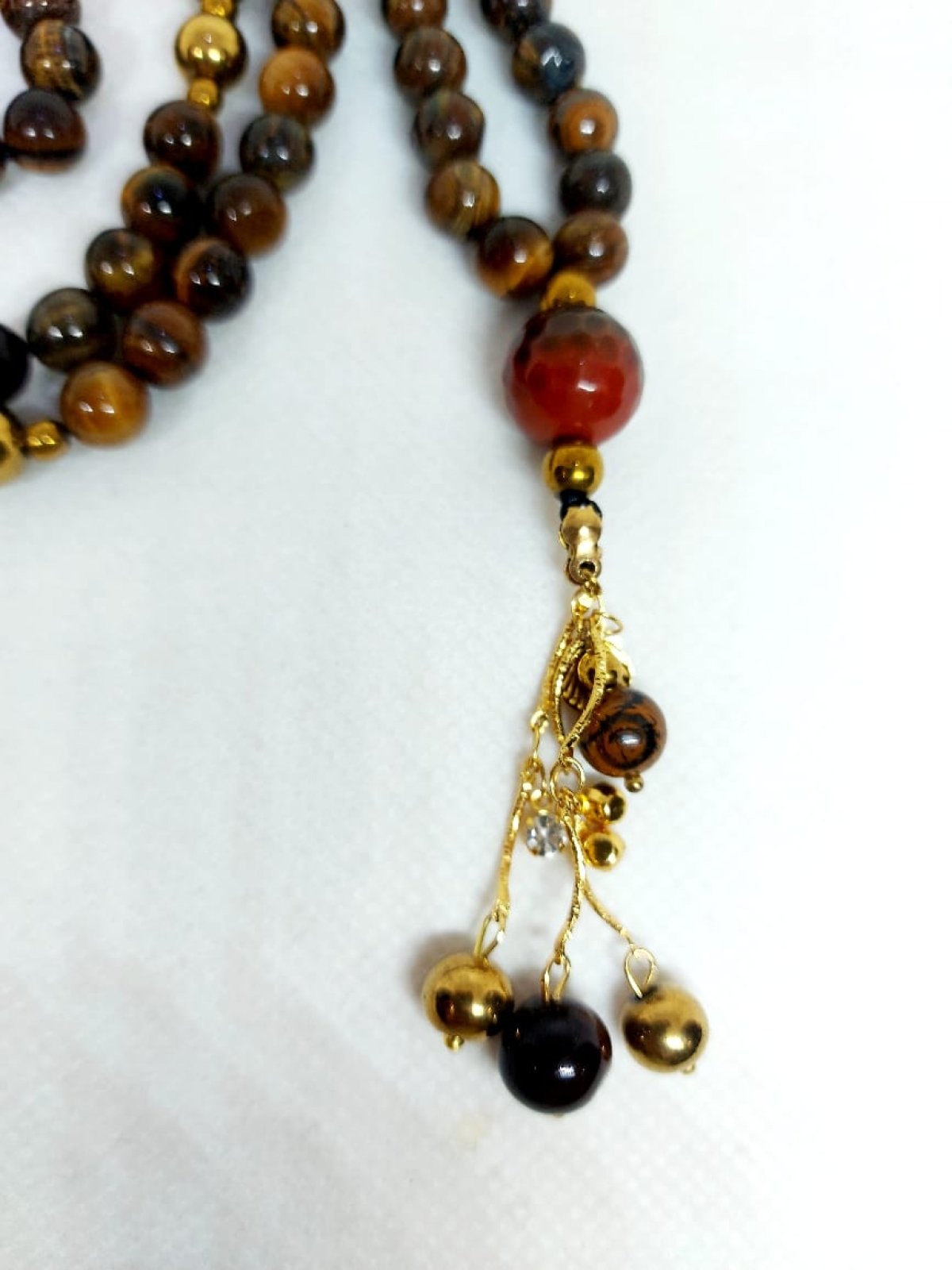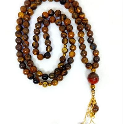 سبحه ٩٩ من احجار التايجر مطعمه بفواصل من احجار الهيماتيت مزوده بسلاسل من الدهب الصينى الجولد