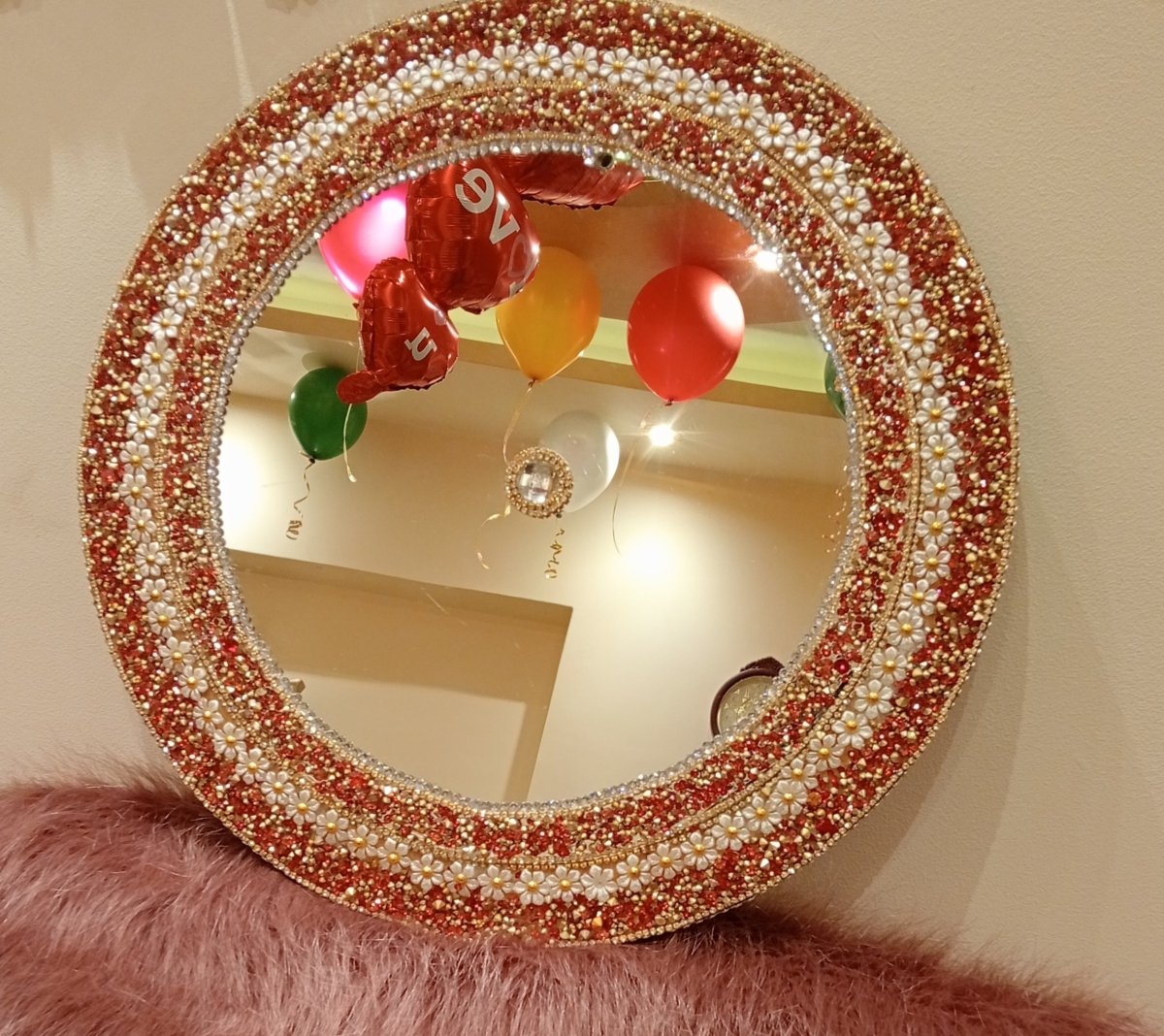 من القطع المميزه والتي تظهر جمال ديكور منزلك هي حوائط المنزل وهذه هي قطعه ديكوريه للحوائط من المرايه المزينه بالفصوص اللامعه الكبيره المرايه مقاس 40 ومتاح منها 30 مقاس 35 و مقاس المرايه مبطنه من الخلف بقطعه من الخشب للحمايه