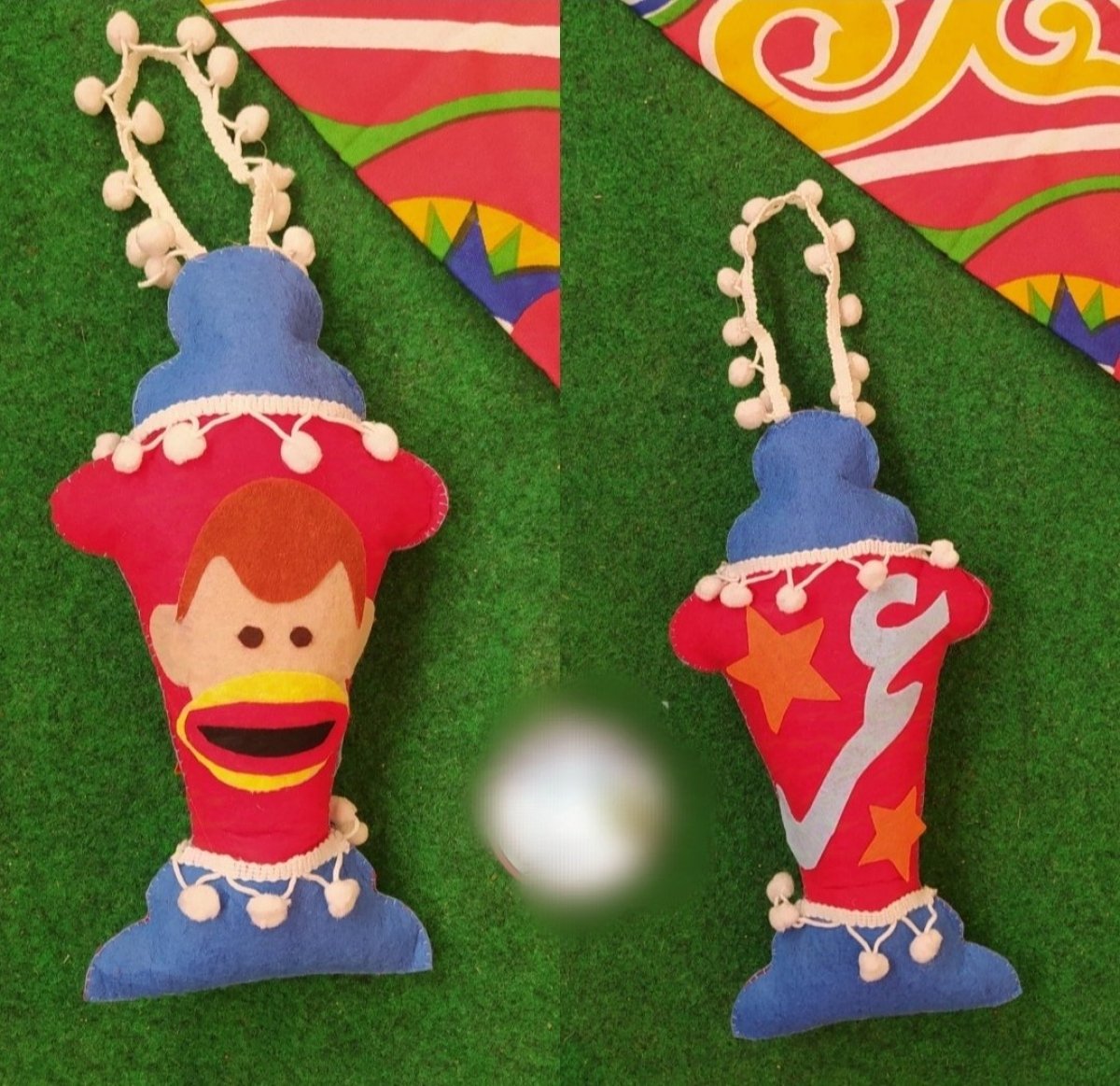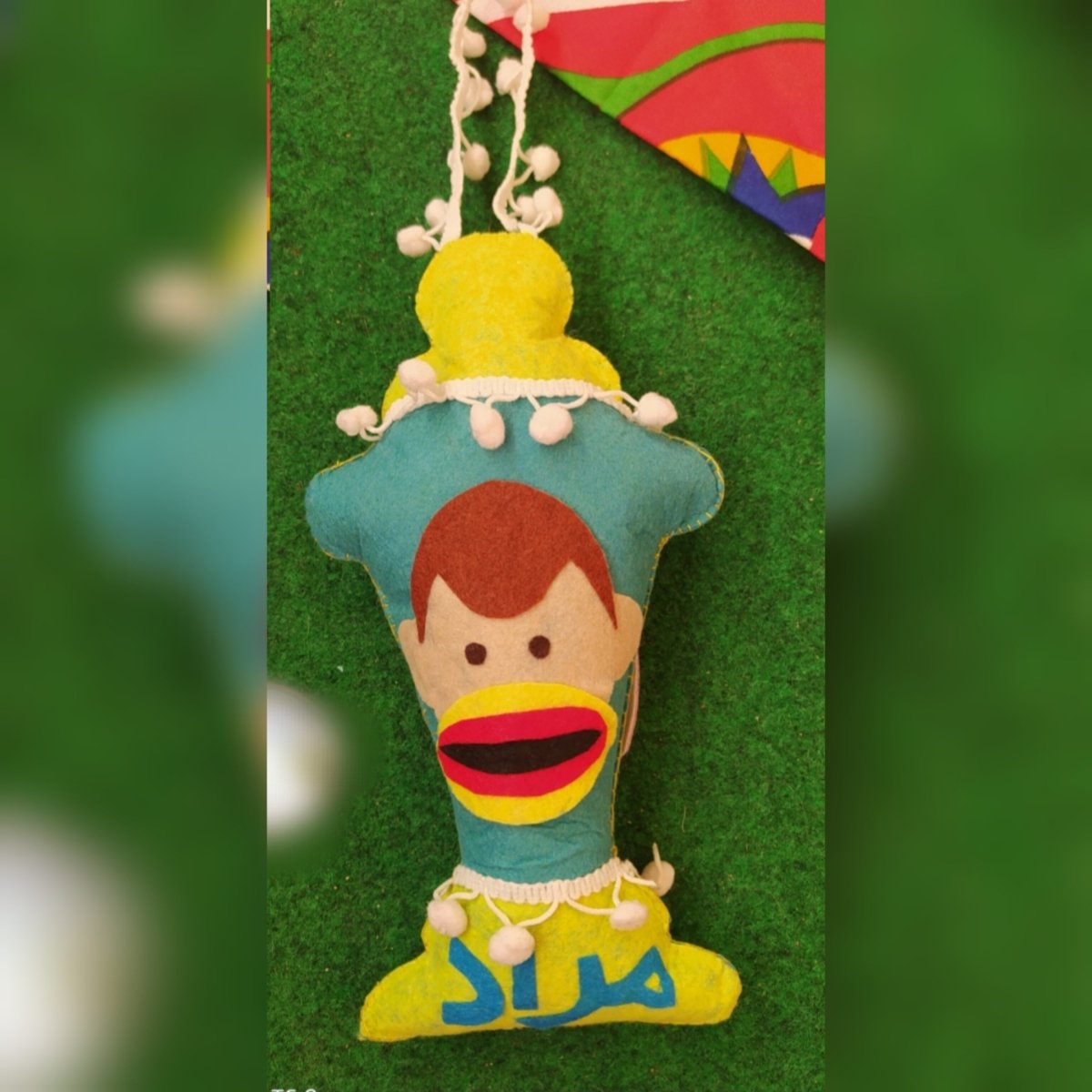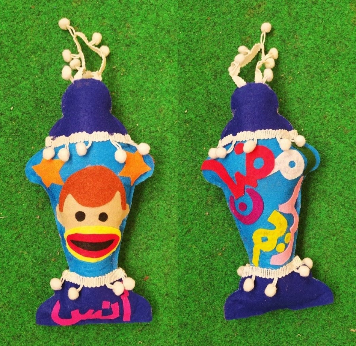 فانوس رمضان بيغني وينور مصنوع يدويا من قماش الجوخ وحشو الفيبر بالاسم والتصميم والالوان المفضلة مع وحدة صوت وضوء مقاس : ٢٥ سم
