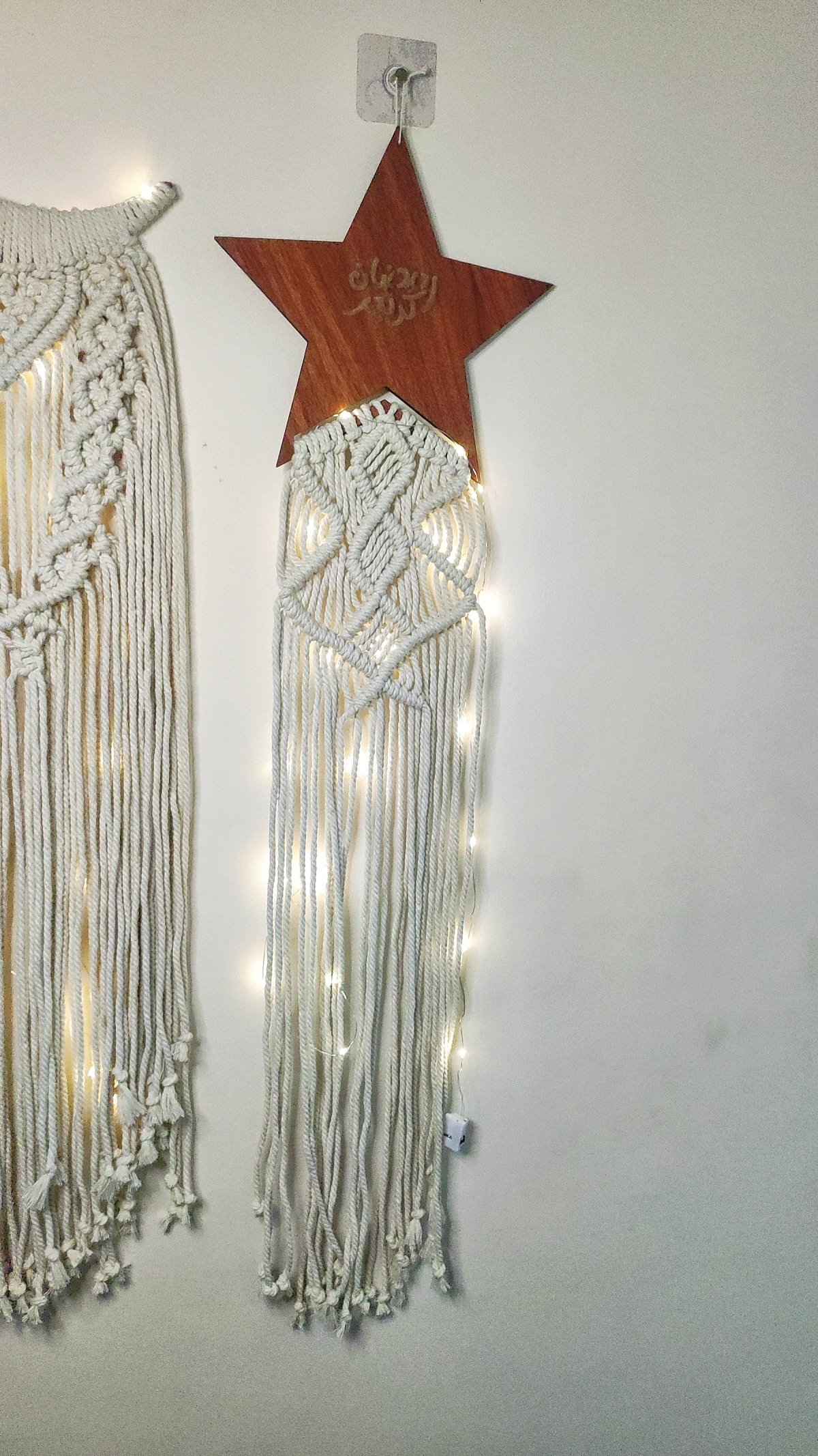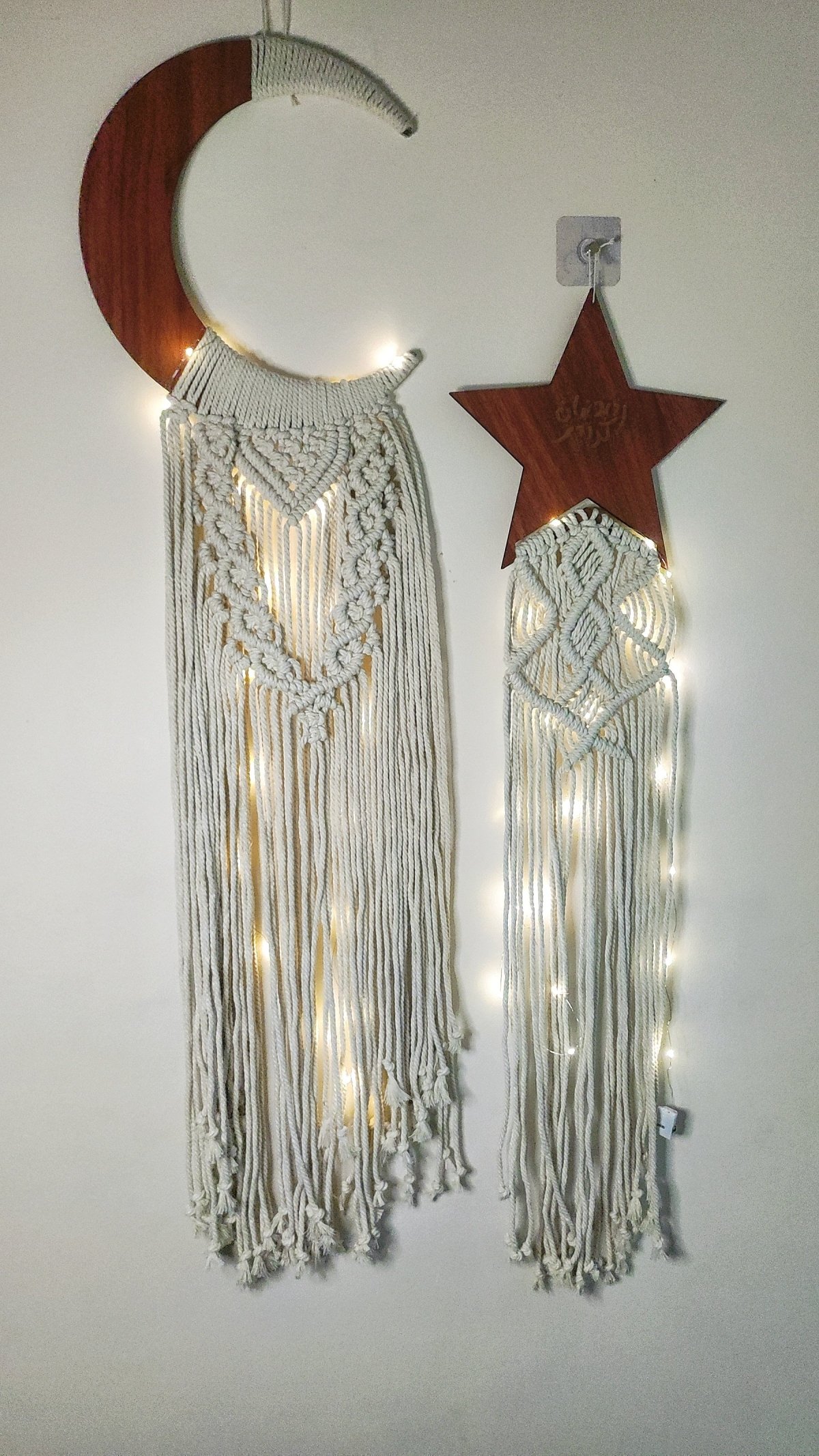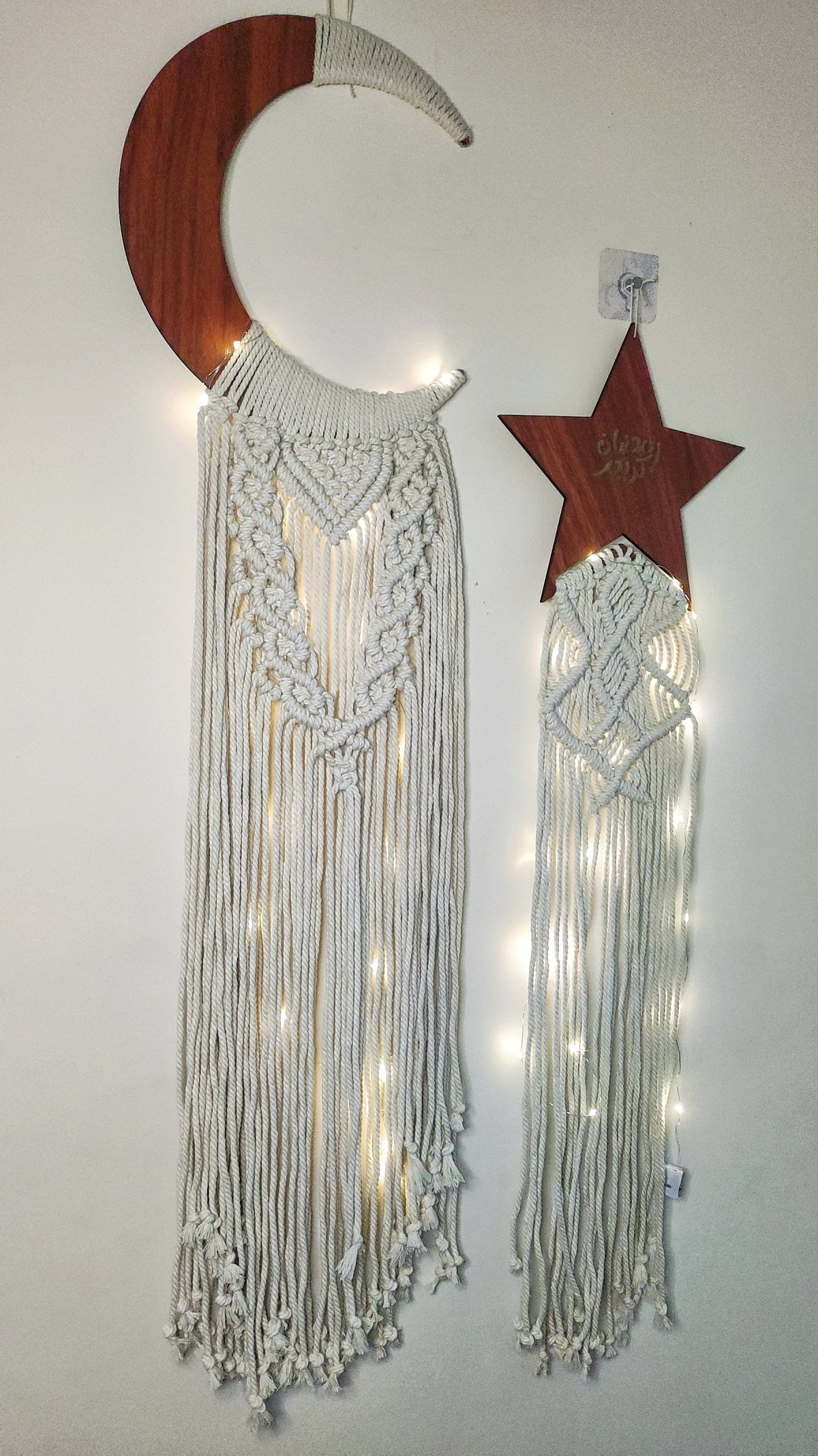 مجسم هلال خشب مزود بشغل مكرميه . مقاس الهلال 30 سم مقاس المجسم بالشغل 100 سم تمثال نجمة خشبي مع مكرامية. مقاس الخشب 25 سم . مقاس القطعة كاملة 100 سم.