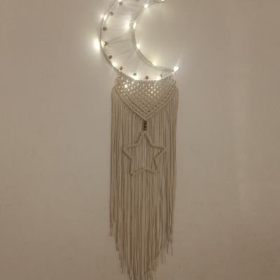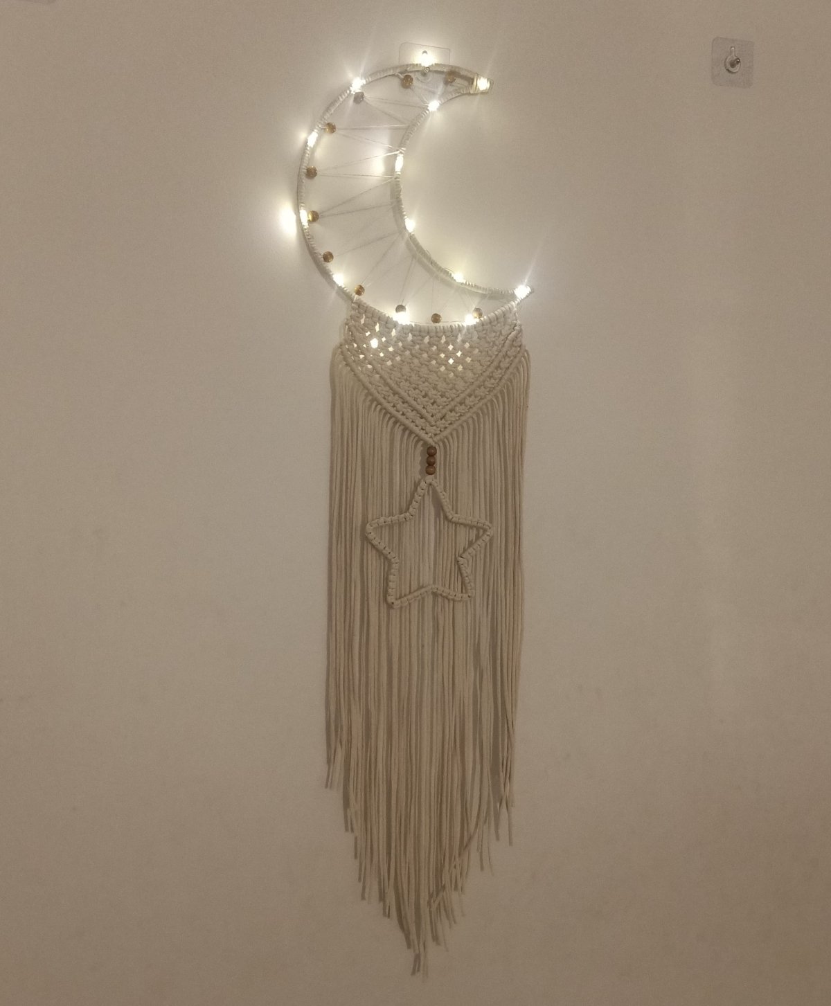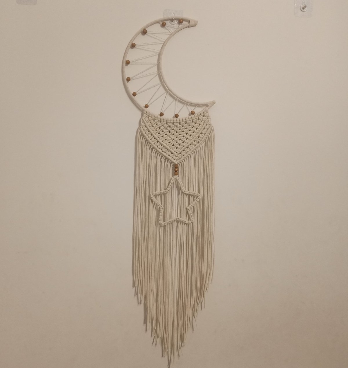 هلال رمضان من المكرمية بخيوط اوف وايت من القطن و بها خرز خشبي و نجمة صغيرة طولها ١٠٠ سم و عرضها ٣٠ سم