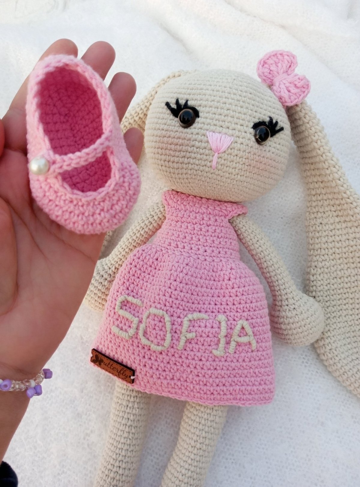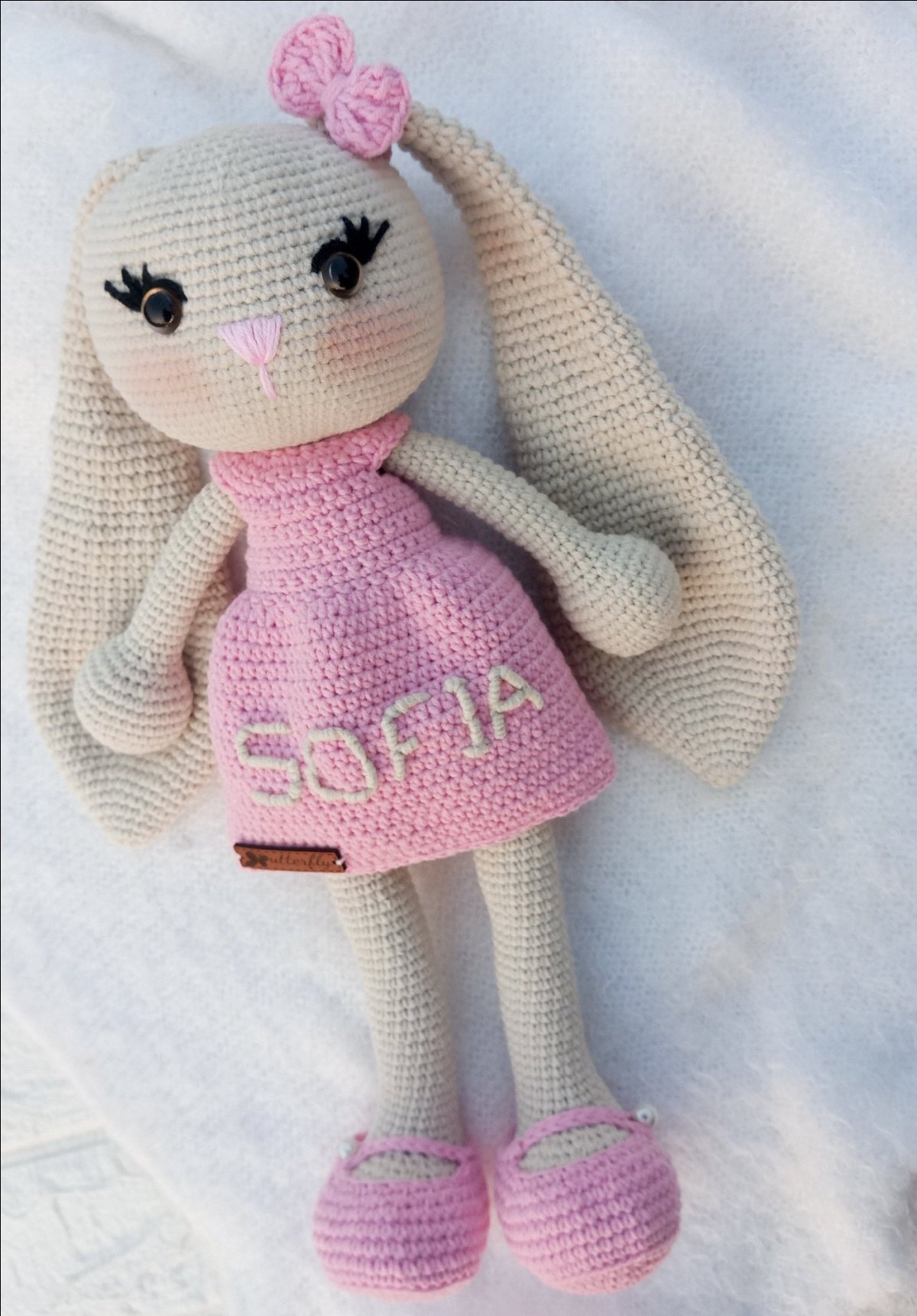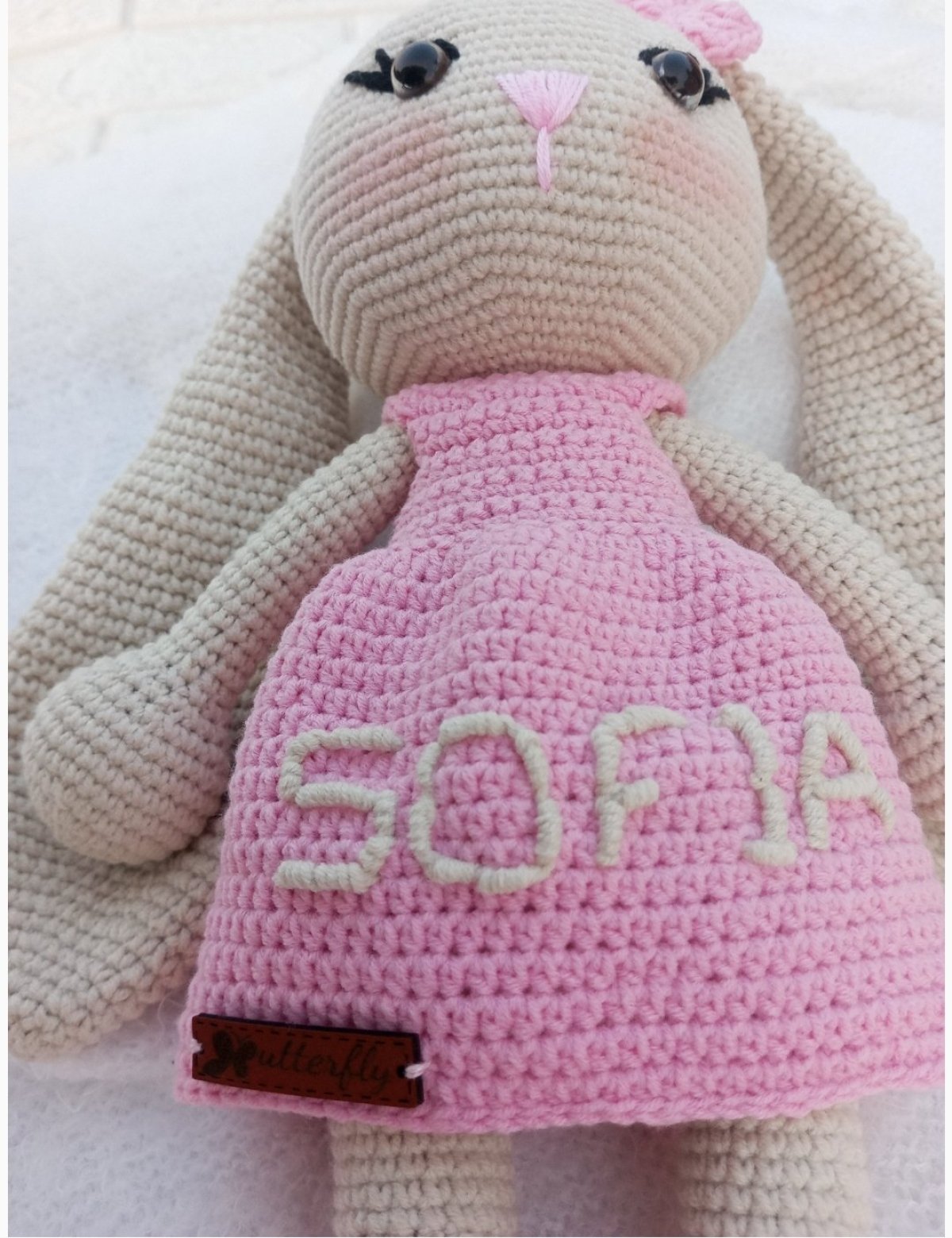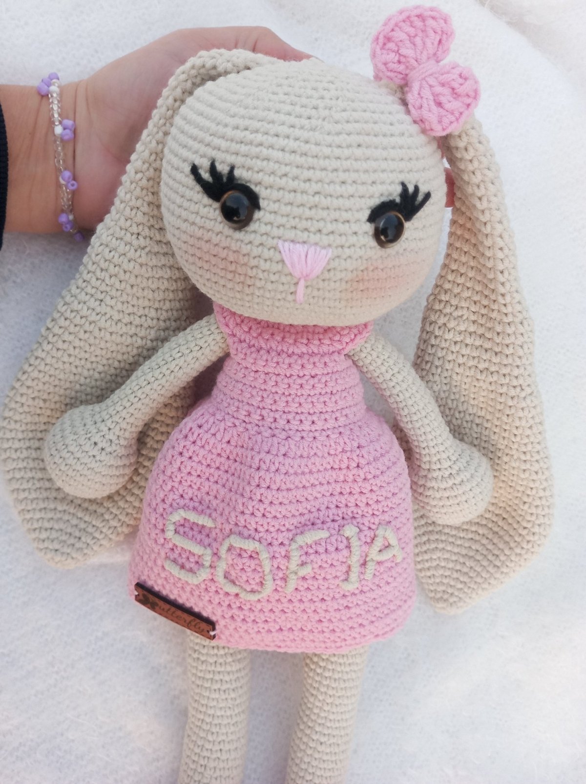 ارنب ايموجرامى مشغول بخيوط قطن تركى طوله 40 سم بتطريز للإسم