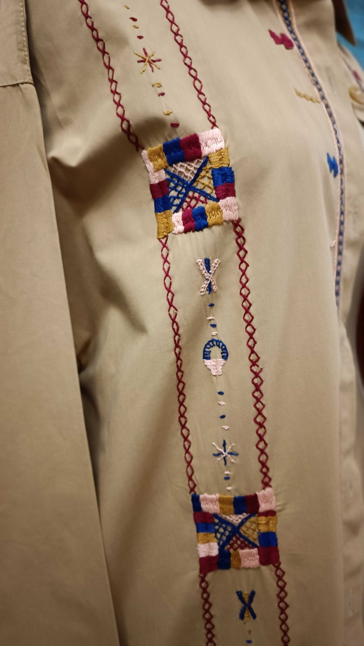 عباية كاجوال - مطرزة يدويًا بالكامل في واحة سيوة، مناسبة لشهر رمضان - مزودة بجيوب، مصنوعة من قماش قطني بوبلين، المقاسات: L-XL، الطول 135 سم، العرض 63 سم