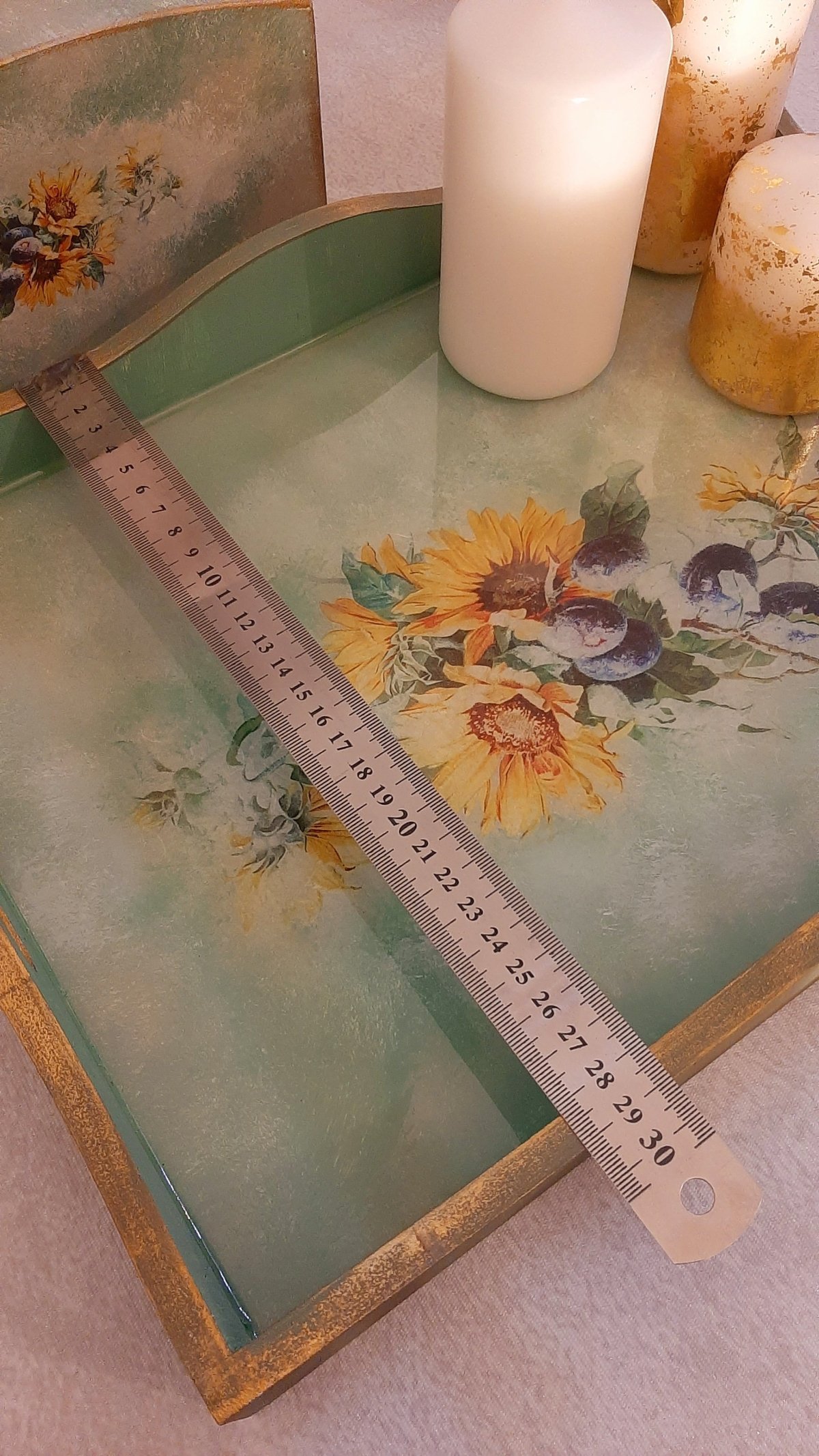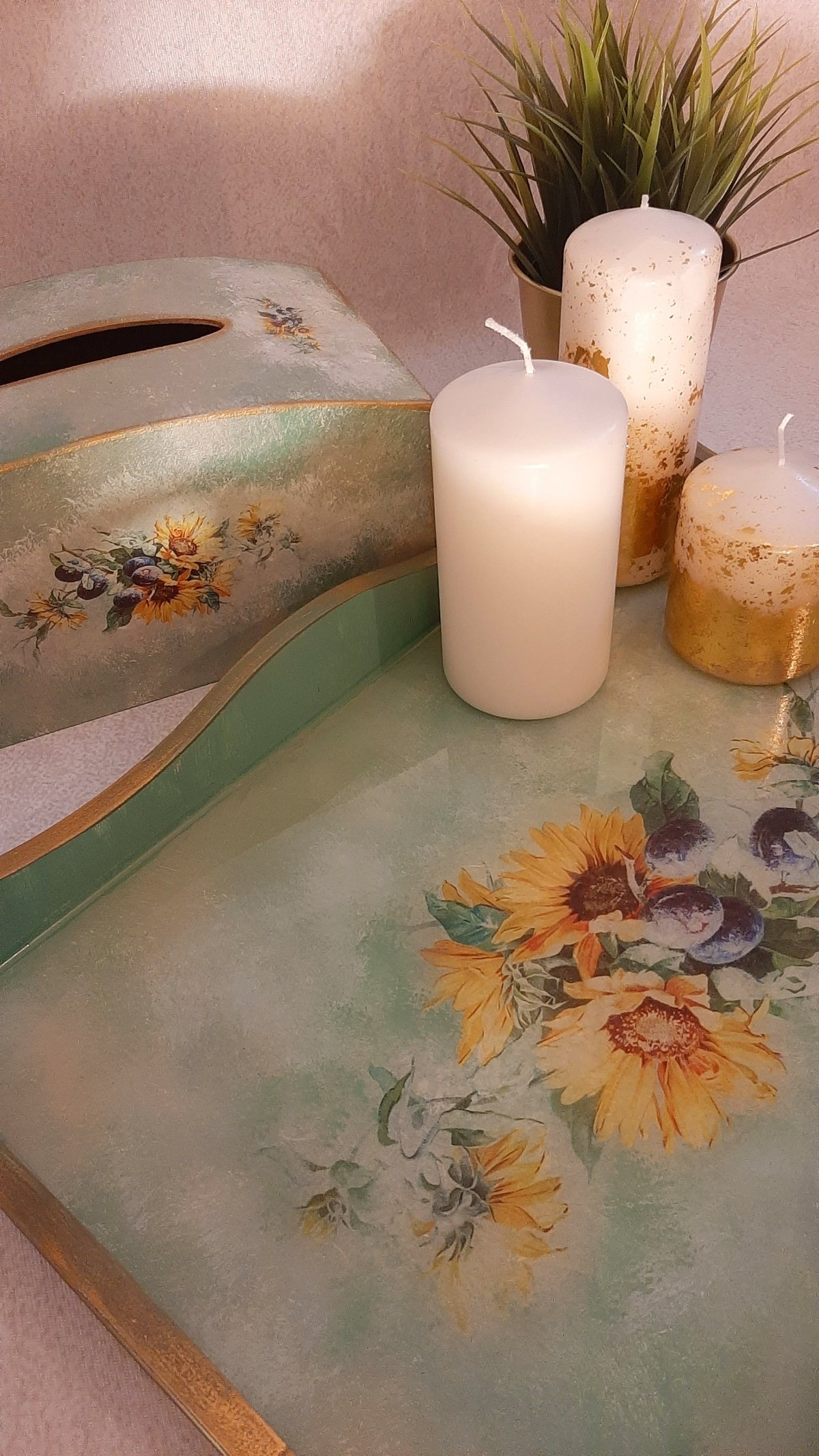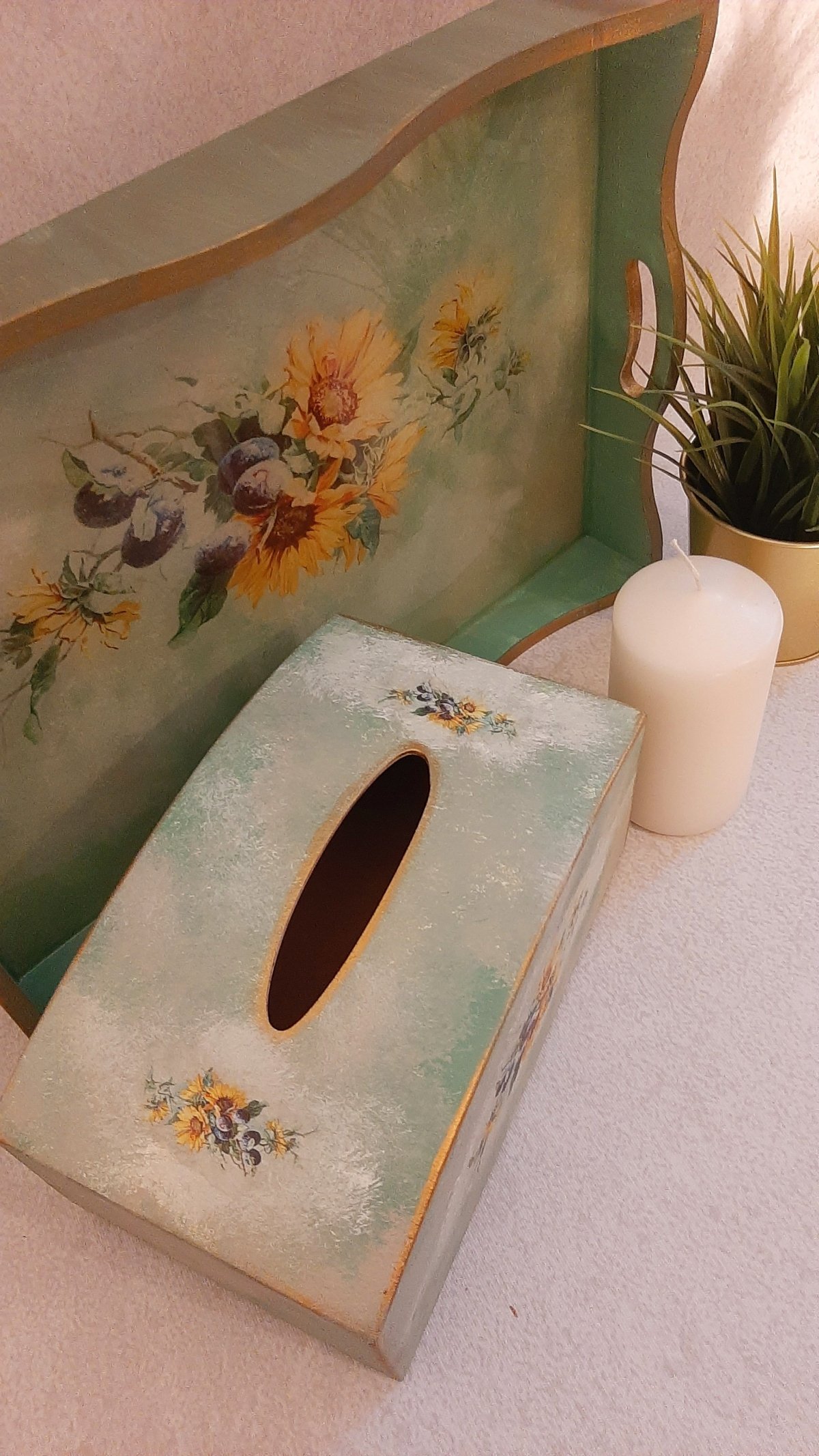 طقم صينية خشب ديكوباج خشب أم دي أف مستطيلة مع علبة مناديل كبيرة الصينية مقاس 39*29 سم صناعة يدوي 100% مع طبقة حماية ضد الماء ايبوكسي