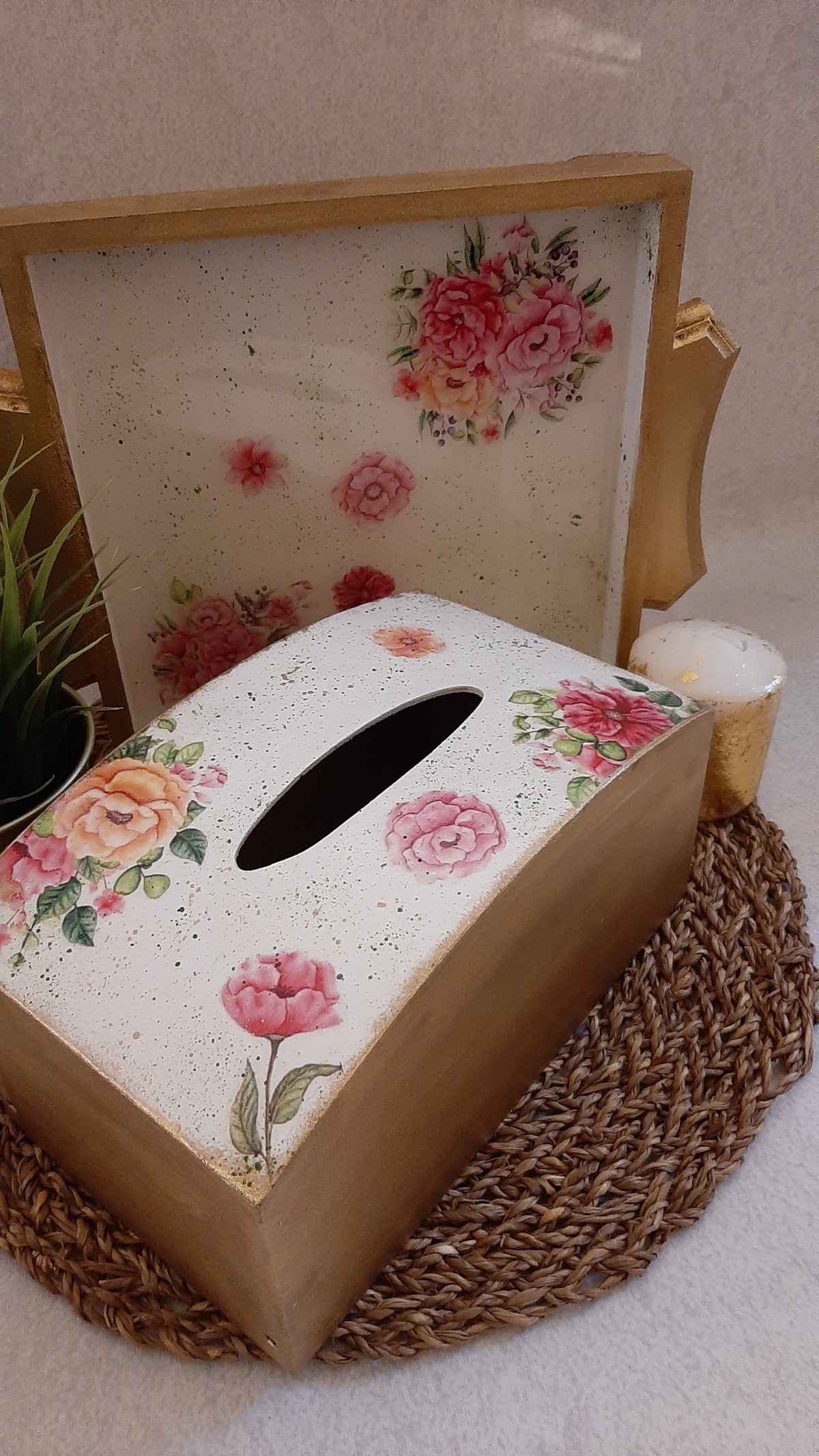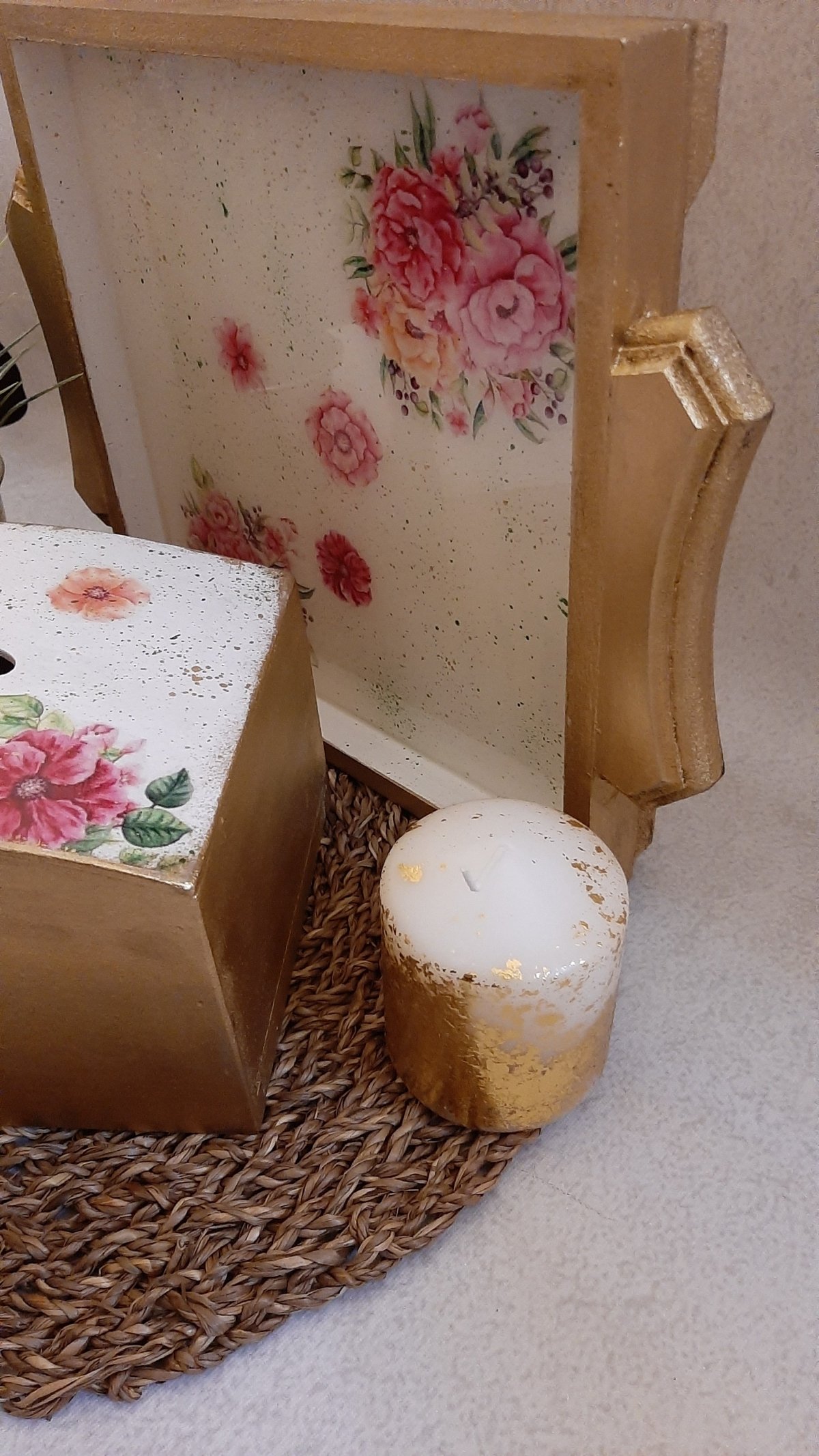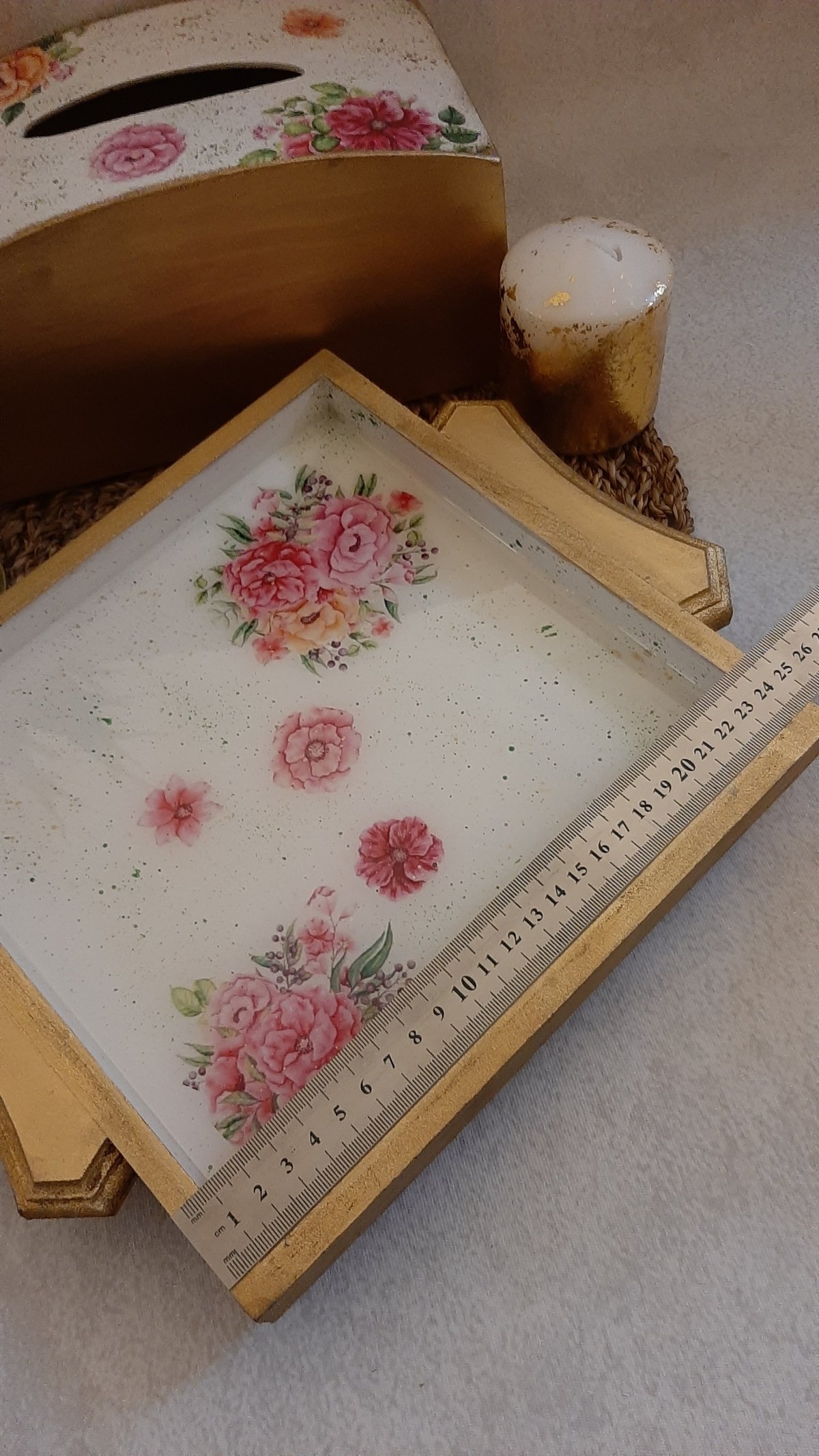 صينية خشب ديكوباج خشب أم دي أف الصينية مربعة الشكل الصينية 25*25سم لونها دهبي*أبيض صناعة يدوي مع طبقة حماية ضد الماء مع طبقة حماية من الايبوكسي الشفاف