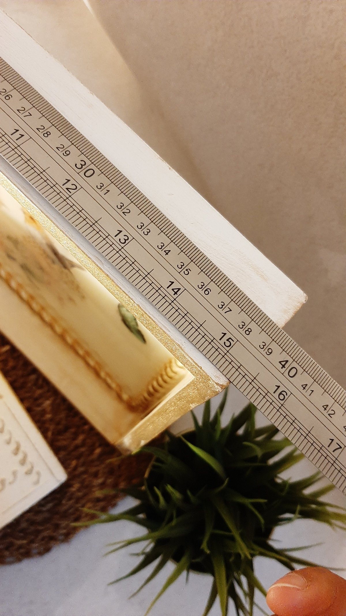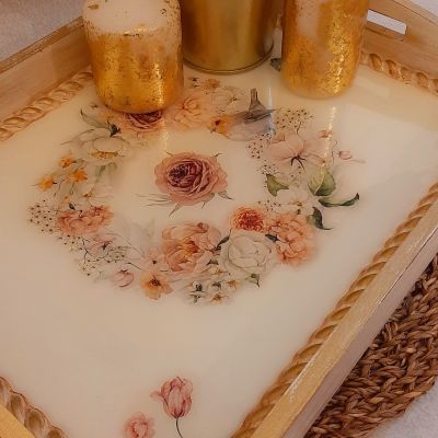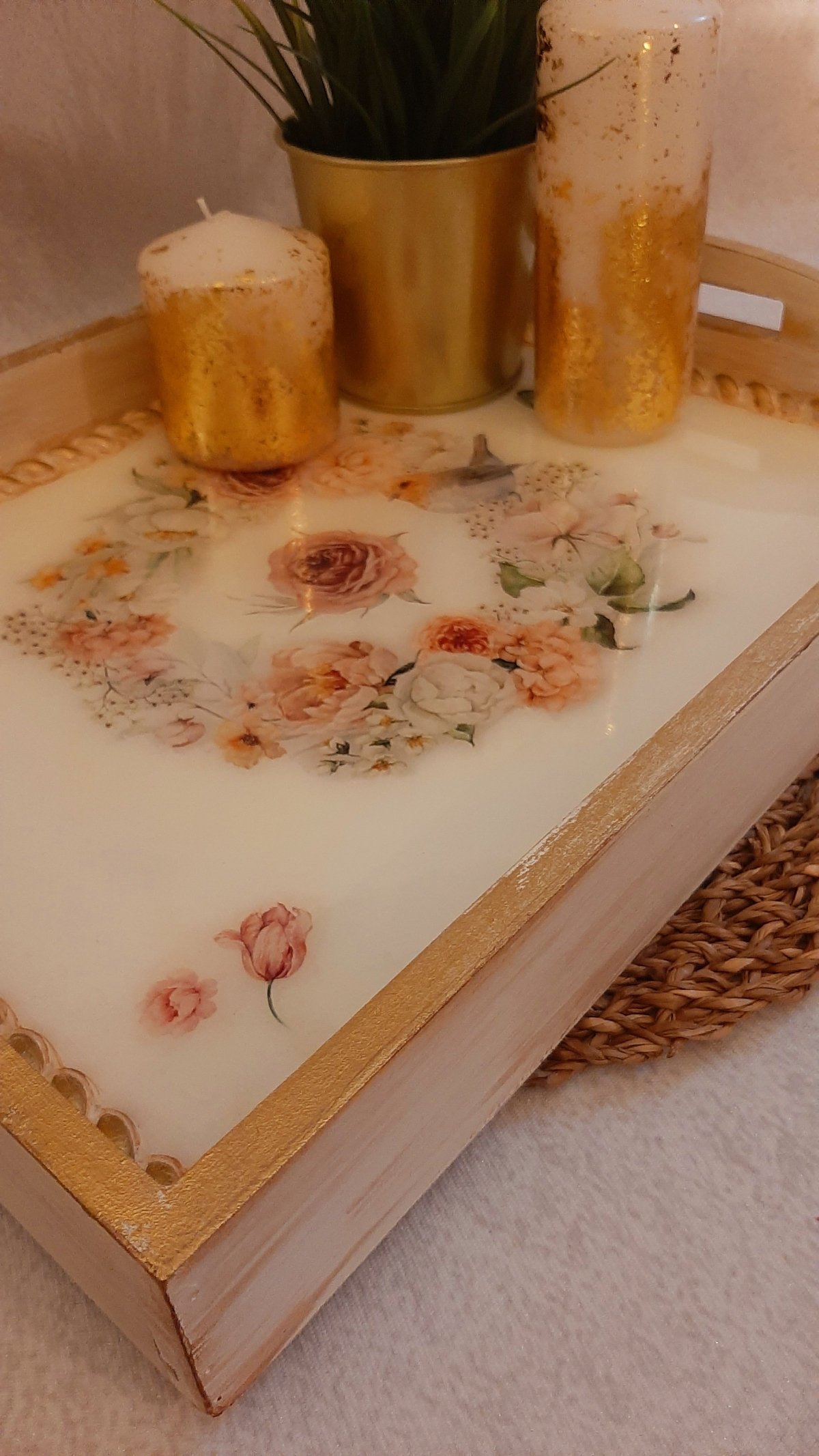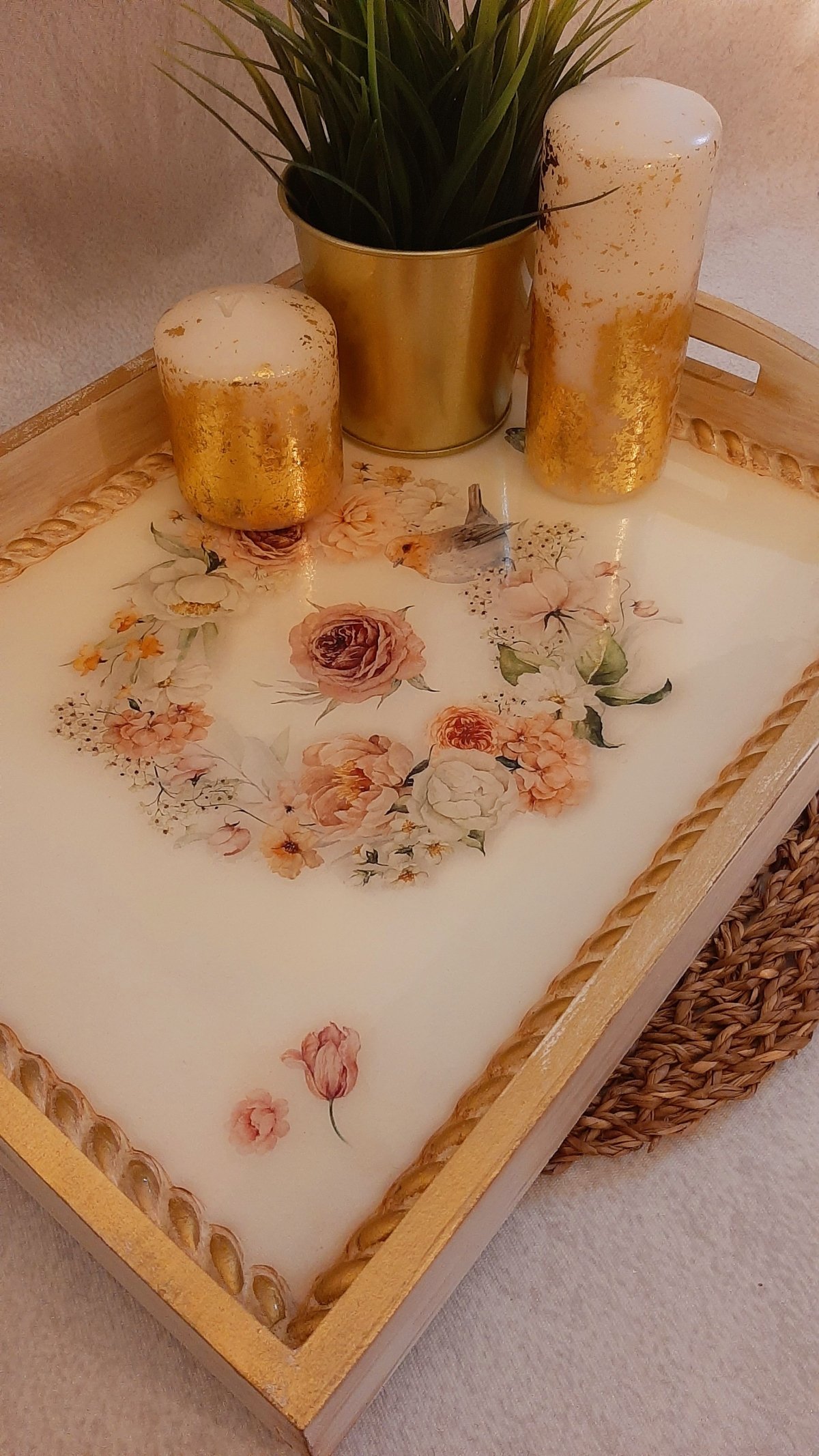 صينية خشب ديكوباج خشب أم دي أف مستطيلة المقاس 30*39 سم لونها أبيض*دهبي صناعة يدوي 100% مع طبقة حماية ضد الماء مع طبقة حماية من الايبوكسي الشفاف