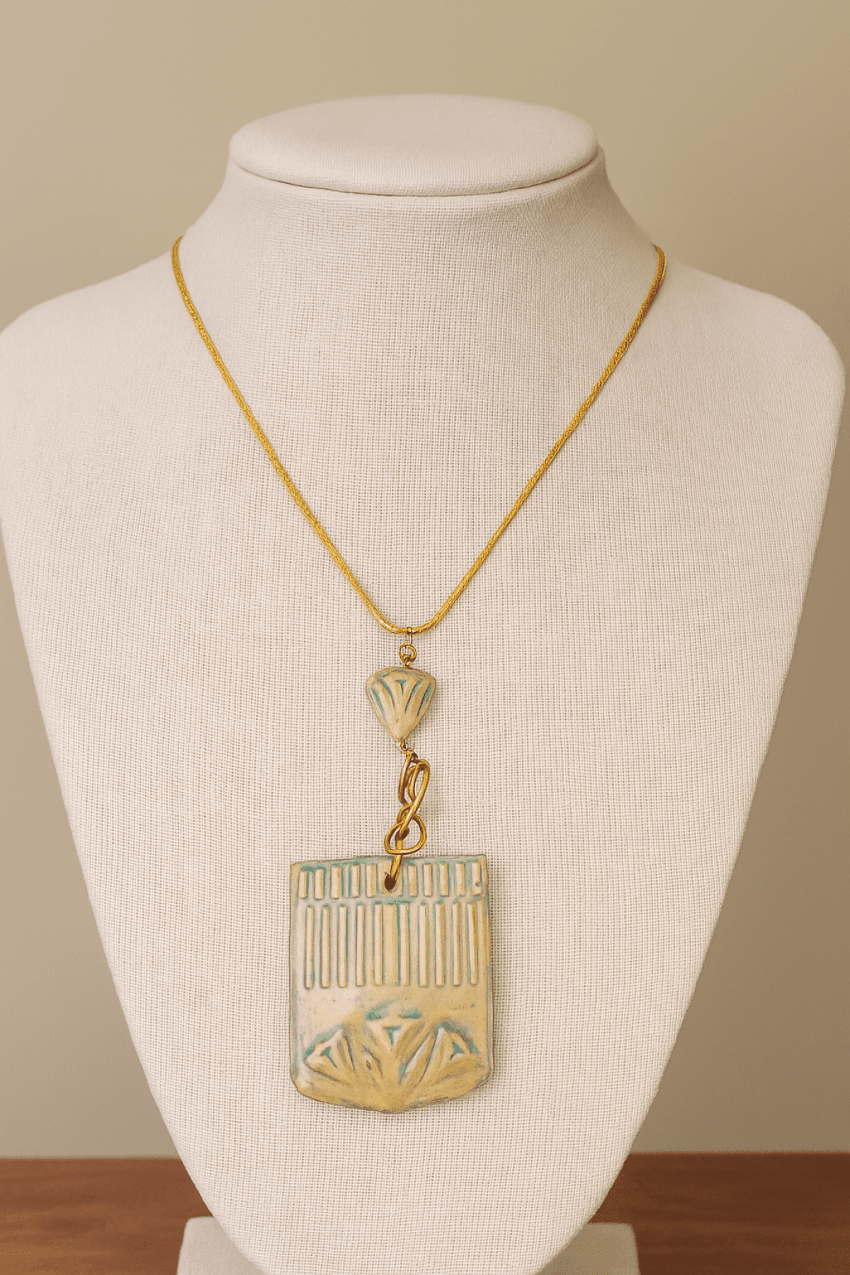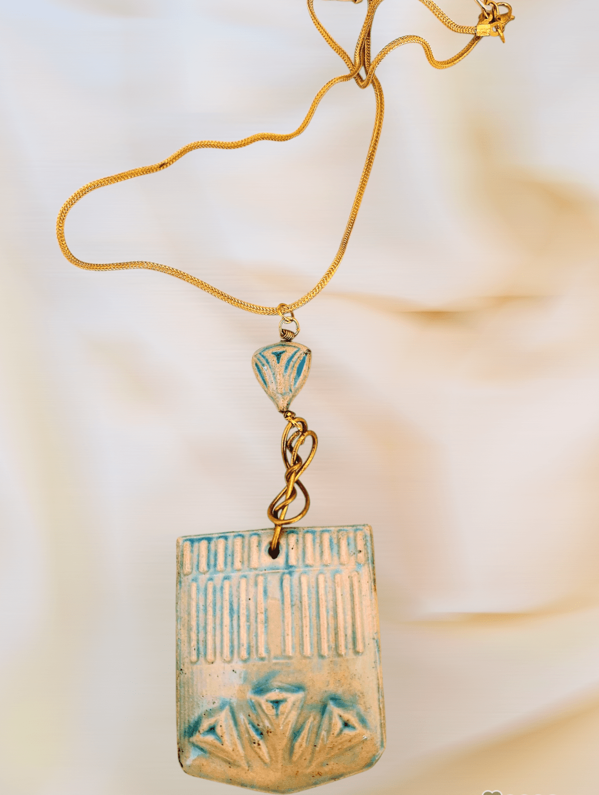 عقد من الخزف والنحاس مستوحي من الطراز المصري القديم.. عقد مميز متوفر بقطعه واحدة فقط.. طول العقد ٤٠ سم قابل للتحكم من الخلف.. حجم القطع الخزفية (الكبيره ٥.٥*٥) (الصغيره ٢*٢).. أول علامة تجارية لإنتاج مكملات الأزياء الخزفية باستخدام تكنولوجيا التحكم الرقمي لمحبين التصميمات المتفرده في مجال الحلي ومكملات الأزياء