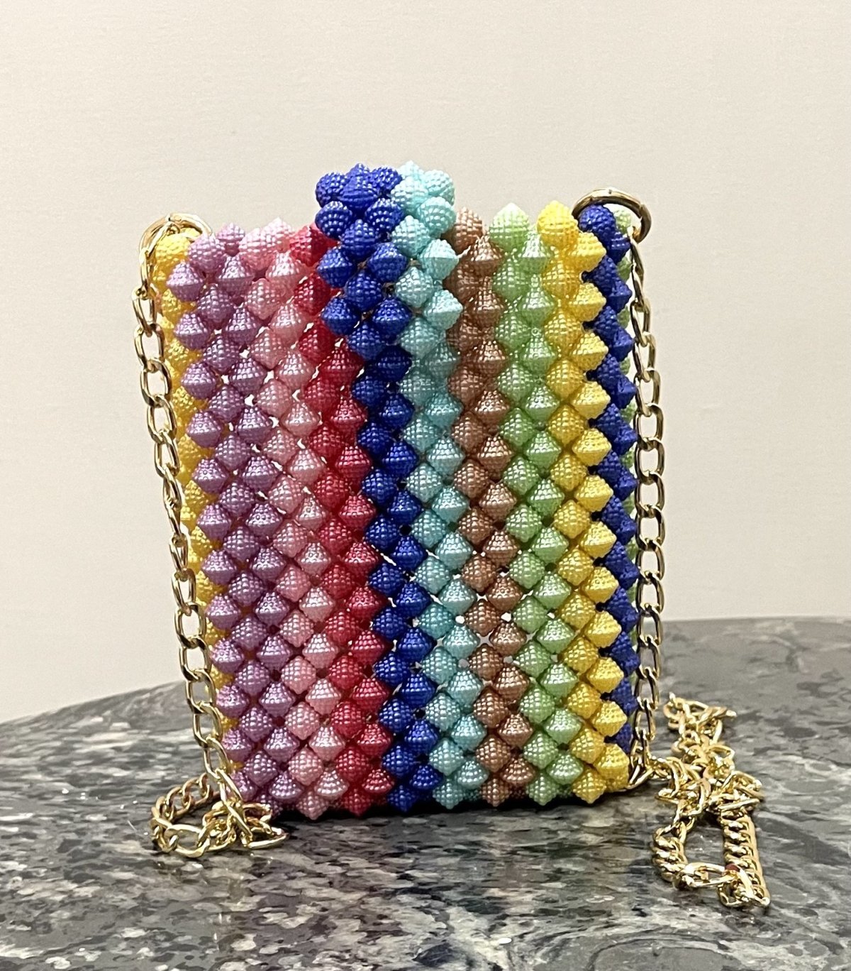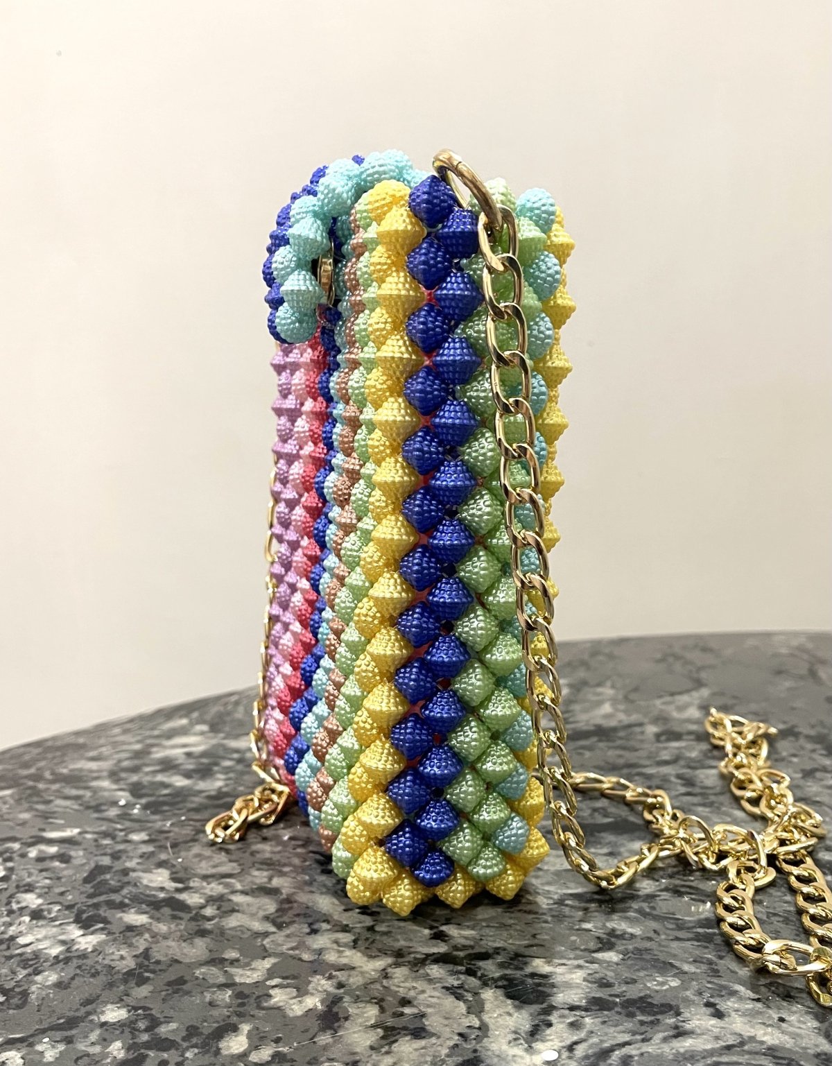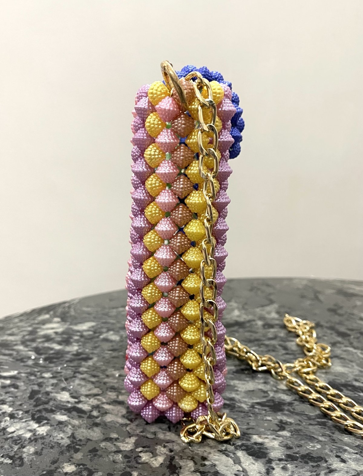 شنطة من خرز فتافيت السكر المتعدد الألوان مع حزام ذهبى بحلقات مزودة بقفل مغناطيس للغلق الطول ١٨ سم العرض ١٢ سم العمق ٥ سم تكفى موبايل ومعه عده أشياء