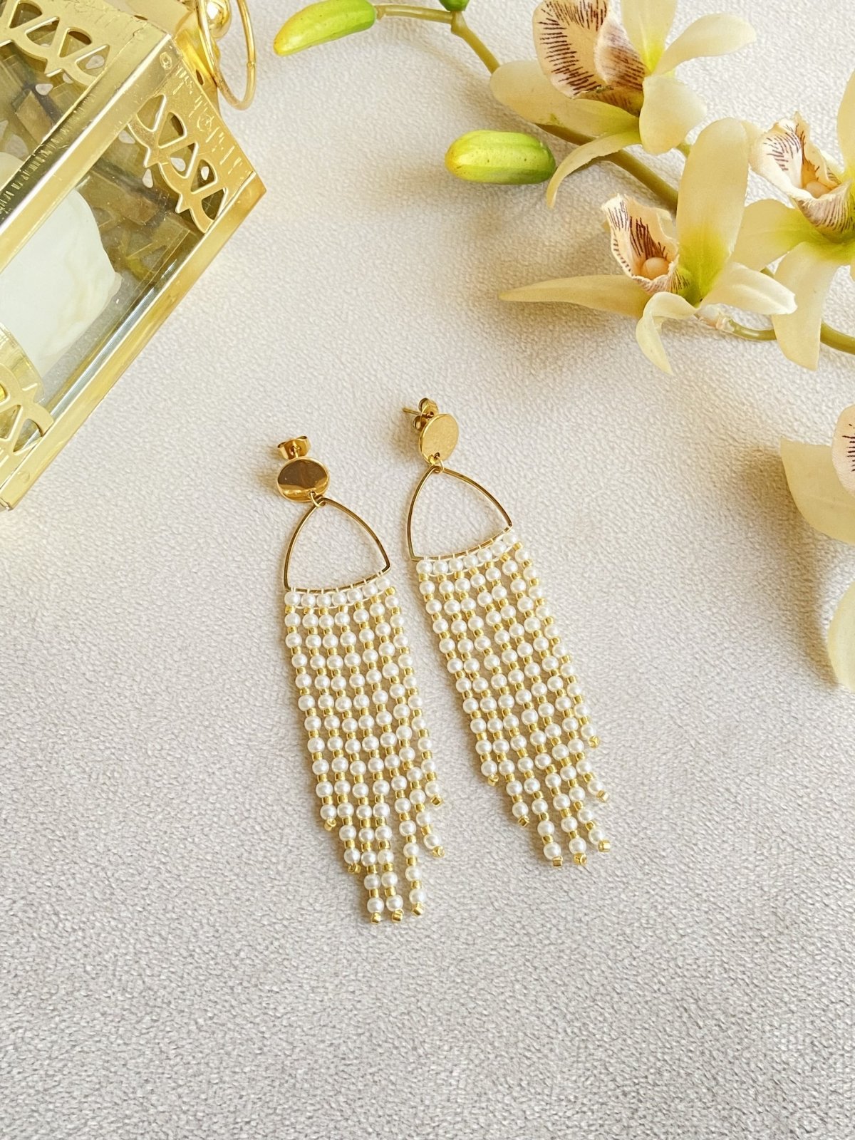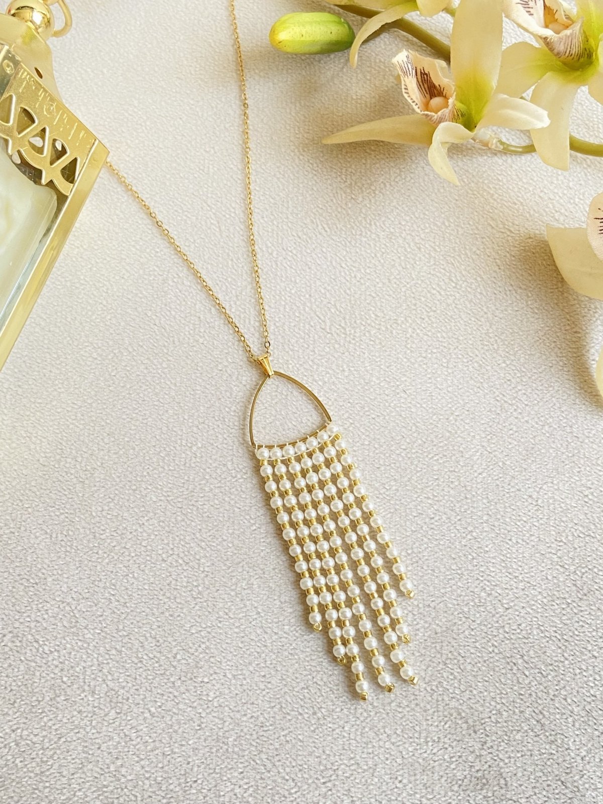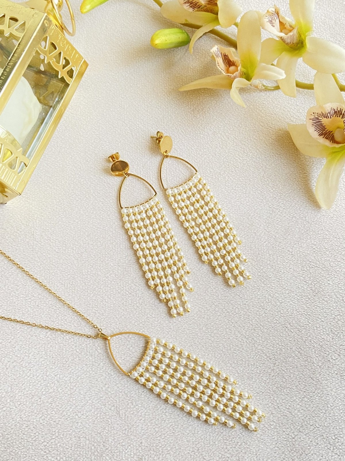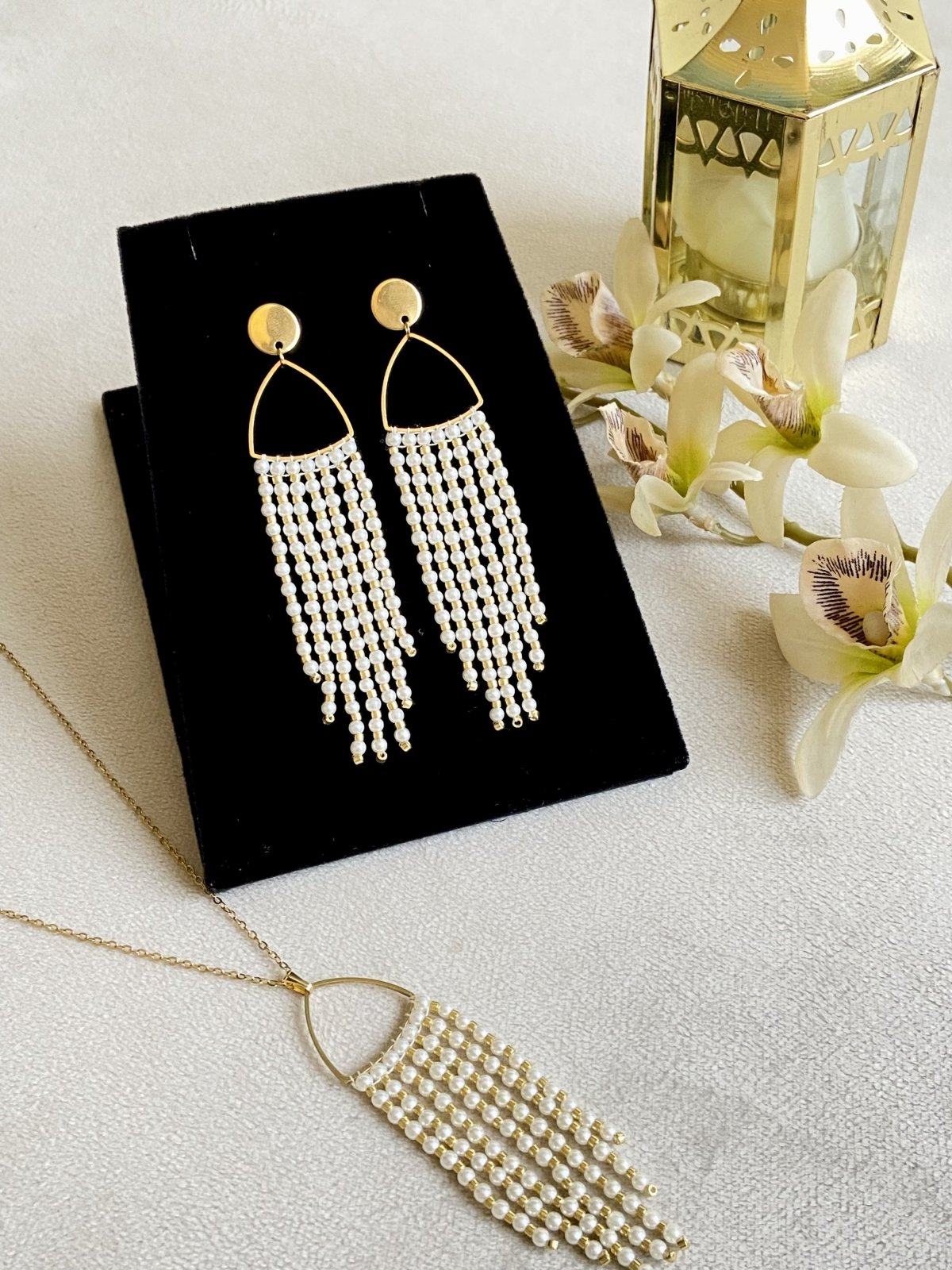 * طقم سلسلة و حلق هاند ميد مطرز باللولي و خرز الميوكي * المعدن : ستانلس ستيل * مقاس الحلق : ٩ سم * ٢ سم * طول السلسلة : ٤٥ سم * يرجي الحفاظ على الاكسسوارات بعيدا عن البرفانات او الكريمات حتى تبقى فى حالة ممتازة