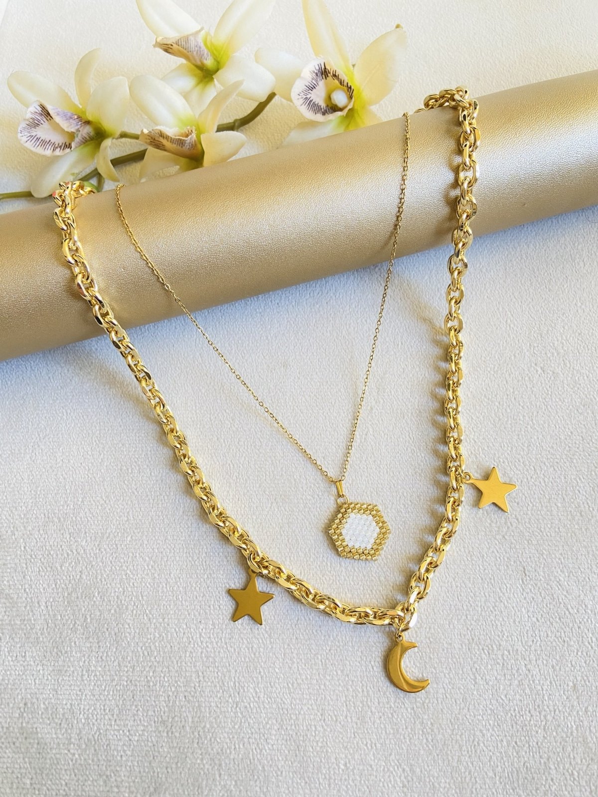 * سلسلة دورين ( ١ سلسلة ستانلس ستيل بها دلاية مطرزة بخرز الميوكي + سلسلة ذهب صينى بها دلايات رمضان ) * المعدن : ستانلس ستيل + ذهب صيني * طول السلسلة : ٥٠ سم * يرجي الحفاظ على الاكسسوارات بعيدا عن البرفانات او الكريمات حتى تبقى فى حالة ممتازة