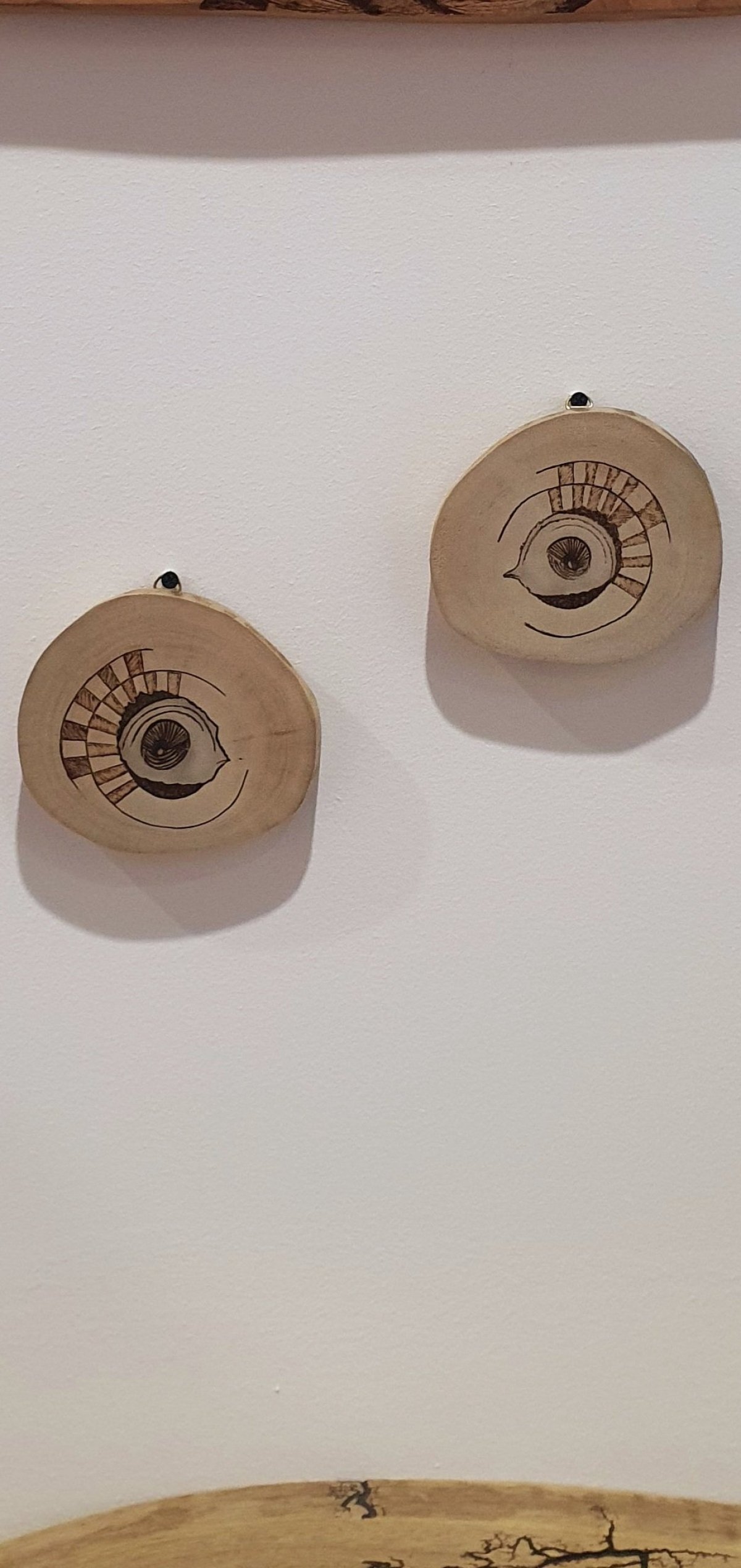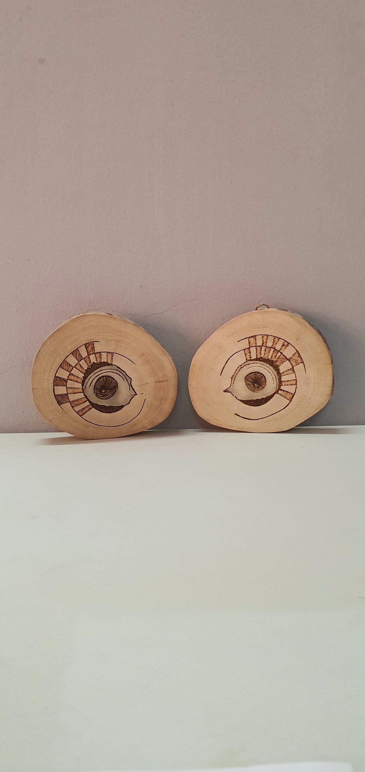 قطعتان دائريتان من الخشب الطبيعي مزين بتصميم فريد، نفَّذناه بفن الحرق اليدوي على الخشب، ليبرز جمال عروق الخشب. علقهما مقابل بعضهما لتحصل على لوحة فنية متناسقة تخطف الأنظار. الأبعاد: قطر ١٢-١٣ سم (كل قطعة)
