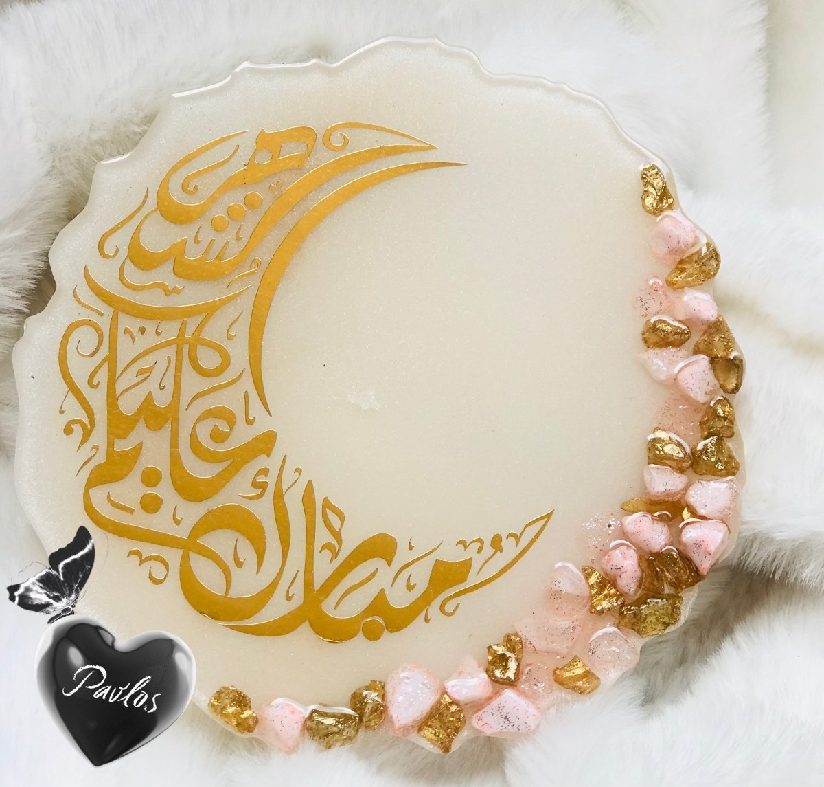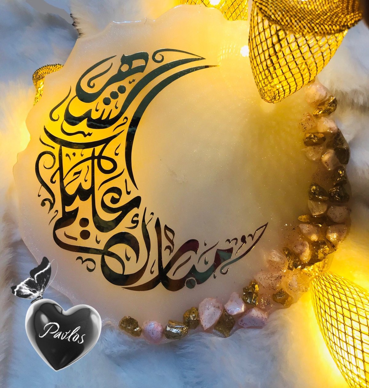كوستر رمضاني ريزن المقاس: ١٣سم اللون: ابيض مطعم بالاحجار البارزة الشكل: دائري عشوائي الكتابة: ڤينيل ذهبي لامع علي شكل هلال رمضان يمكن استخدامه كقطعة ديكورية مميزة بإستخدام حامل اكليريك شفاف