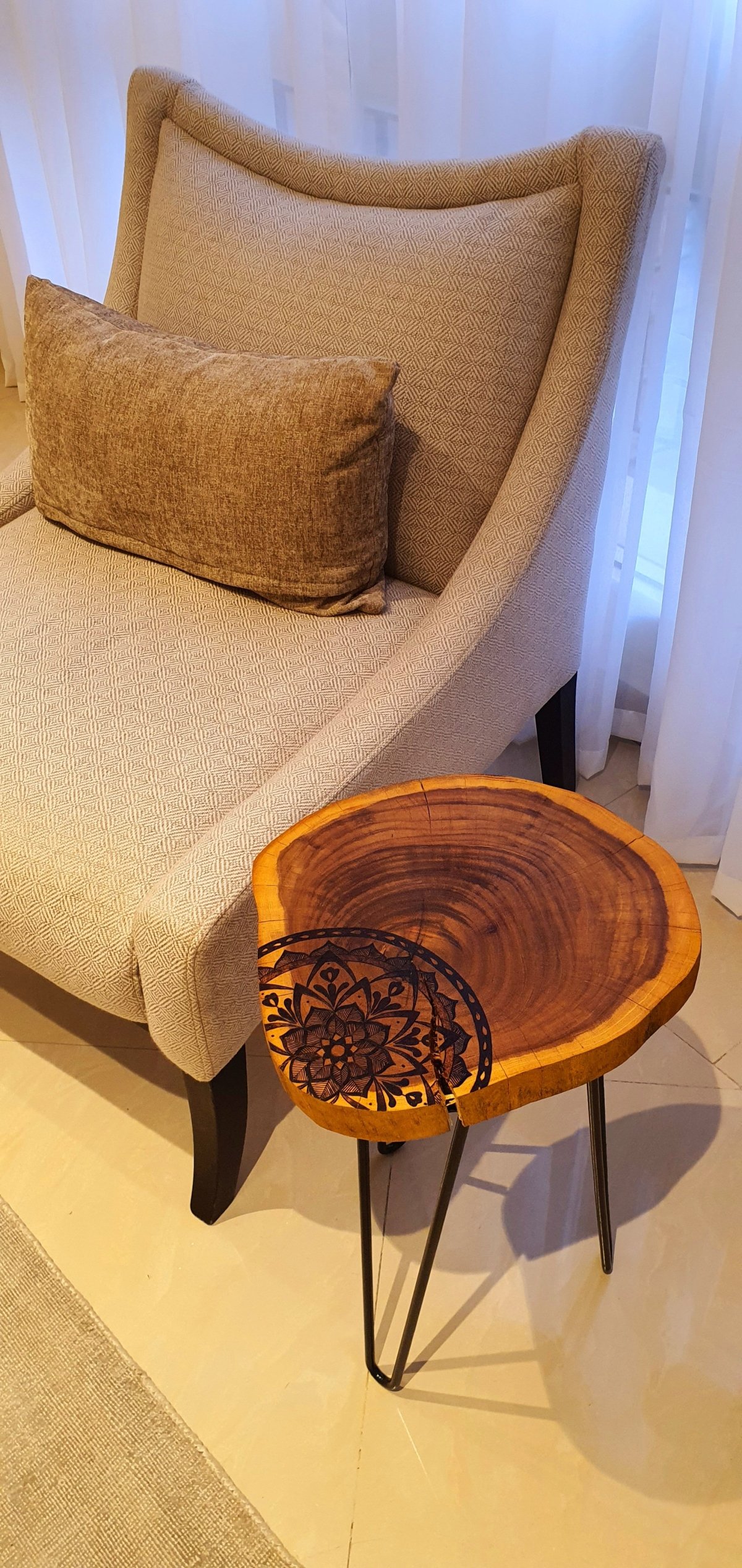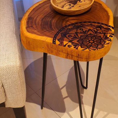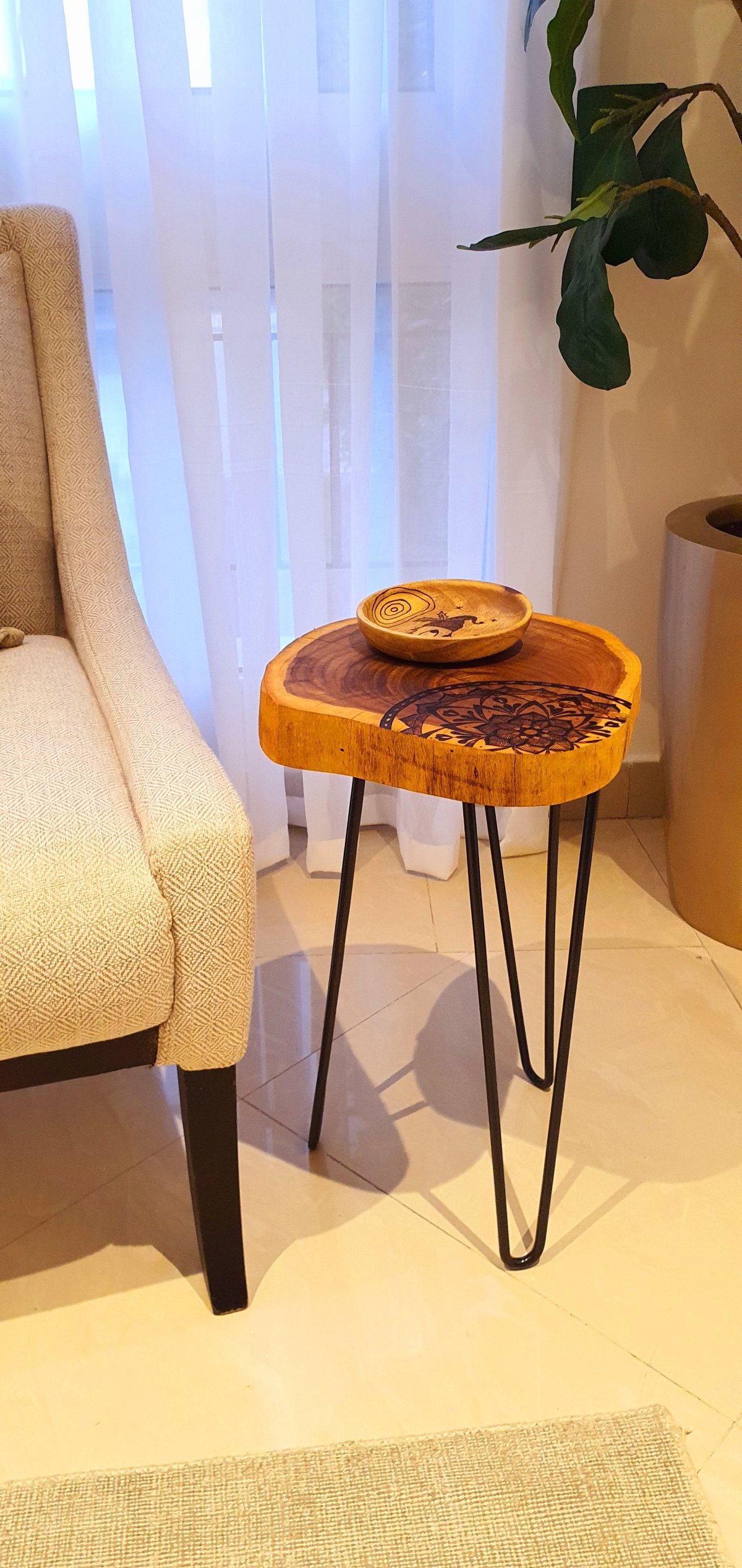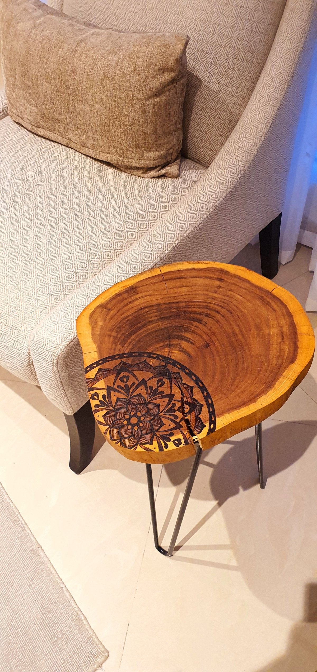 طاولة جانبية مكونة من جذع خشب من شجر التوت، مزين بتصميم فريد، نفَّذناه بفن الحرق اليدوي على الخشب، مع أرجل من الحديد المتين خفيف الوزن. لإضافة لمسة فنية دافئة إلى غرفتك أو منزلك. الأبعاد: عرض ٣٥ سم في ٣٢ سم، سمك ٥ سم، ارتفاع الطاولة ٥٤ سم
