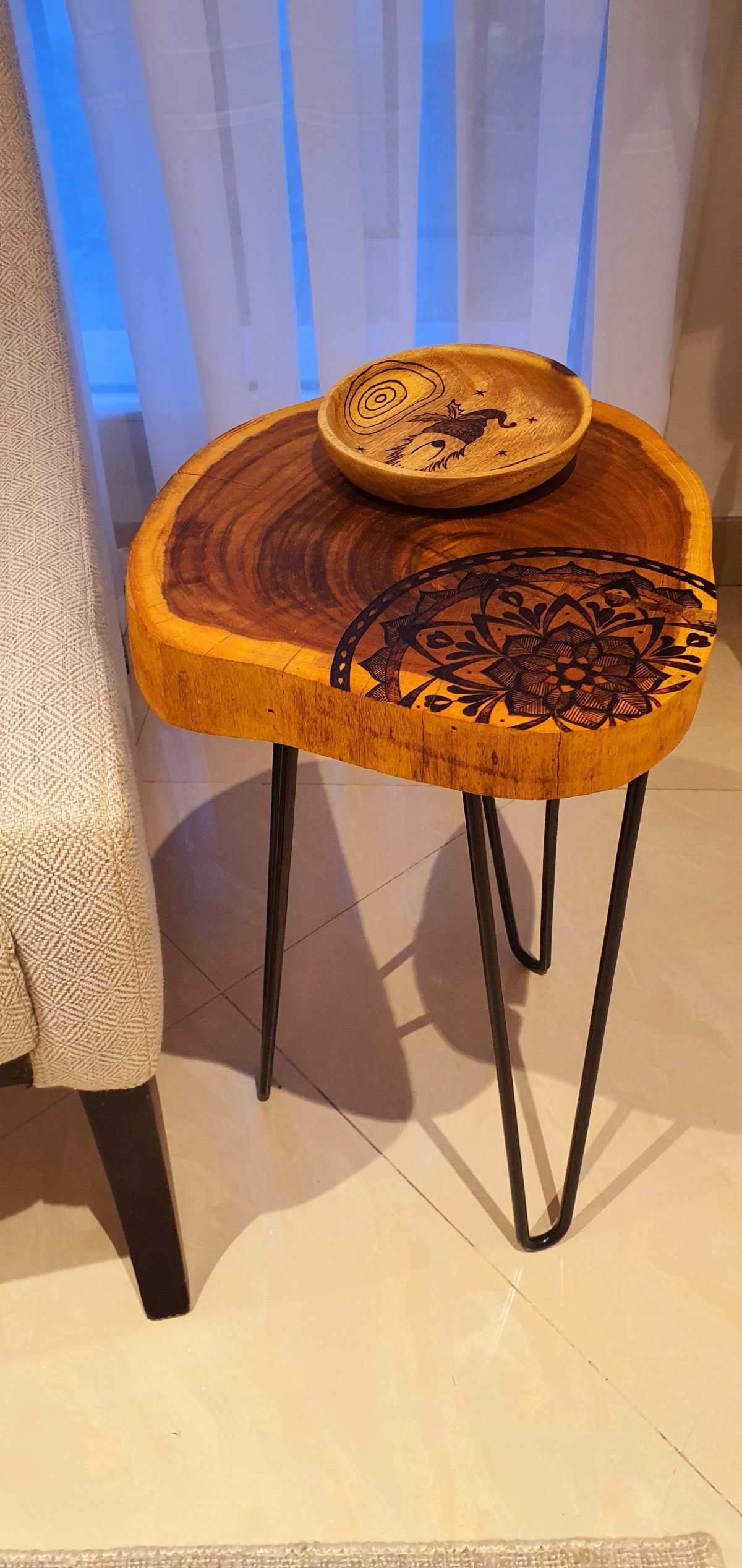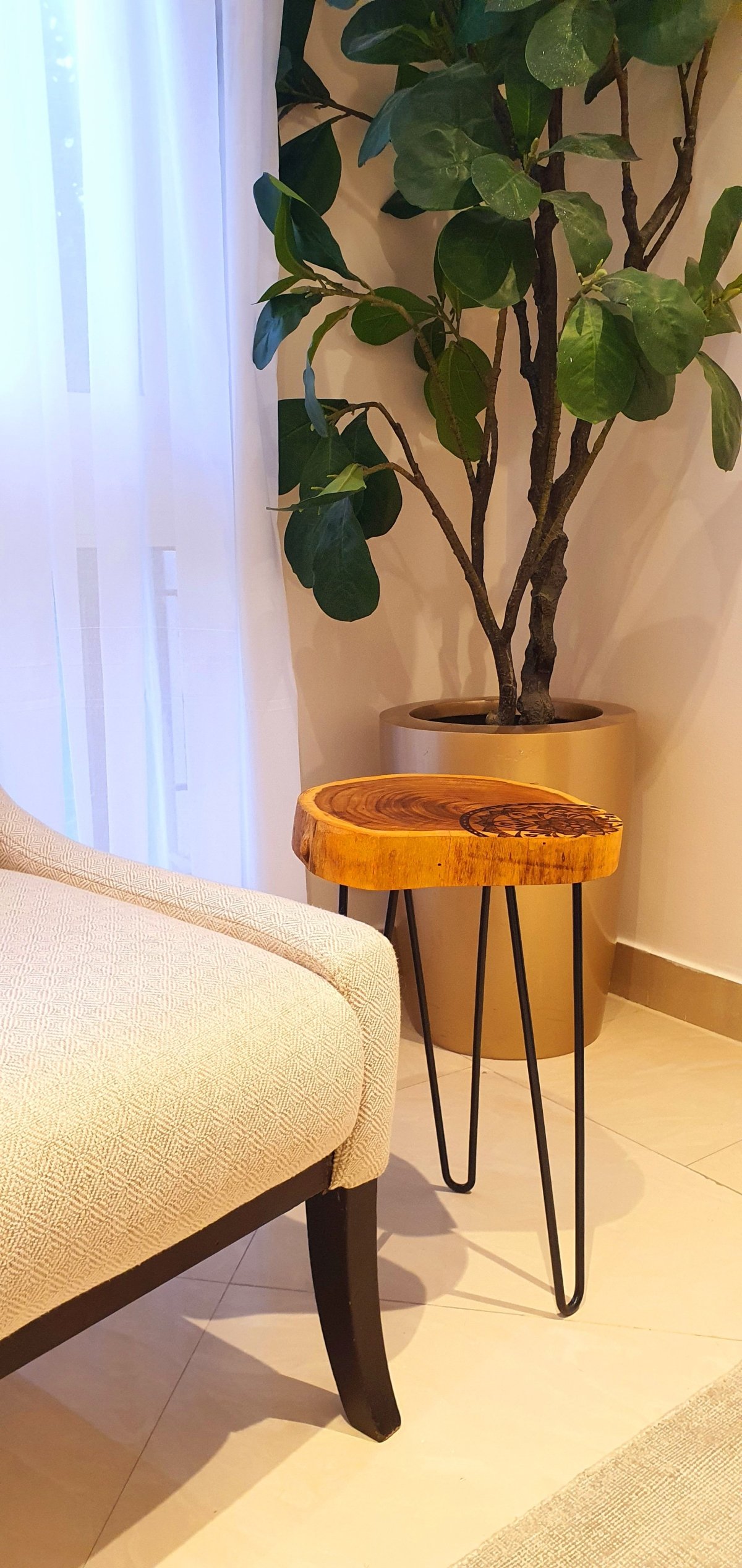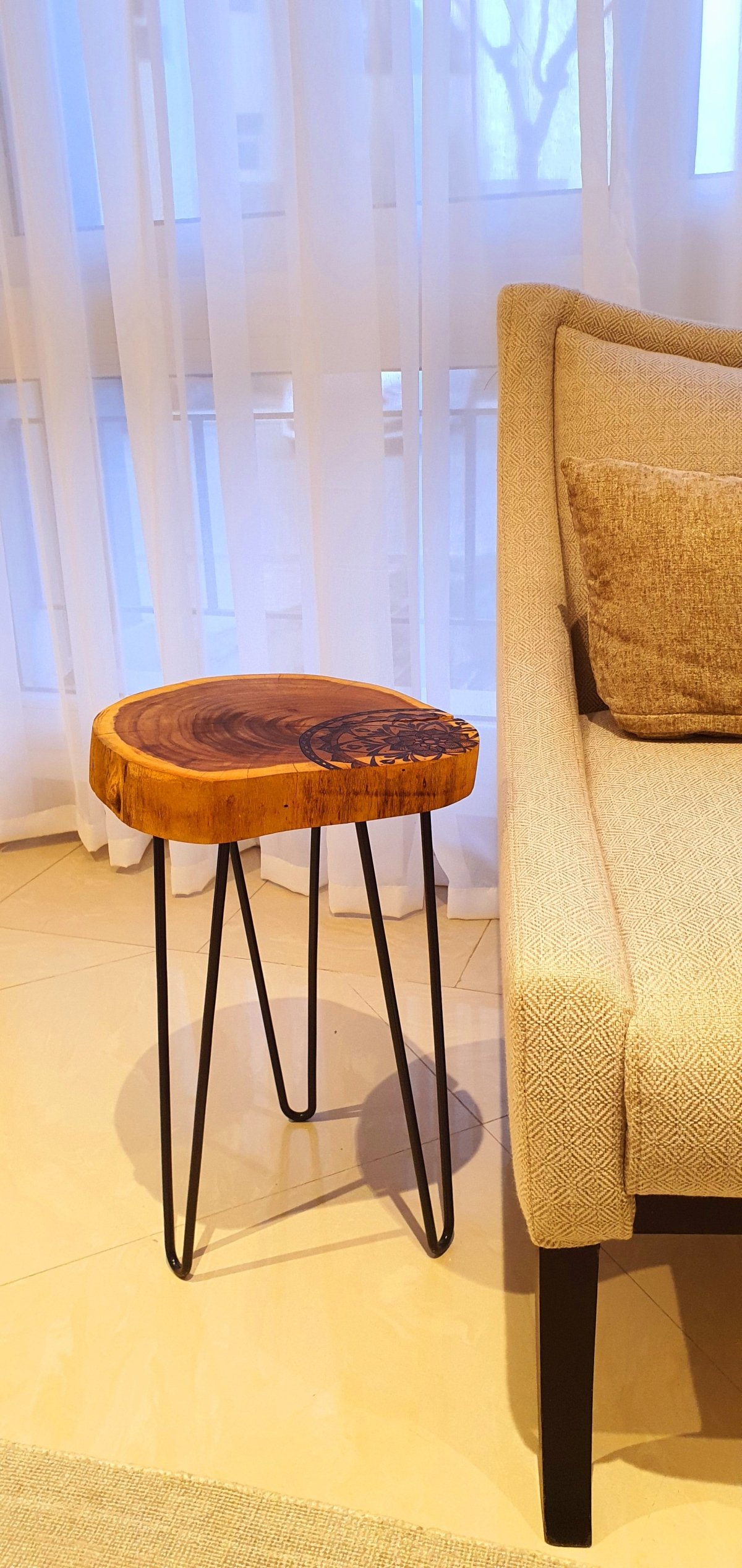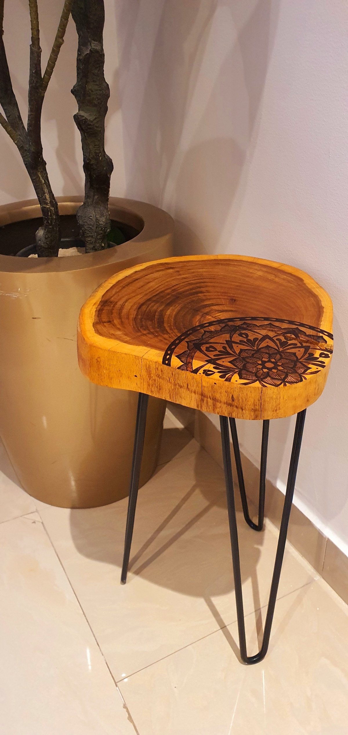 طاولة جانبية مكونة من جذع خشب من شجر التوت، مزين بتصميم فريد، نفَّذناه بفن الحرق اليدوي على الخشب، مع أرجل من الحديد المتين خفيف الوزن. لإضافة لمسة فنية دافئة إلى غرفتك أو منزلك. الأبعاد: عرض ٣٥ سم في ٣٢ سم، سمك ٥ سم، ارتفاع الطاولة ٥٤ سم