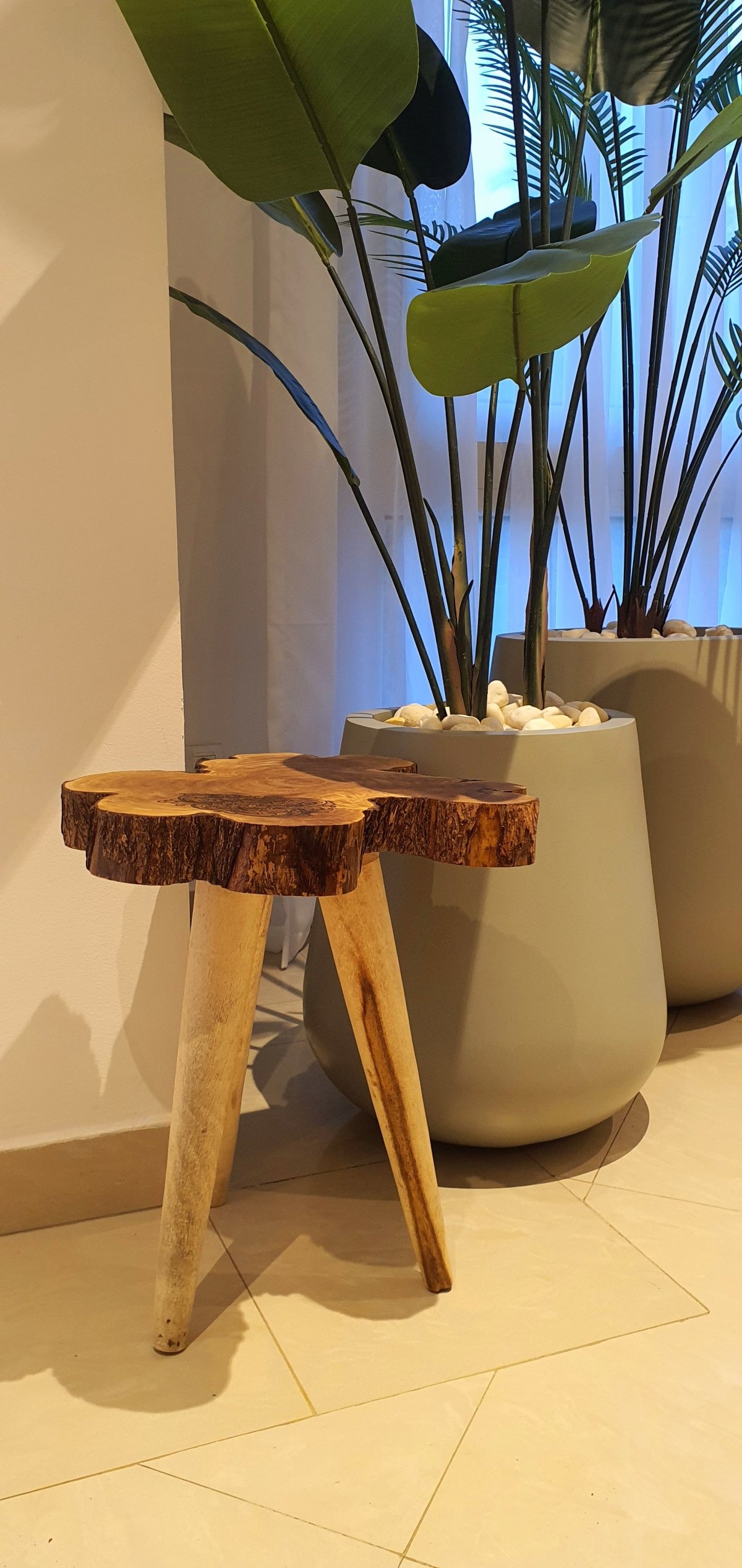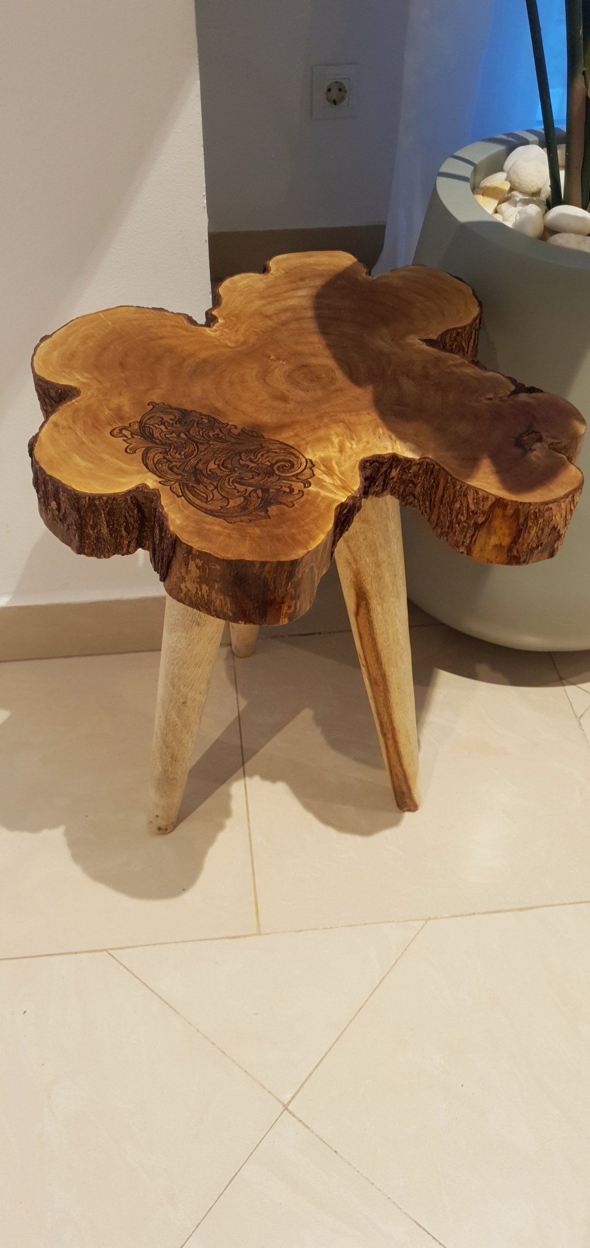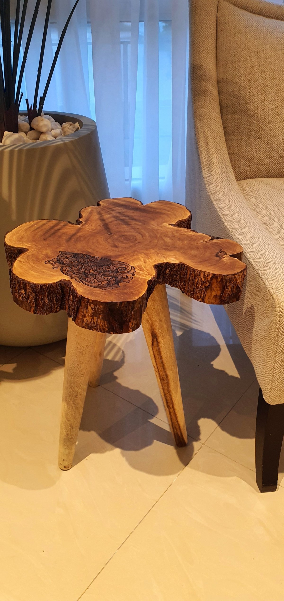 طاولة جانبية مكونة من جذع شجر طبيعي، مزين بتصميم فريد، نفَّذناه بفن الحرق اليدوي على الخشب، مع أرجل من الخشب المتين. لإضافة لمسة فنية دافئة إلى غرفتك أو منزلك. الأبعاد: تقريبًا قطر ٤٤ سم، سمك ٧ سم، ارتفاع الطاولة ٥٠ سم