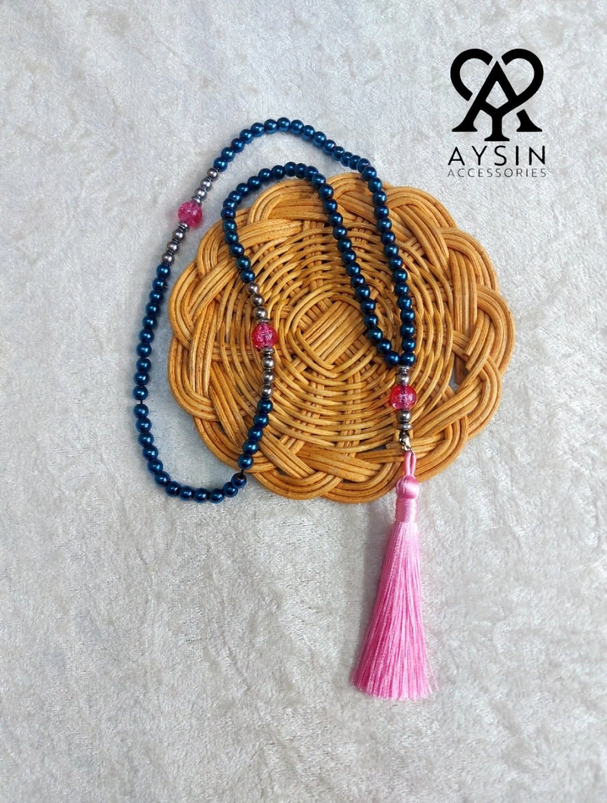 سبحة 99 خرزة من أحجار الهيماتيت مع فواصل من العقيق وشُرّابية من الحرير