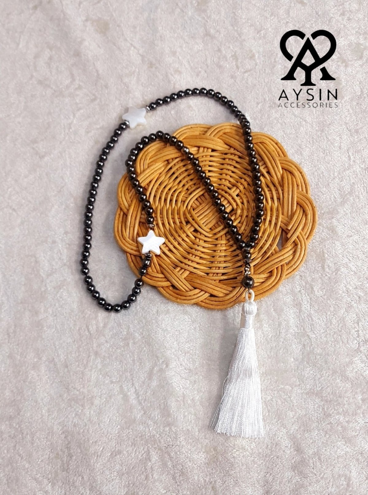 سبحة 99 خرزة من أحجار الهيماتيت مع فواصل من العقيق وشُرّابية من الحرير
