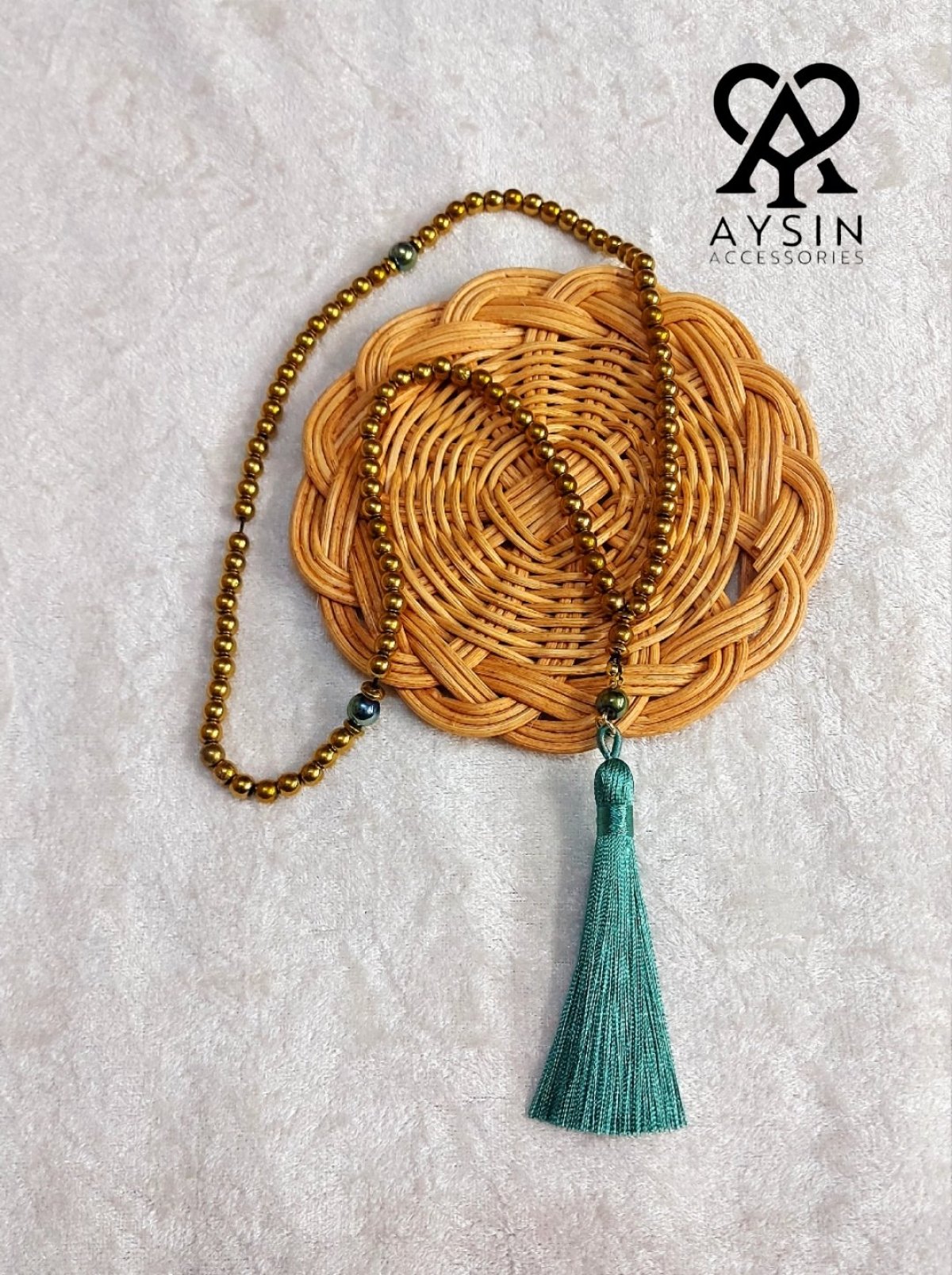 سبحة 99 خرزة من أحجار الهيماتيت مع فواصل من العقيق وشُرّابية من الحرير