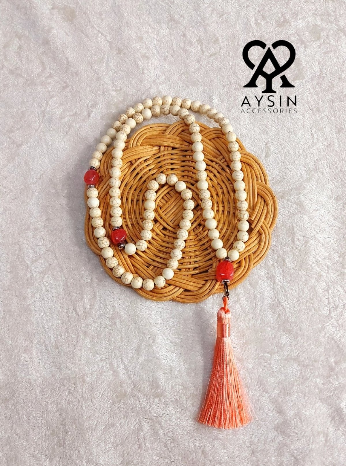 سبحة 99 خرزة من أحجار الفيروز مع فواصل من الهيماتيت وشُرّابية من الحرير.