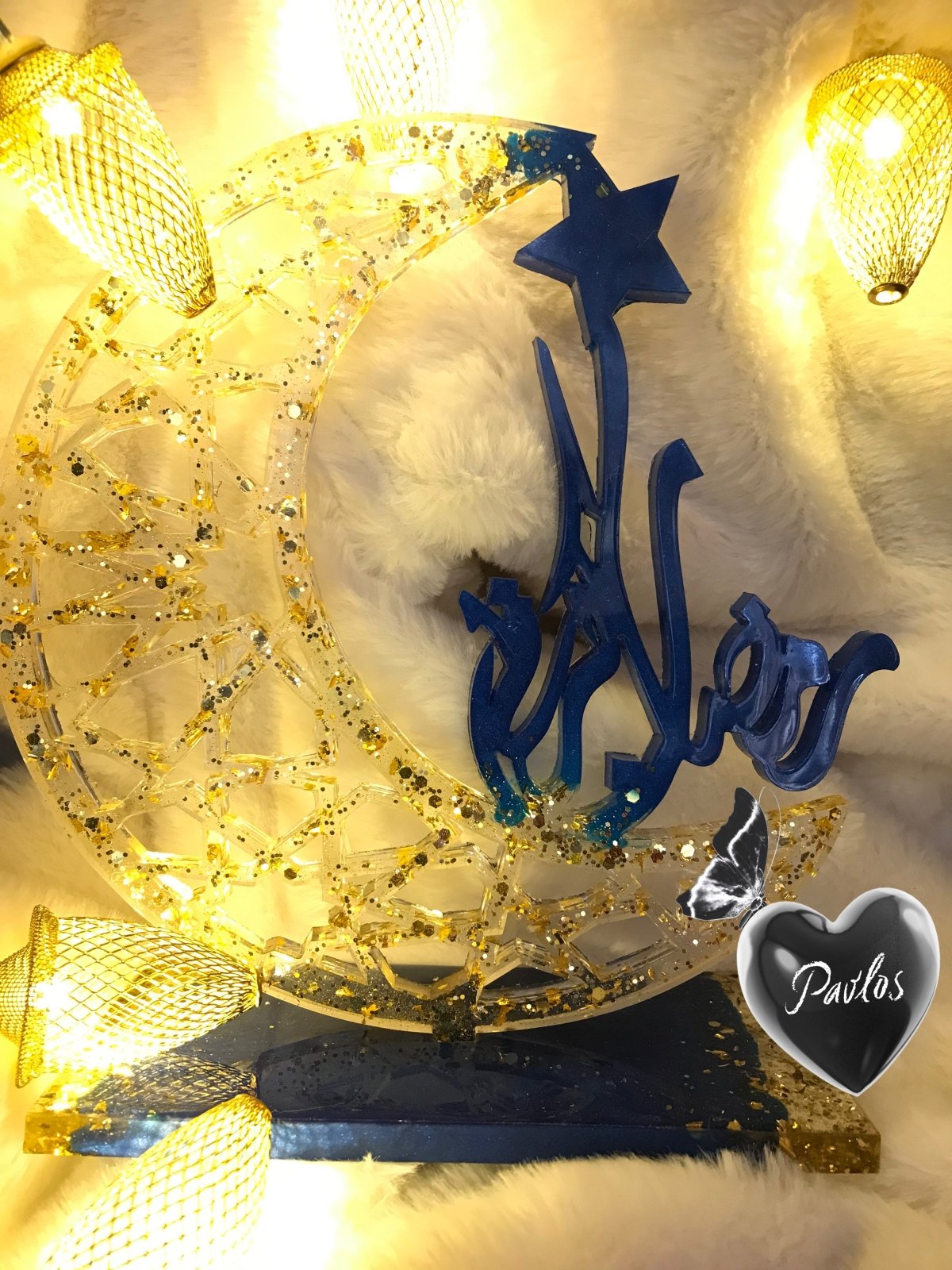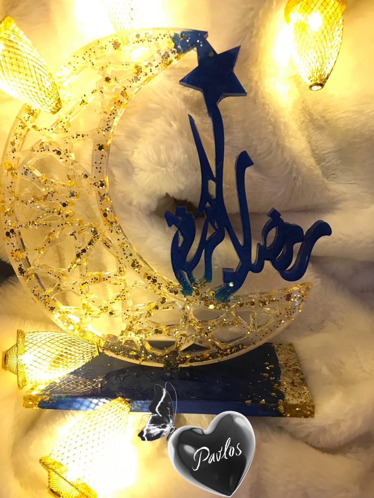 استاند رمضاني ريزن اللون: ازرق ملكي * شفاف + ورق ذهب وجليتر شانكي ذهبي الشكل: القاعدة مستطيلة الاستاند علي شكل هلال مع نجمة وكلمة رمضان كريم متاح تسليم فوري•