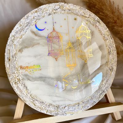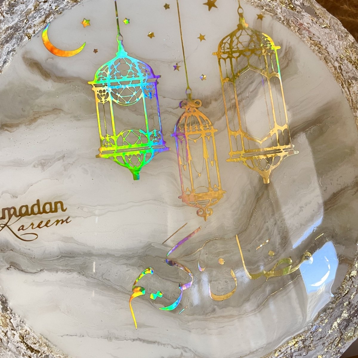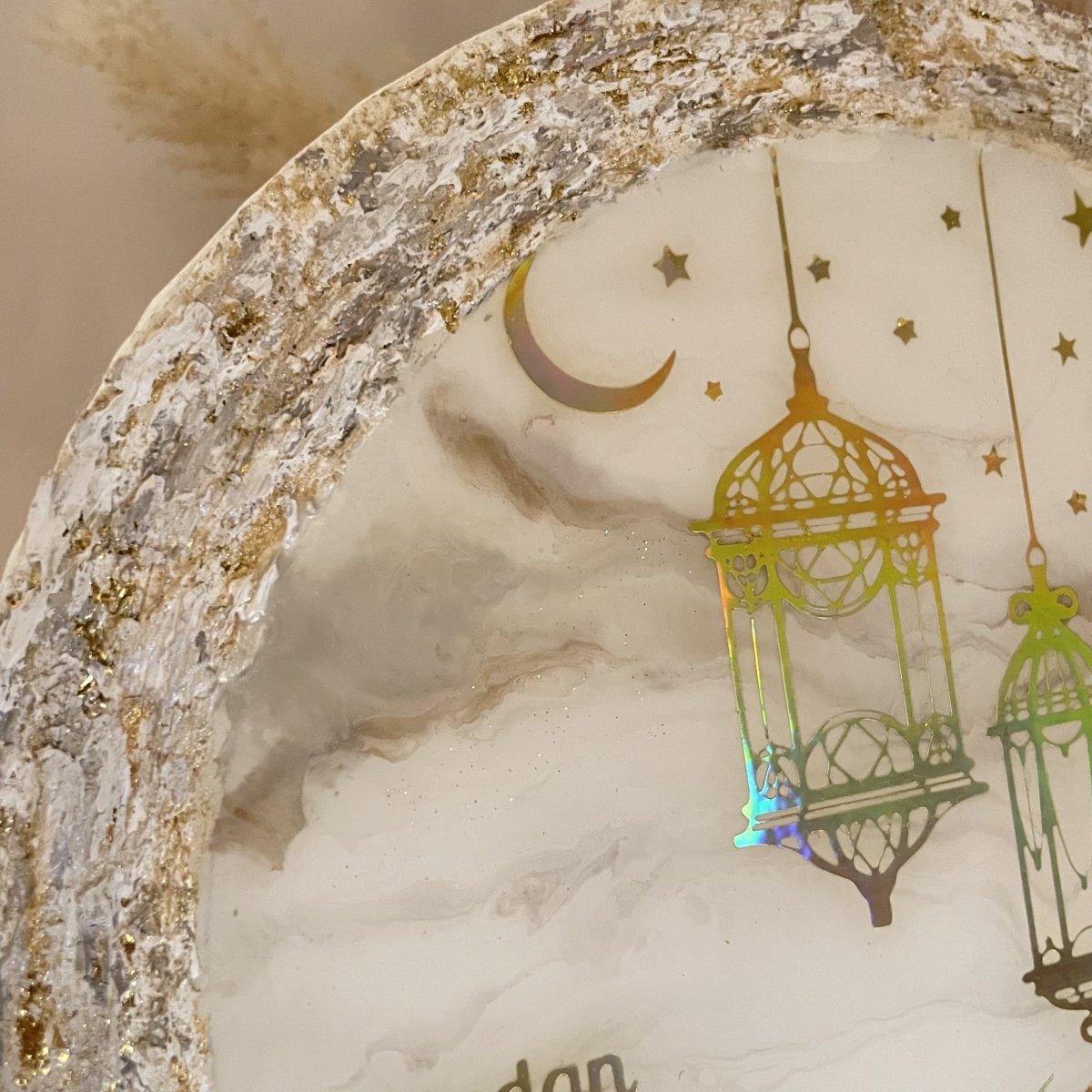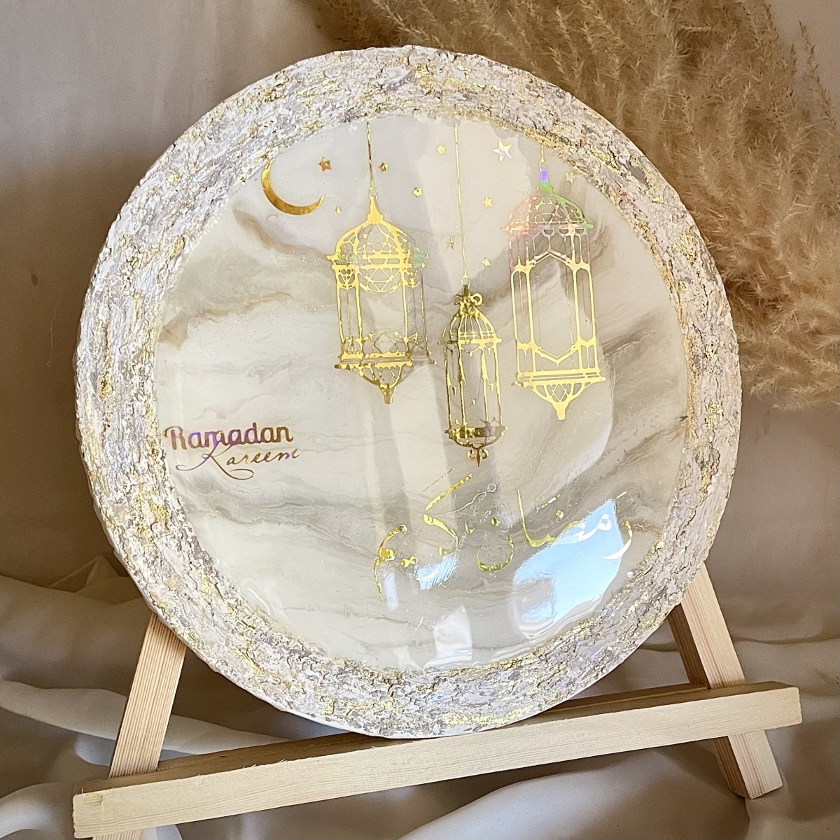 تابلوه رمضان كريم على كانفاس مع إضاءه الفوانيس باللون الابيض والدهبي ، مقاس ٢٧ سم