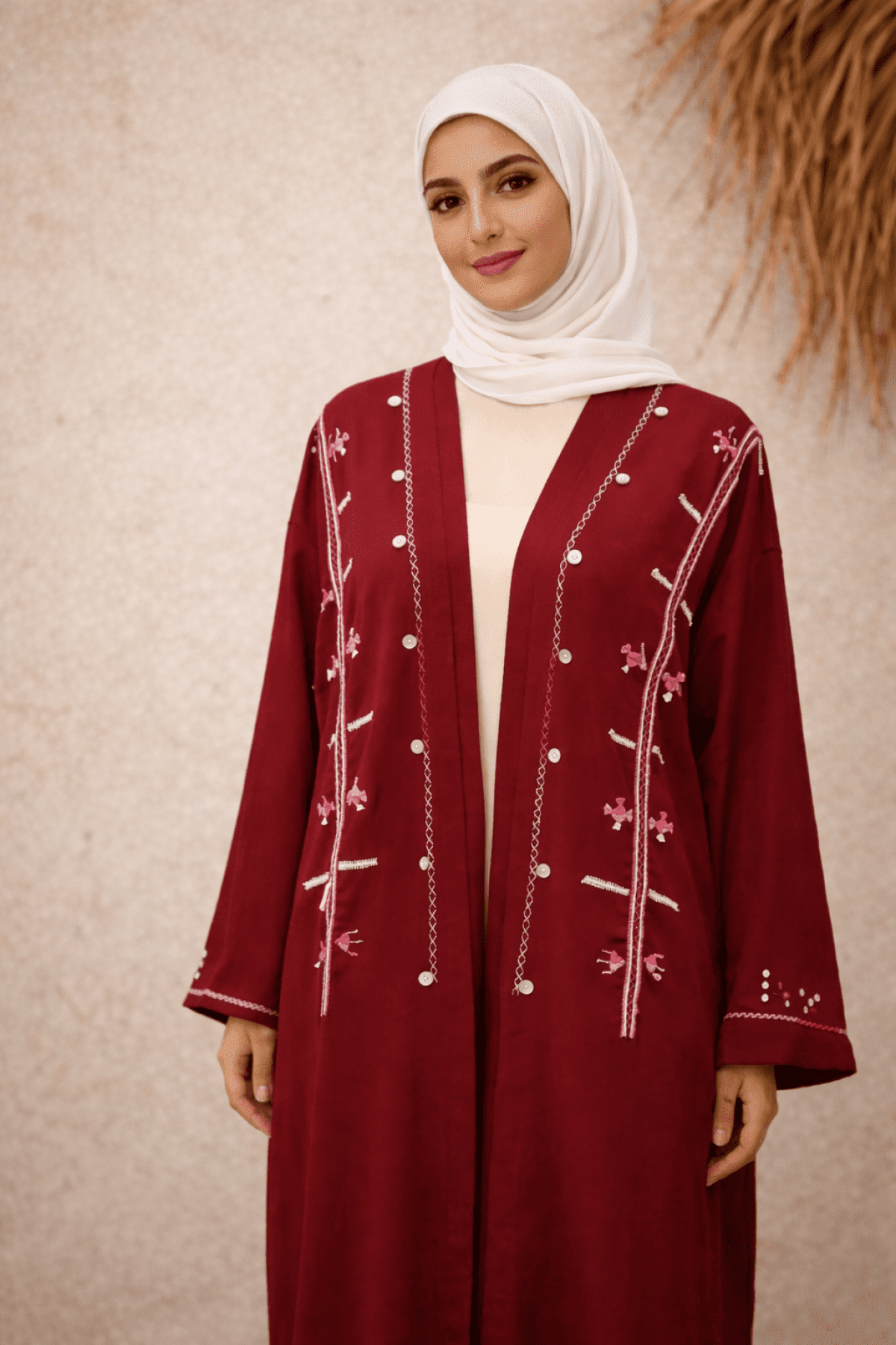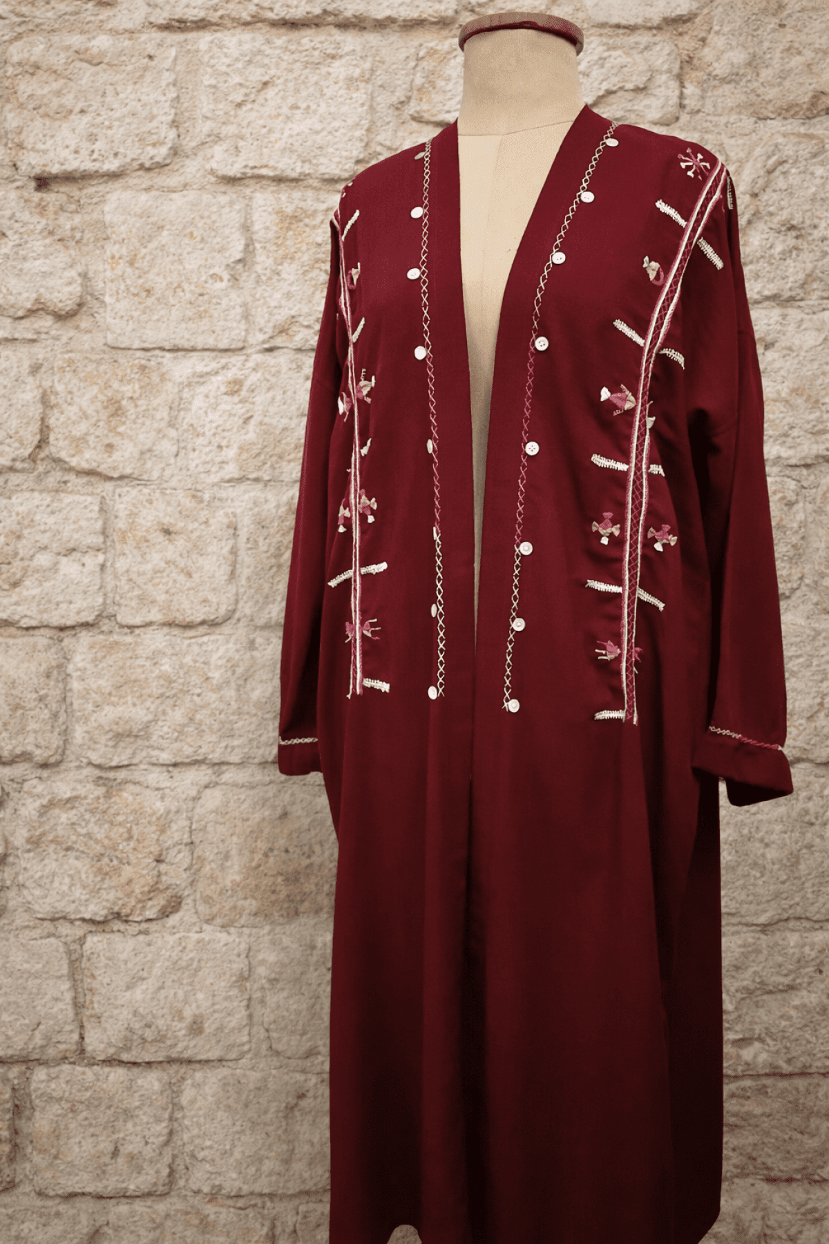 قفطان من الكتان، مطرز يدويًا على يد نساء واحة سيوة. مستوحى من تراث سيوة. لون عنابي. مقاس واحد يناسب من M إلى XL. الطول 115 سم، العرض ٧٠ سم.