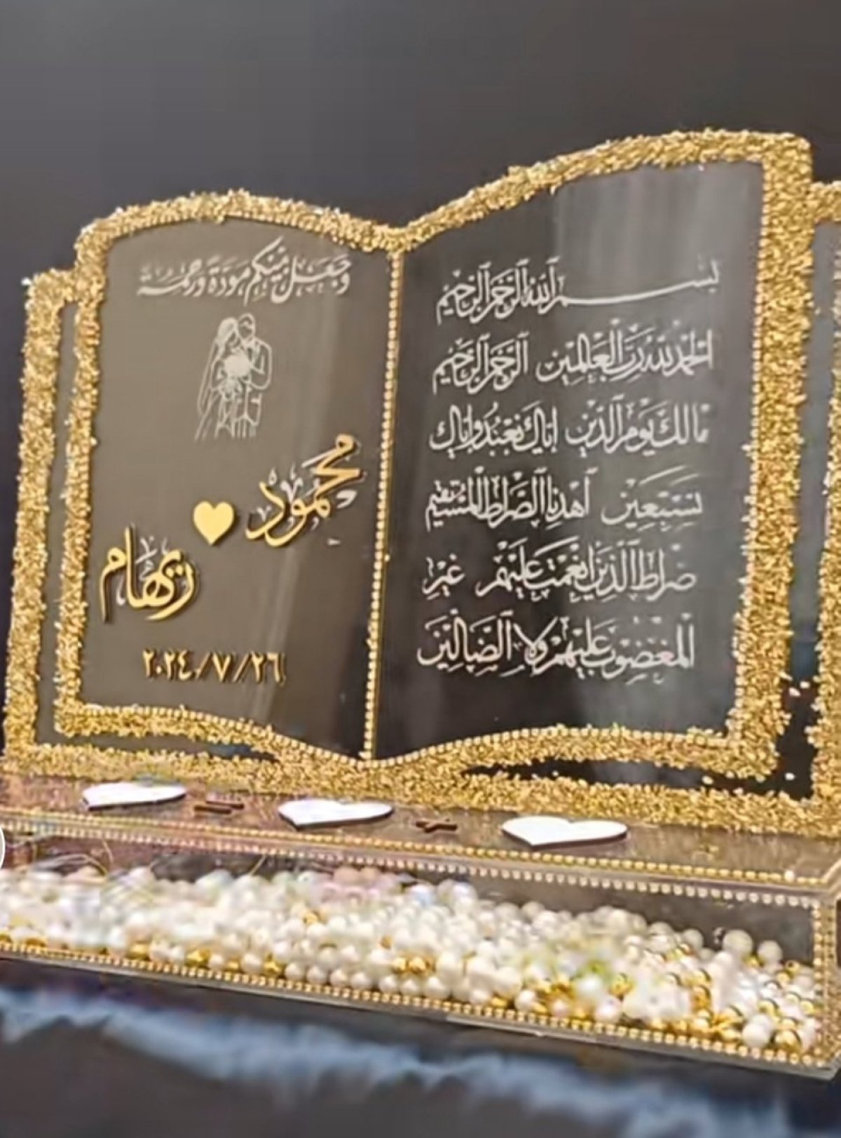 من القطع التي لا غني عنها للعروسه ممكن تكون بصمة كتب كتاب او صينية شبكه لتقديم الدبل مصنوعه من الاكليريك ومزينه بالكامل من فروع الالماظ وبداخل الصندوق قطع من اللولي والاكليريك الوردات وايضا بها وحدة اضاءه لانارة البوكس من الداخل