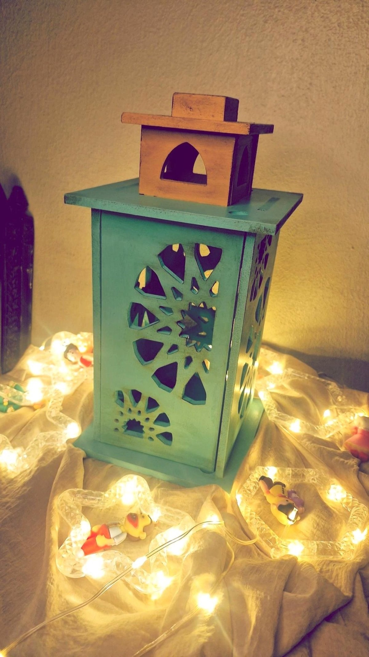 فانوس رمضان بألوان زاهيه وتعتيق بسيط من لون بني والنحاسي ارتفاع ٣٢