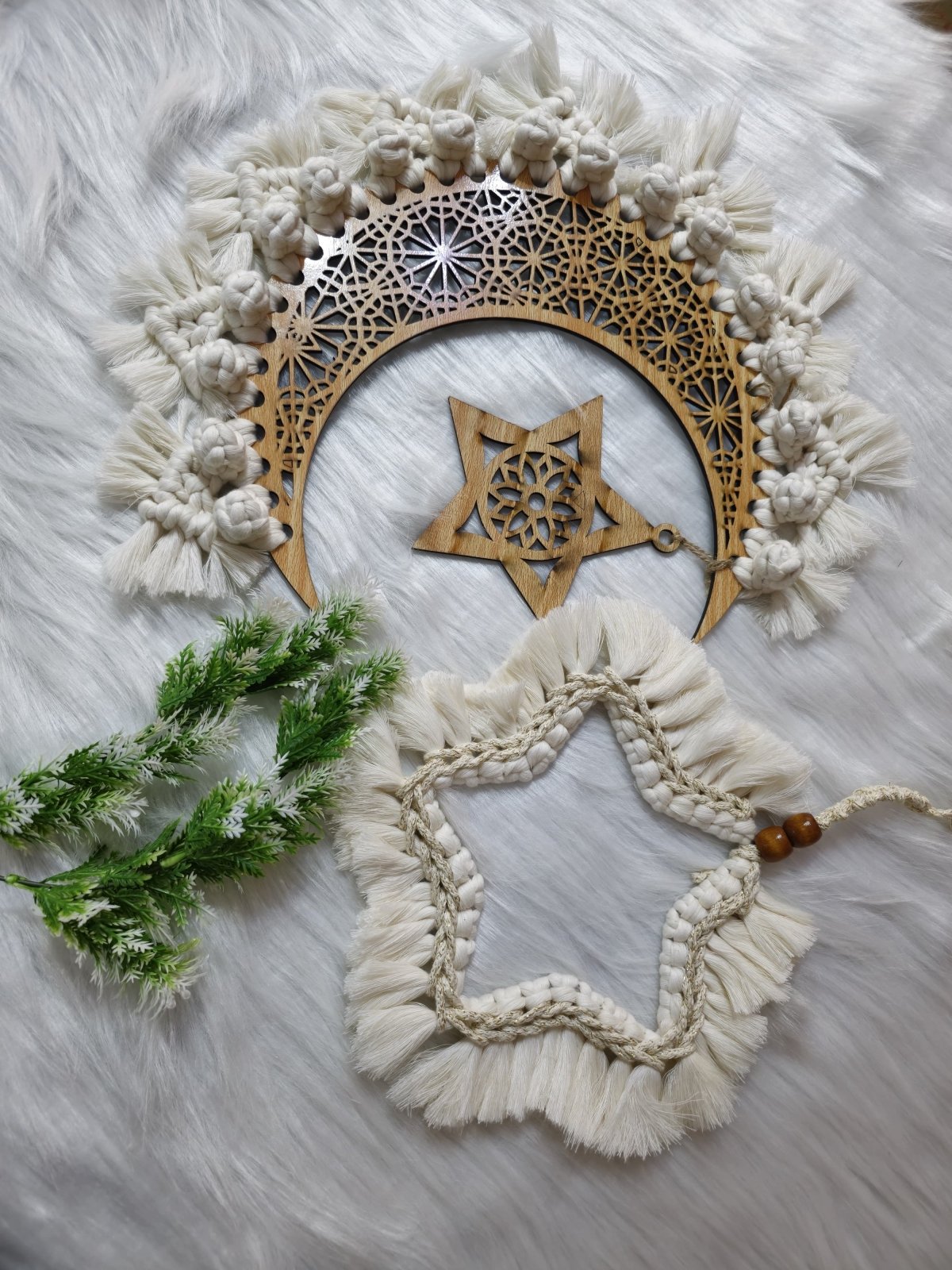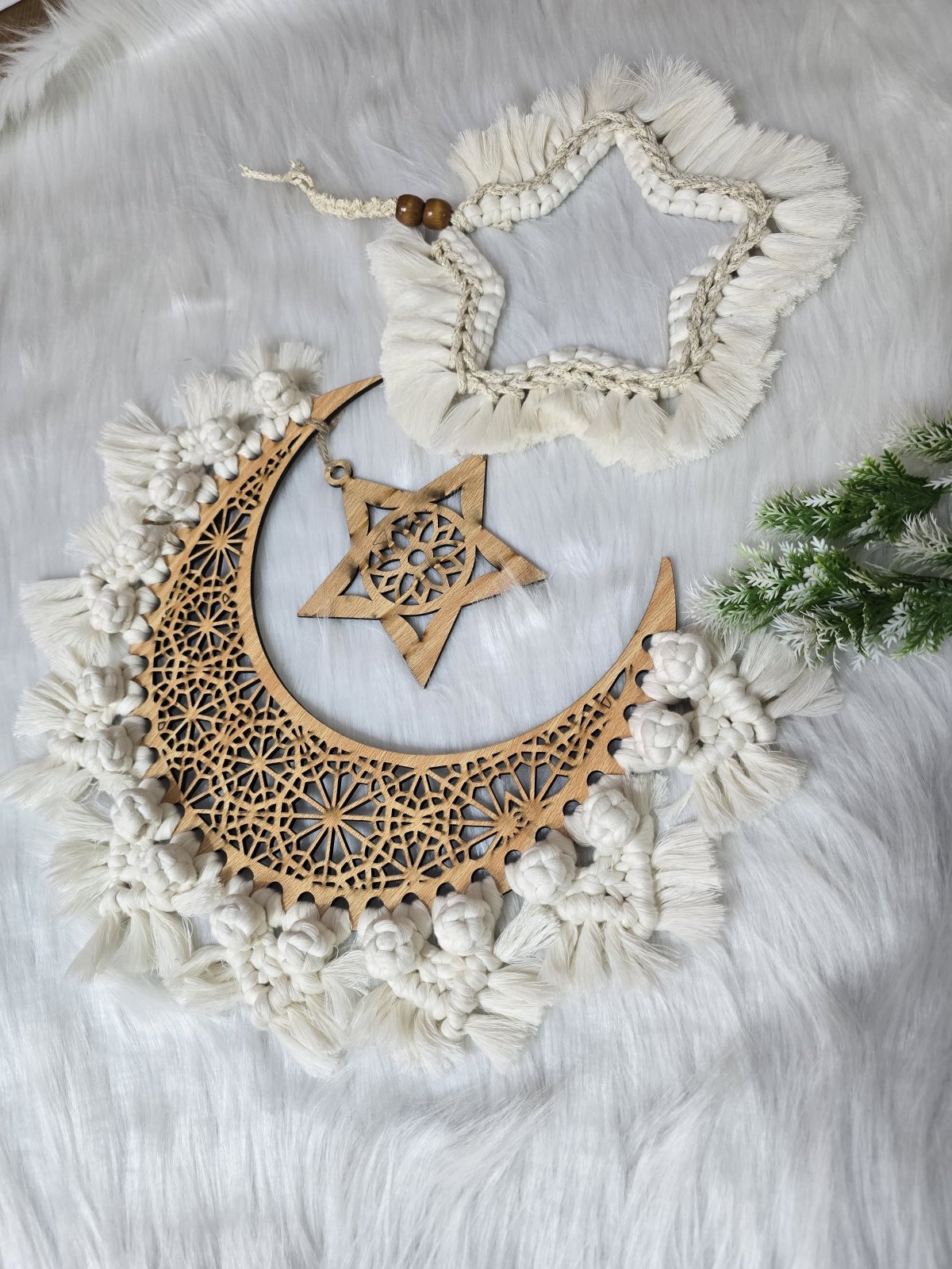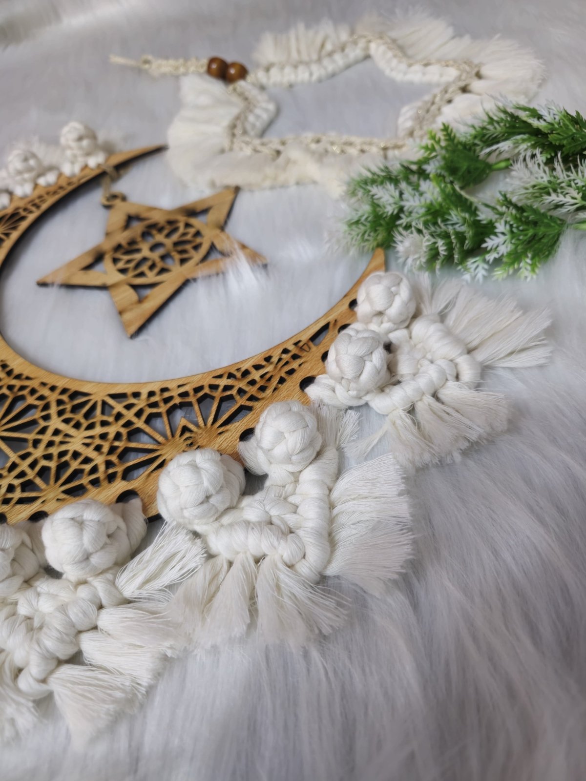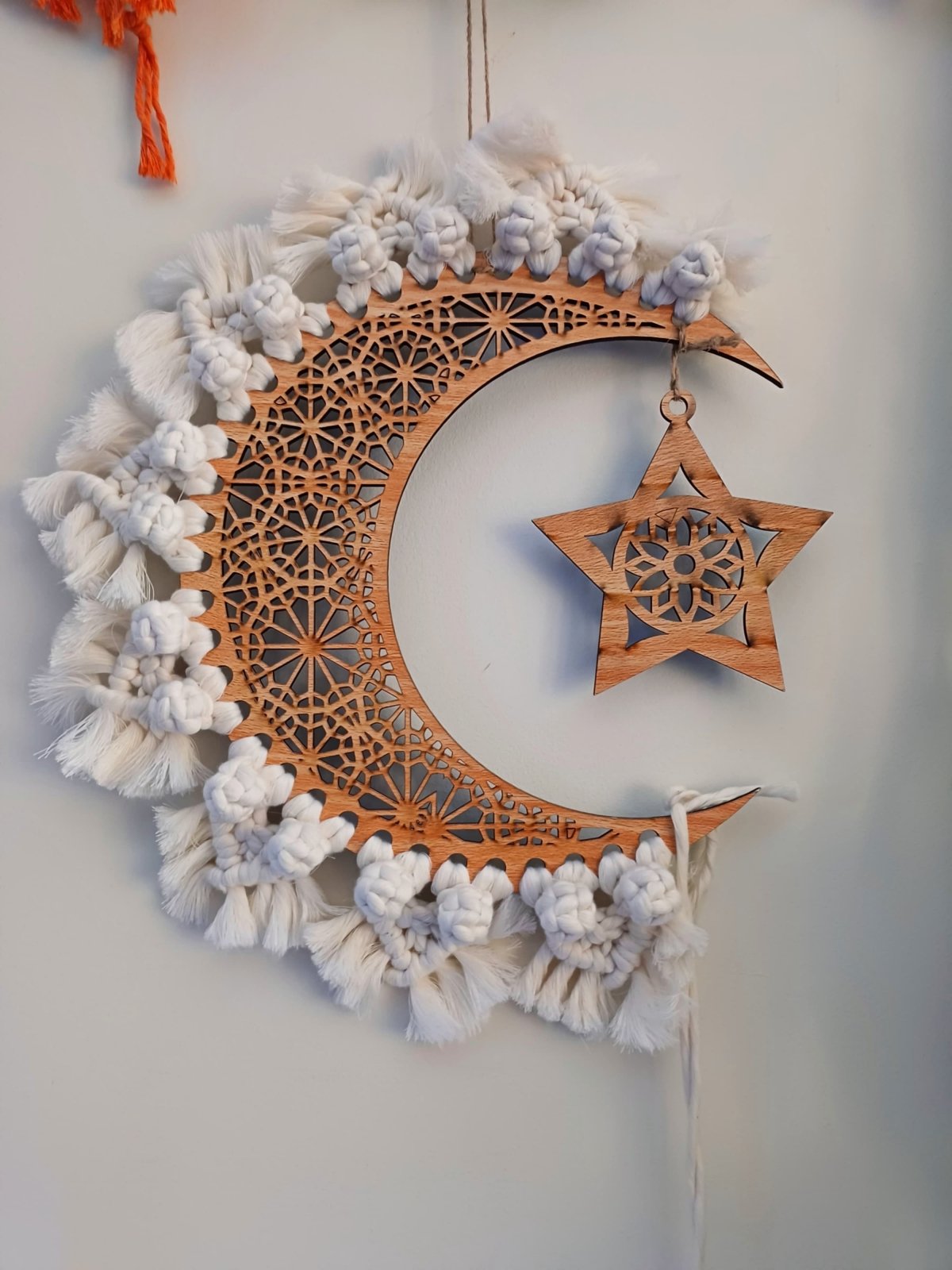 هلال رمضان مع هيكل خشبي بخيوط كوردون قطنية باللون العاجي متوفر بأي لون مع كشاف ليد للإضاءة المقاس: 25 سم