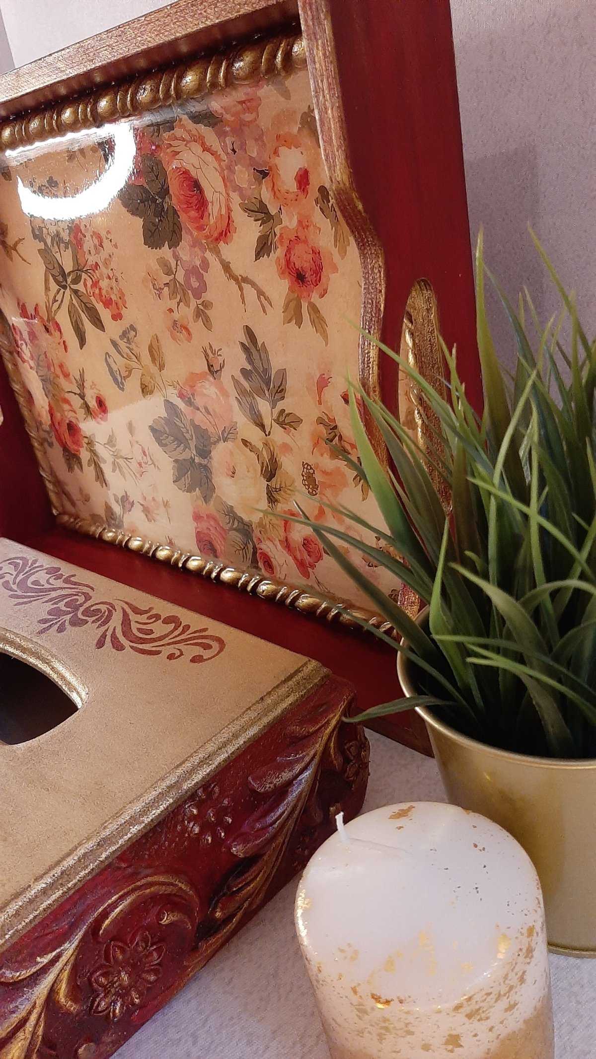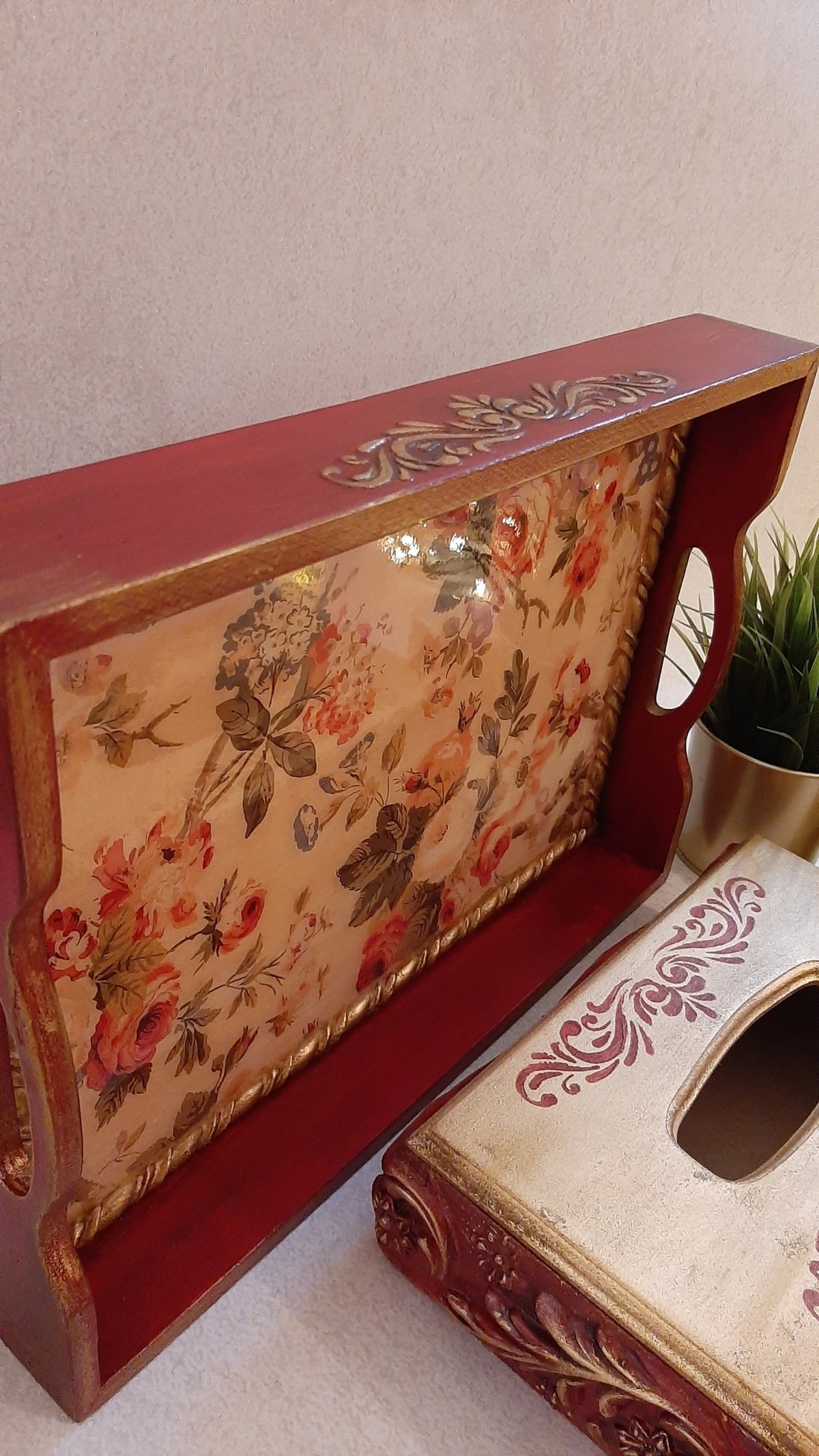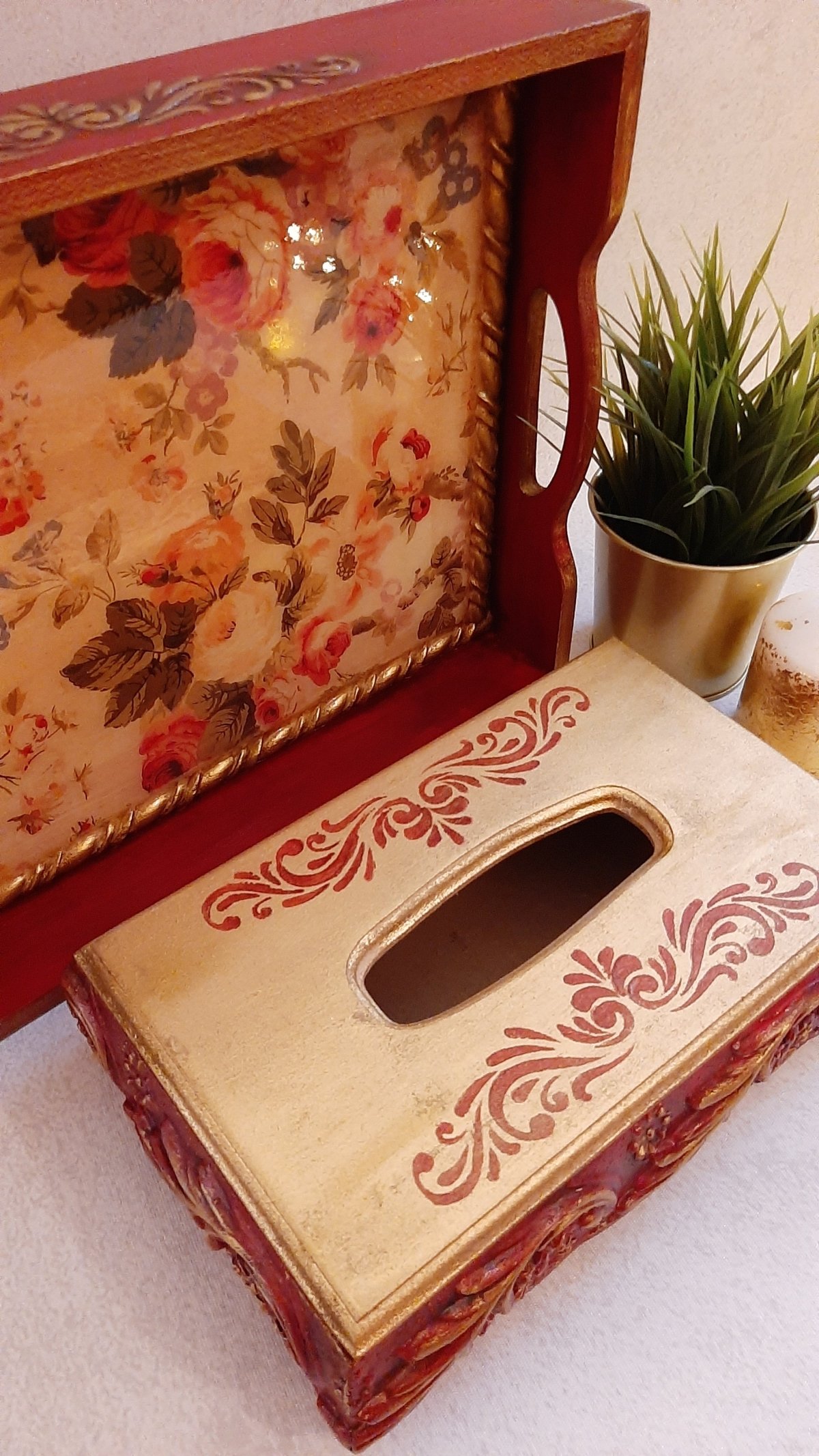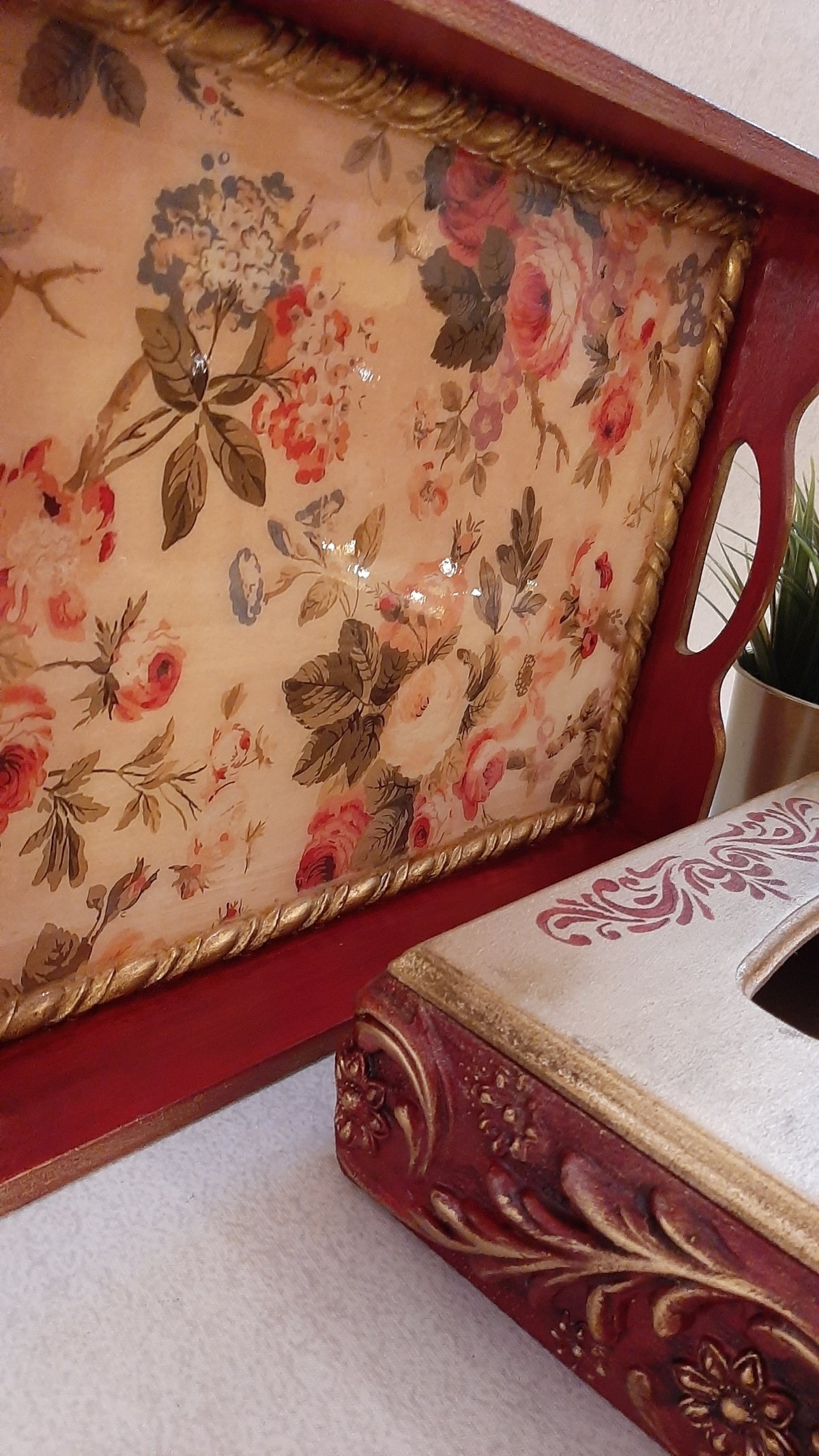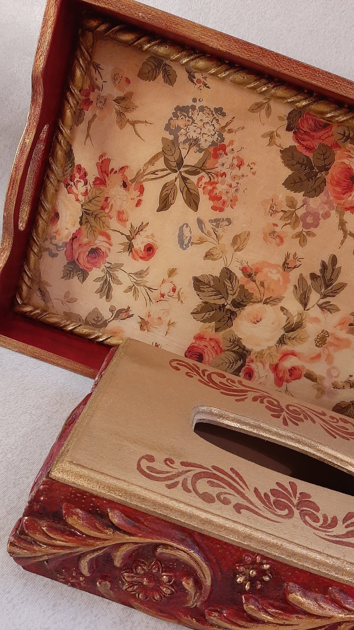 طقم صينية خشب ديكوباج خشب أم دي أف مستطيلة مع علبة مناديل كبيرة المقاسات مرفقة في الصور صناعة يدوي 100% مع طبقة حماية ضد الماء