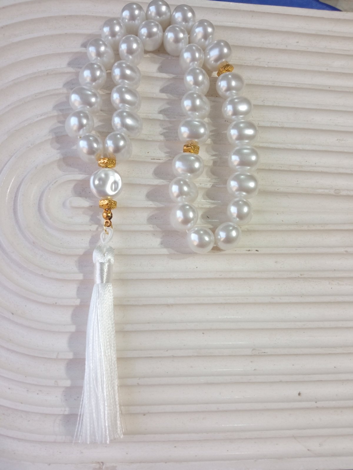 سبحة 33 حباية من اللؤلؤ المايوركا مع فواصل دهب صيني و شرشوبة حرير
