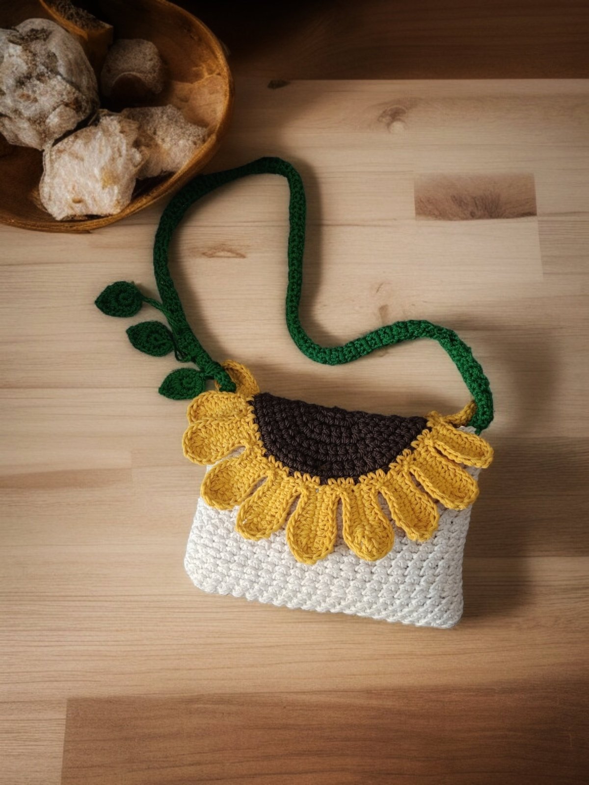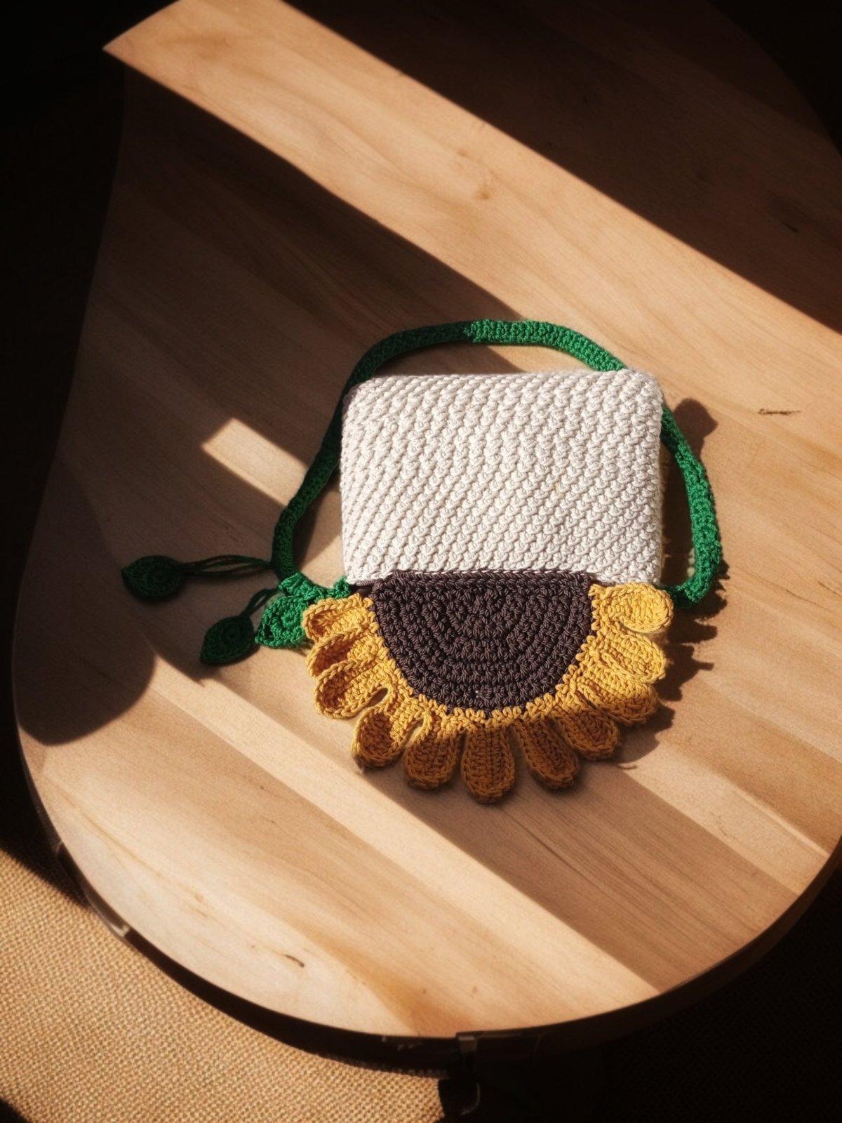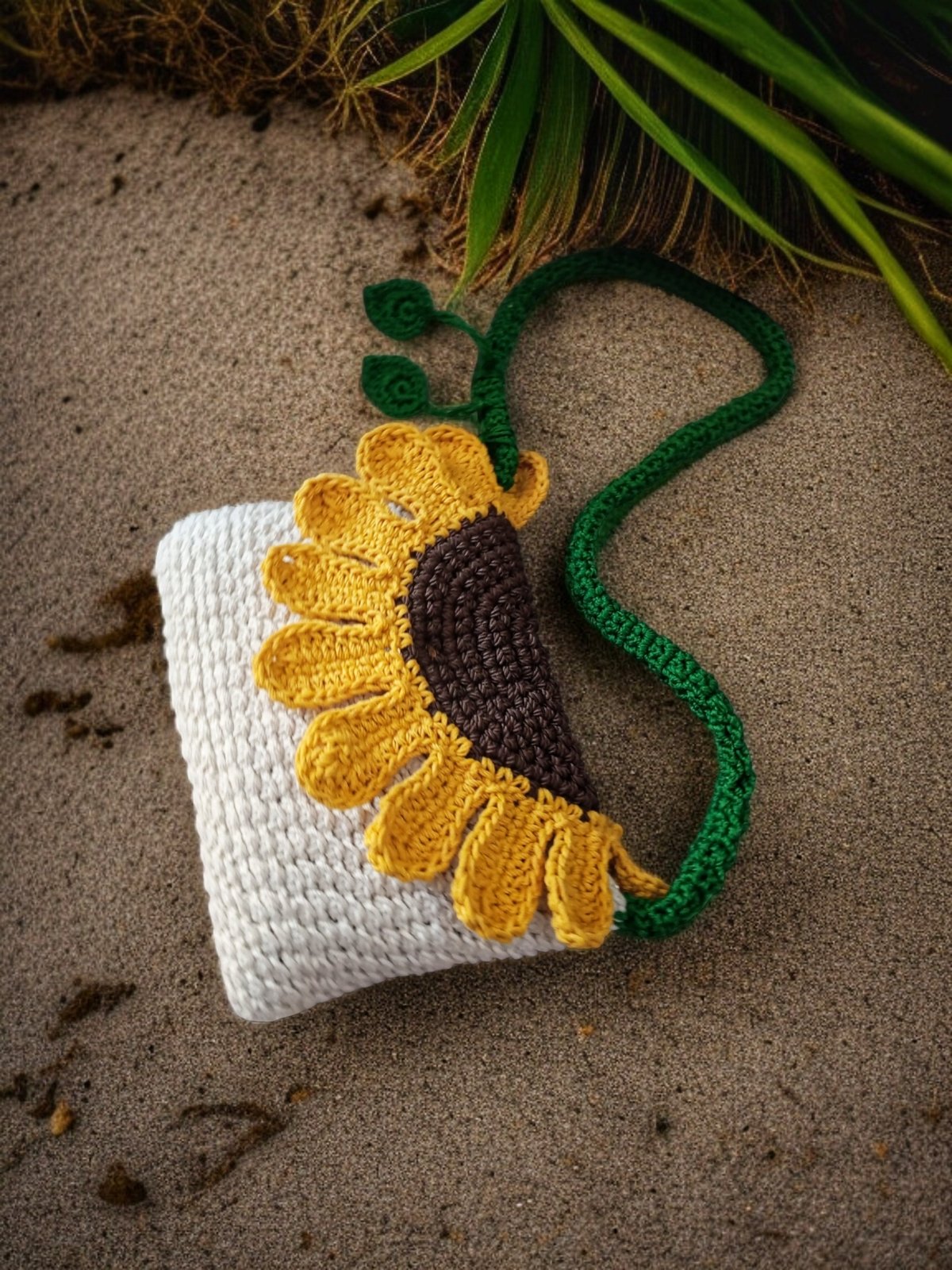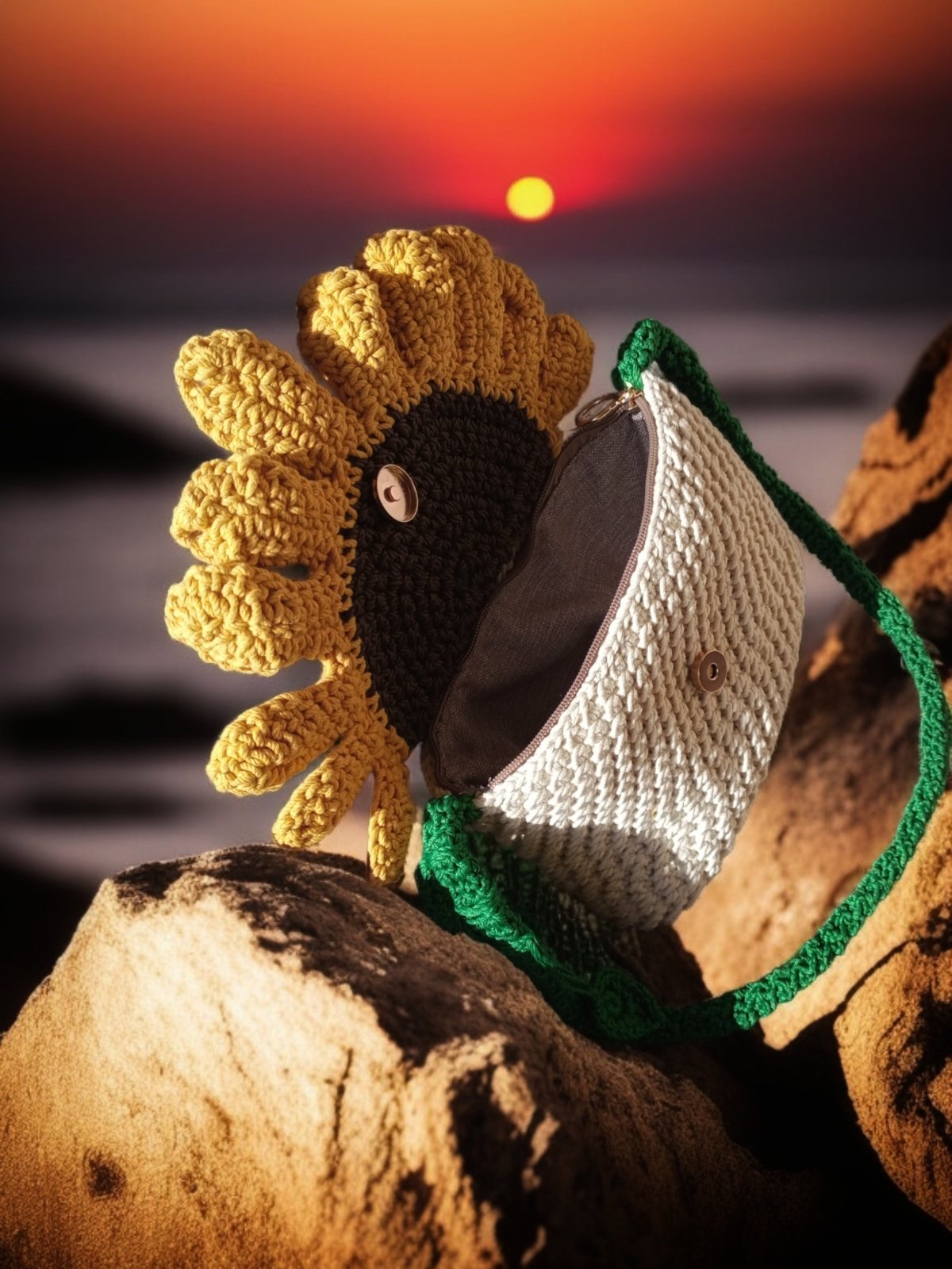 حقيبه كروشيه صنعت يدويا من خيوط القطن البيور لها قلاب بمغناطيس علي شكل ورده عباد الشمس مبطنه من الداخل ببطانه كتان ولها سوسته ودراع كروس مقاس ٢٥/15