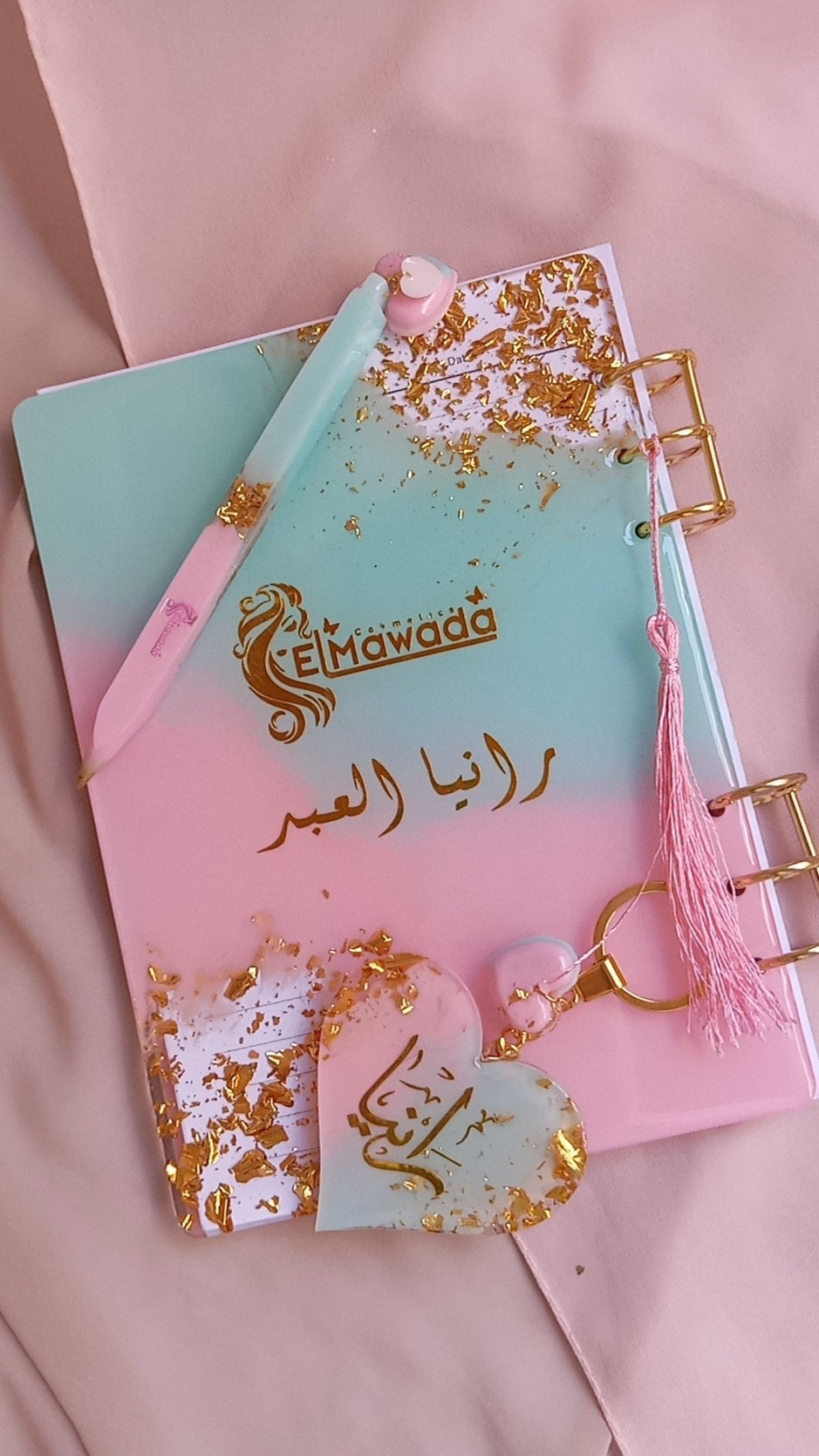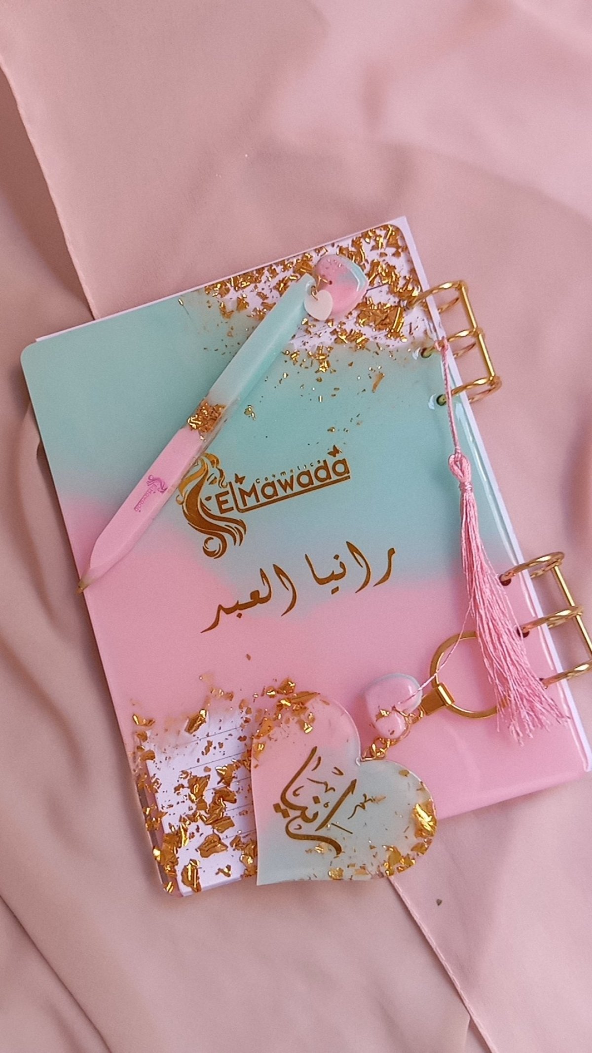 نوت بوك من الريزن A5 مع قلم من الريزن قابل لتغير الانبوبة مقاس 21*15 بالالوان البينك والتريكواز مع ورق الذهب حلقات معدنية باللون الذهبى النوت بوك قابل لتغيير الورق