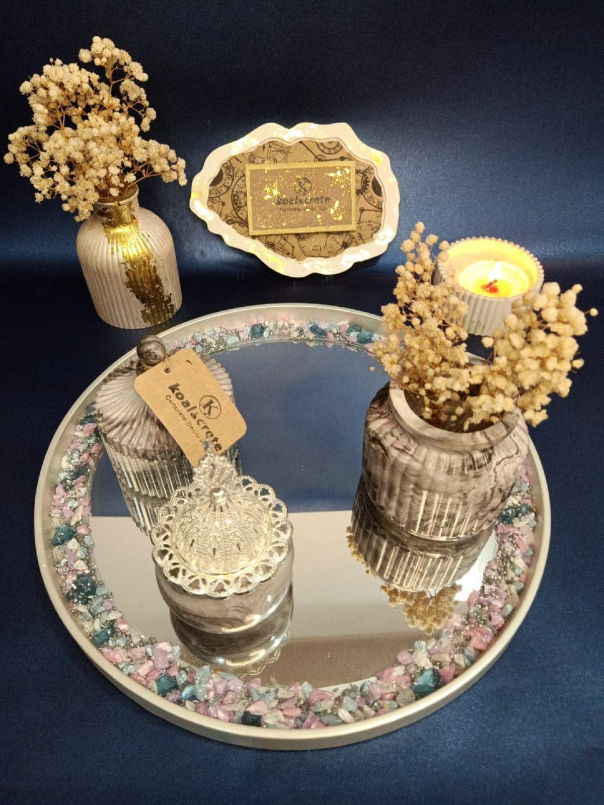 طقم كونكريت بتصاميم عصريه يباسب كل الازواق وديكورات المنازل الحديثه يجمع الرقى والفخامه والتميز فى ان واحد مكون من٤ قطع صينيه قطر ٣٠ سم مزوده ب مرايه واحجار قطعه بنبونيره وفازه ومبخره من الاستالنلستيل والكونكريت